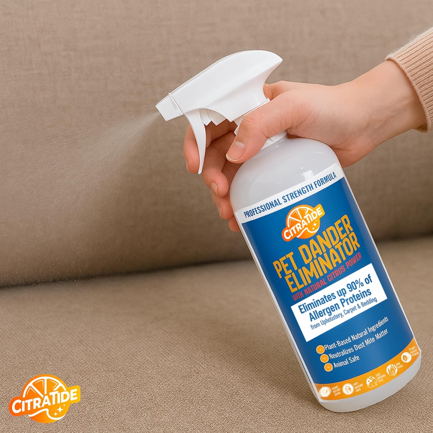 About this item 1️⃣ Breaks Down Dander & Allergens Naturally Removes pet dander and dust mite particles at the source with hydrogen peroxide and citrus-derived cleaning agents. 2️⃣ Reduces Odors & Freshens Fabrics Eliminates lingering smells from pet hair, bedding, and upholstery without synthetic fragrance or masking scents. 3️⃣ Gentle, Safe & Non-Toxic Formula Made with purified water, hydrogen peroxide, citric acid, and mild plant-based surfactants — safe around pets and kids. 4️⃣ No Residue, No Irritation Leaves surfaces fresh and clean without film or irritation. Ideal for sensitive households and allergy-prone families. 5️⃣ Proudly USA Made & Eco-Friendly Biodegradable, cruelty-free, and crafted in the USA with sustainably sourced ingredients. › See more product details