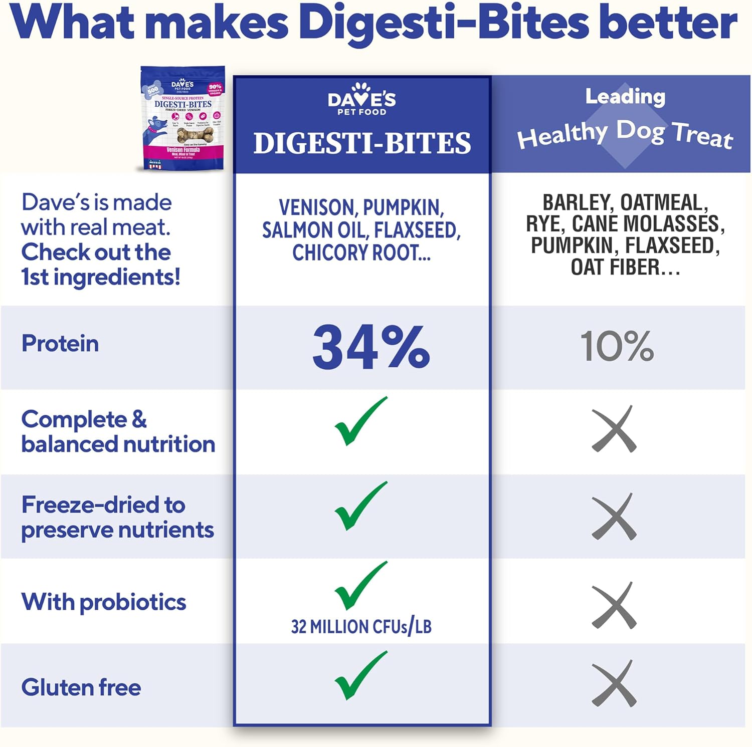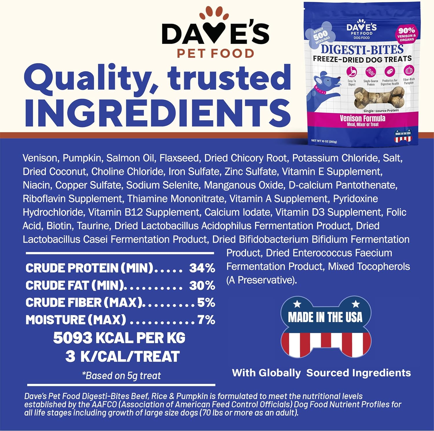 About this item SINGLE SOURCE PROTEIN. Frozen at its optimal freshness, this power packed real meat dog treat is high in freeze dried, nutrient dense protein. Venison is the #1 ingredient. EASY-TO-DIGEST TREATS WITH PROBIOTICS FOR GUT HEALTH. Fiber-rich pumpkin soothes upset tummies and is great any time as pumpkin dog treats, or during diarrhea or constipation. Live probiotics for dogs digestive health and chicory root as prebiotic. TASTY COMPLETE & BALANCED TRAINING TREAT OR REWARD. With added vitamins and minerals, pup parents feel good feeding the delicious training treats for puppies or adults, while your baby is motivated for this high value training treat for dogs. FLAXSEED FOR IMMUNITY. Flaxseed is well known to naturally boost immunity. Dogs feel good when their body is at its optimal state and with increased mobility. MADE IN USA, LOW CALORIE, GLUTEN-FREE. Serve as a freeze dried dog food topper or an all natural dog training treats small dogs or large. › See more product details