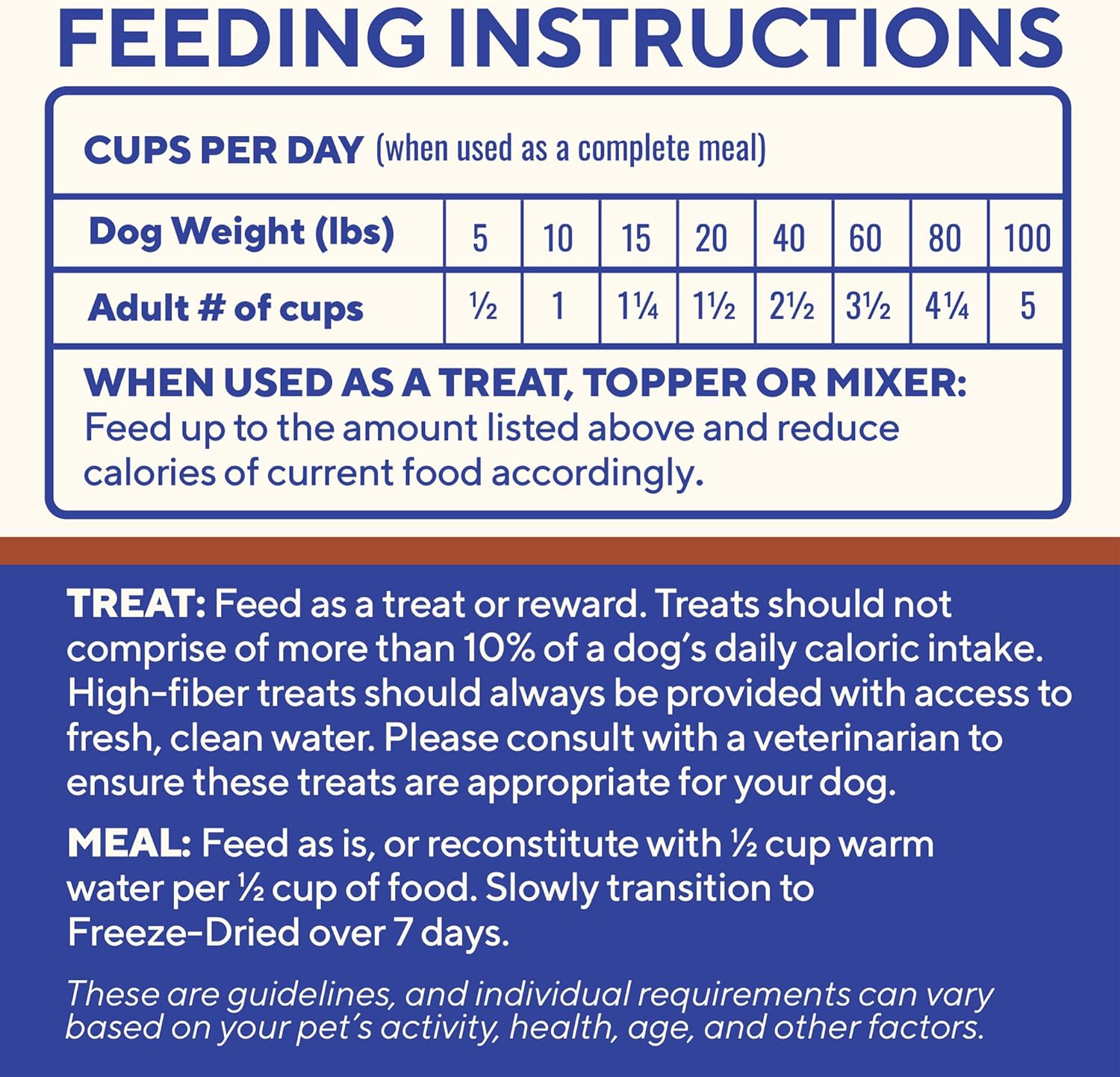 - Directions: TREAT Feed as a treat or reward. Treats should not comprise more than 10% of a dog's daily caloric intake. High-fiber treats should always be provided with access to fresh, clean water. Consult a veterinarian to ensure the treats are appropriate for your dog.
