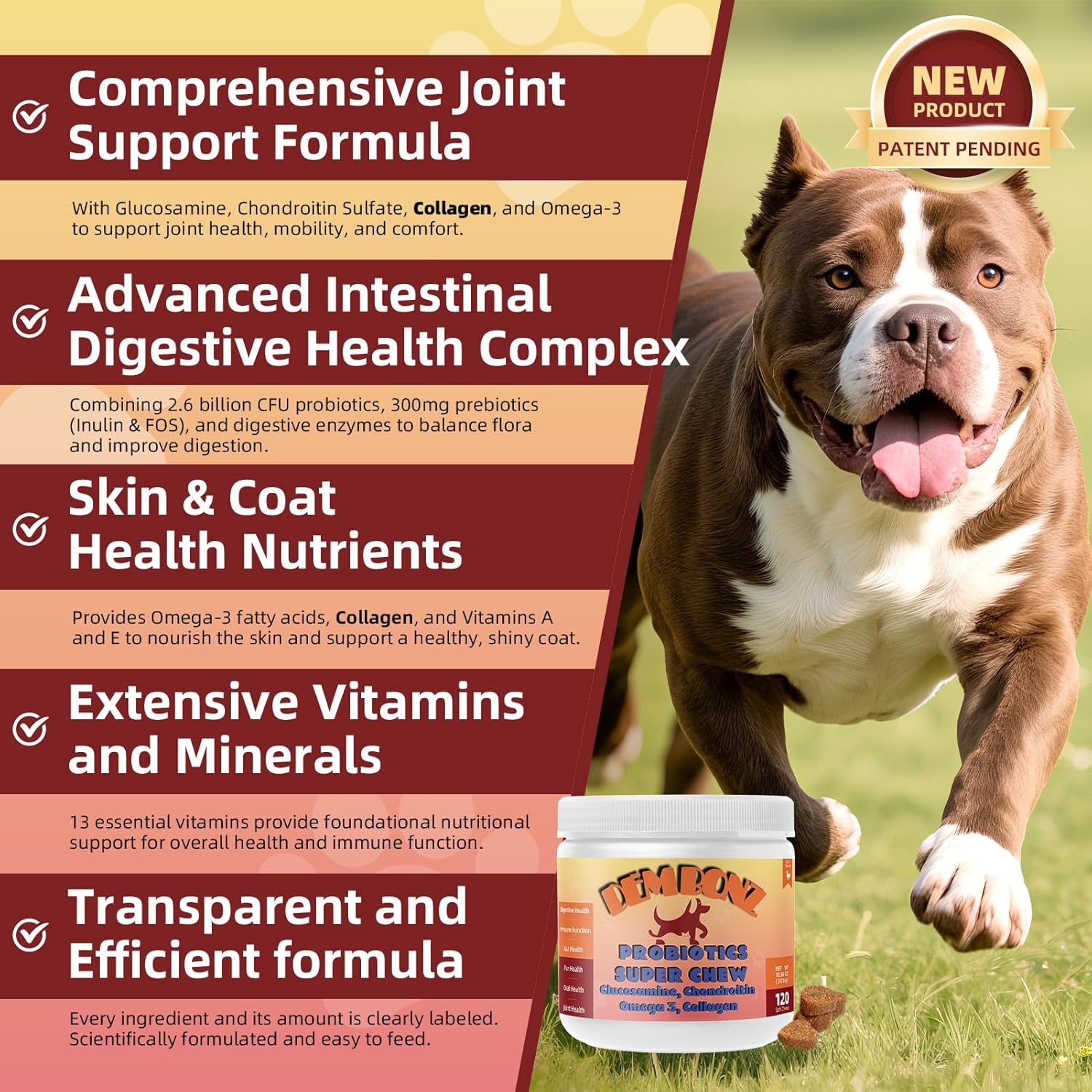 About this item All-In-One Formula – Instead of juggling multiple products, you can give your pup one complete dog joint supplement that blends probiotics, glucosamine, chondroitin, omega-3, and collagen. Simple, thoughtful care in every chew. Simplified Routine – No more worrying about which supplement was given or when. These chews make daily wellness stress-free while still offering the full benefits of a complete dog hip and joint supplement. Digestive & Immune Support – Each bite combines probiotics with omega 3 for dogs, working together to support digestion and immune function. It’s everyday care that helps your dog feel their best from the inside out. Joint & Mobility Care – With glucosamine chondroitin for dogs and collagen, these chews encourage flexibility and comfort. Whether your dog is young and active or slowing down with age, mobility support is always built in. Enjoyable Treat Format – Your dog will think of these as a tasty snack, but you’ll know they’re more than just a dog skin and coat supplement. Each chew supports digestion, immunity, oral care, and joints—all in a form they love. › See more product details
