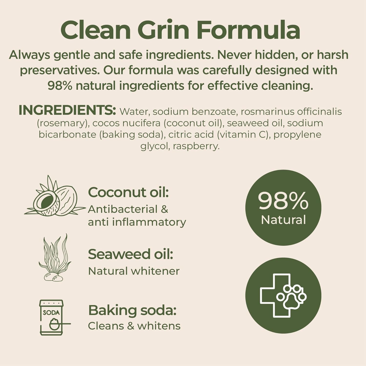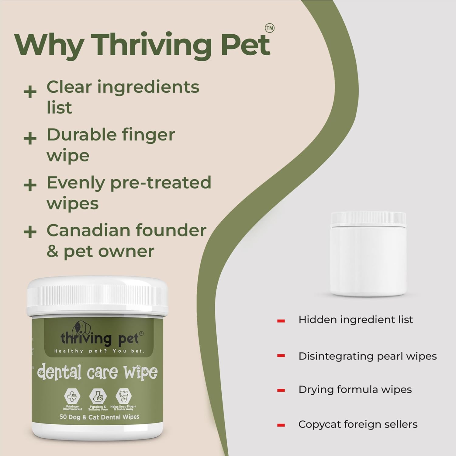 Thriving Pet - Clean Grin Dental Wipes, were produced with your beloved pet in mind. We intentionally designed our Clean Grin formula with minimal, gentle, and safe ingredients to ensure teeth cleaning for your furry best friend is enjoyable and totally hassle free for the hooman. Thriving Pet Finger Wipes are perfect for keeping your pet's mouth clean and fresh, our wipes promote good oral hygiene and help prevent tartar and plaque buildup. Say goodbye to bad breath with these cat and dog teeth wipes. Infused with primary ingredients like Rosemary, Coconut, Seaweed oil and Sodium Bicarbonate, this gentle formula ensures that your beloved furry best friend is not exposed to any harsh ingredients.