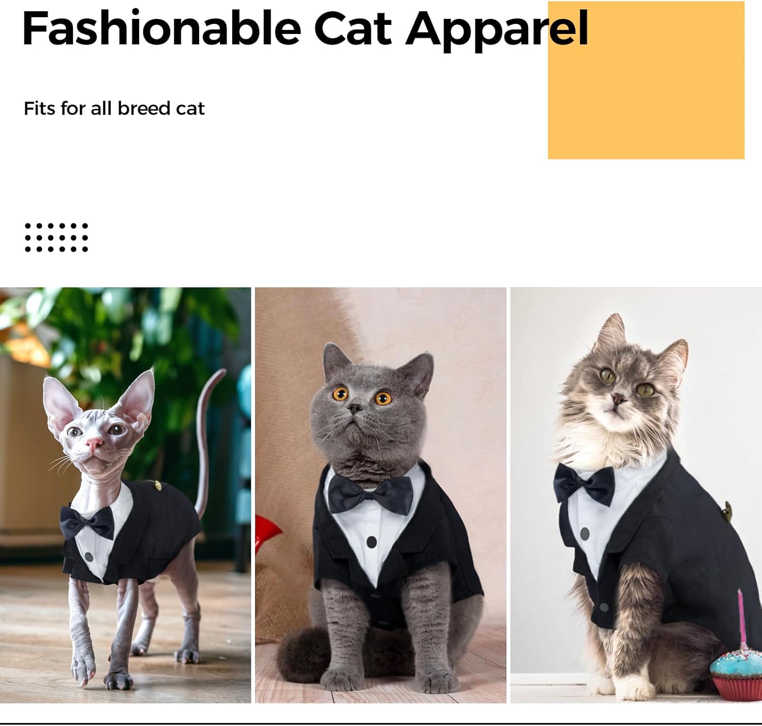 About this item 【Cat Tuxedo Suit Tie Outfit】Cat tuxedos are perfect for formal occasions such as weddings or special events. Turn your pet into a stylish and elegant pet, making your pet the star of the show at formal events and occasions. Fashion formal shirts are easy to match for everyday wearing, photo taking, parties, holidays, festivals. Fashionable design makes your cat distinctive and adorable. High-quality craftsmanship ensures these adorable shirt suits are suitable for indoor and outdoor pet wear. 【Fashionable Formal Cat Apparel Sets】The tuxedo comes with bow tie, suitable for a variety of formal occasions. This stylish and attractive choice for your pet includes a fancy kitten onesie outfit and formal attire wedding shirt, which can also be used as costumes for Halloween, photo shoots, or to showcase your pet's unique style. Show off your pet's unique style in a fashionable way with this versatile outfit. Cat formal wear is perfect for making your pet stand out. 【Soft & Comfy Skin-Friendly Fabric】Cat tuxedos made from high-quality fabrics come in a variety of styles, adding a touch of class and sophistication to your pet's wardrobe. Fabric type: 78% Polyester, 18% Rayon, 4% Spandex. Our cat tuxedos have been specially softened to make the whole outfit very soft. The slim-fitting style is perfect for the cat's body, especially for Sphynx Cat, Devon Rex Cat, Cornish Rex Cat, and Peterbald Cat, providing them with comfort and ease of movement. 【Cat Clothes For Cats Only】Designed for hairless cats. For furry cats, size up based on coat length. Measure chest girth (widest ribcage part) for sizing. Lightweight fabric allows free movement. The back of the tuxedo is decorated with a beautiful bowknot, making it look great from both the front and back. These cat clothes are designed for optimal comfort and style, perfect for any special occasion. 【Easy To Put On & Take Off Cats Wear】The button closure type makes the costume very easy to slip on and off, even for cats who don't normally wear clothes. It can be machine washed for easy maintenance. Hairless cats wearing clothing can not only comfort their anxiety but also prevent them from throwing up daily. This "Must-Have" daily costume shirt for hairless cats keeps your pet warm and stylish, cat tuxedo suit is designed for convenience and comfort, making dressing up your pet a breeze. › See more product details