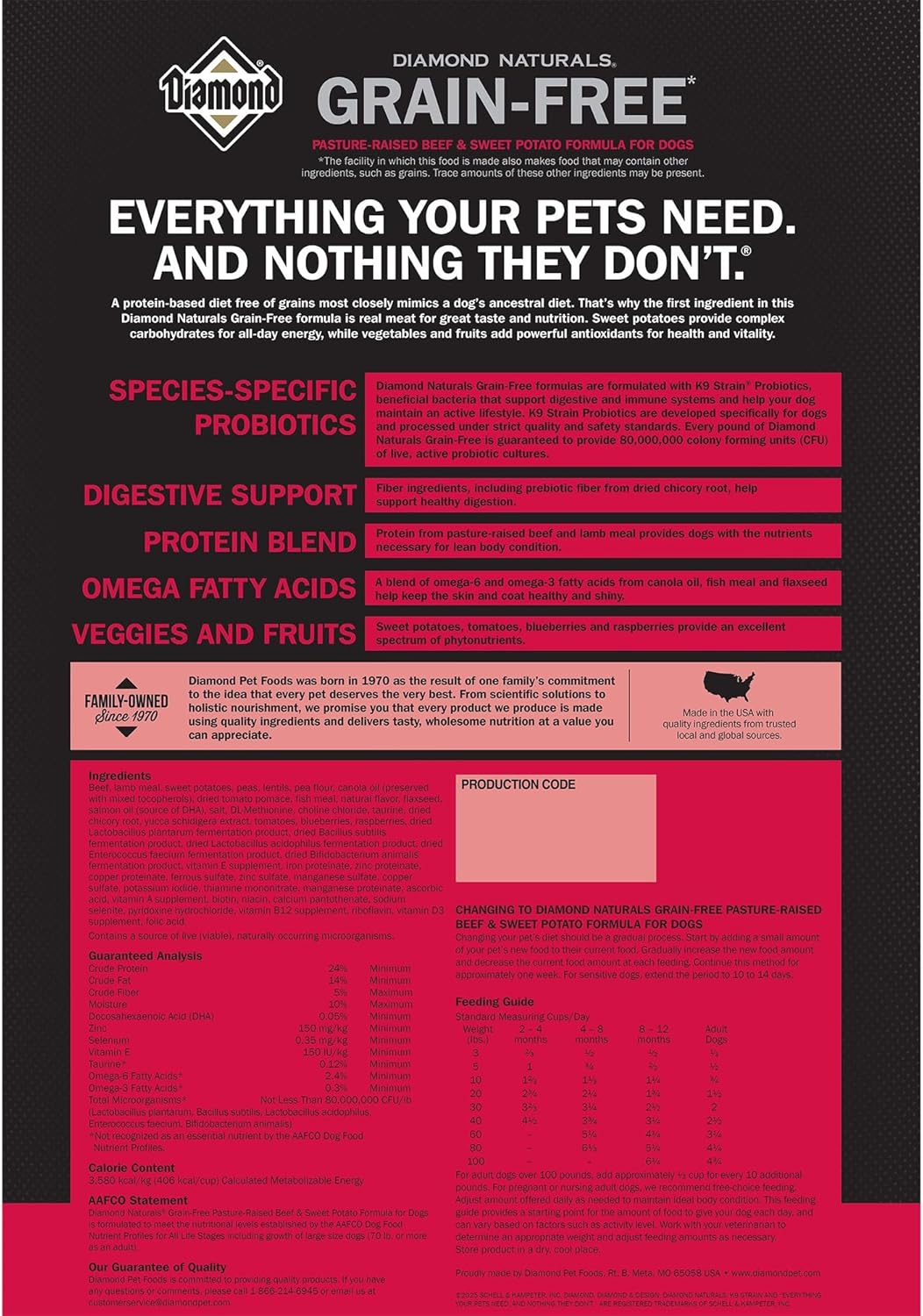 A protein-based diet free of grains most closely mimics a dog's ancestral diet. That's why the first ingredient in this Diamond Naturals Grain-Free formula is real meat for great taste and nutrition. Sweet potatoes provide complex carbohydrates for all-day energy, while vegetables and fruits add powerful antioxidants for health and vitality.