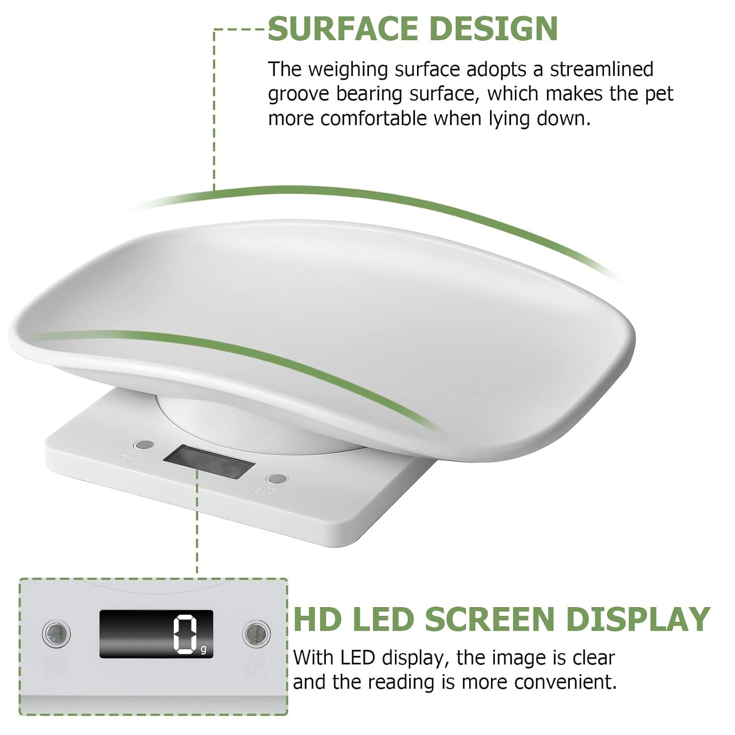 About this item 🐾【Ideal for Weighing Cats and Smaller Dogs】- This digital pet scale can measure weight (Max : 33lbs), the length of the tray is 11.5". This puppy scale is perfect for weighting newly born pets or little pets. NOT LARGE ENOUGH FOR ADULT CATS/DOGS. 🐾【Multifunction】- This digital scale can measure the weight of small animals, cats, puppies, newborns, ensure accurate assessment and feeding. It can also be used as a food scale to weigh feed. 🐾【Accurate Result】- Minimum division: about 1g Unit, g/oz can be switched . With this kind of accuracy, you can track the slightest fluctuations in your pet’s weight. Use this pet scale for dogs or cats to keep your fur-baby in tip-top shape. 🐾【Simple Setup and Storage】- Open the box, insert the scale into the bottom of the tray, then put 2 AAA batteries(no include) to start the weighing. This new born puppy scale is very sturdy for pets to sit on and delivers readings in seconds, which is a plus for animals that tend to get skittish. 🐾【Important Usage Tips for Best Accuracy】- Place the scale on a flat, hard surface (table or floor). Always press ZERO before weighing. Avoid carpets, soft mats, or uneven surfaces to ensure consistent results. › See more product details