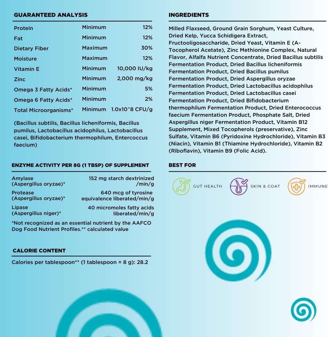 - Directions: First Time Users Only To help limit the chance of digestive upset gradually increase the serving using the method below. Rapid changes or additions to diet can cause digestive issues. Day 1 start with 1/4 serving Day 4 increase to 1/2 serving Day 8 increase to 3/4 serving Day 12 feed full serving Returning Customers Daily Serving Feed one scoop of supplement per day. If you feed your dog twice per day then feed 1/2 scoop with each meal. Each large dog scoop contains about 24 gm. We recommend mixing a little water with your dog's food so that the supplement will stick to it. For taste and added Omega 3 and Omega 6 fatty acids mix in a little LickOchops™ or SuprOmega® liquid supplement. Your dog will love it.