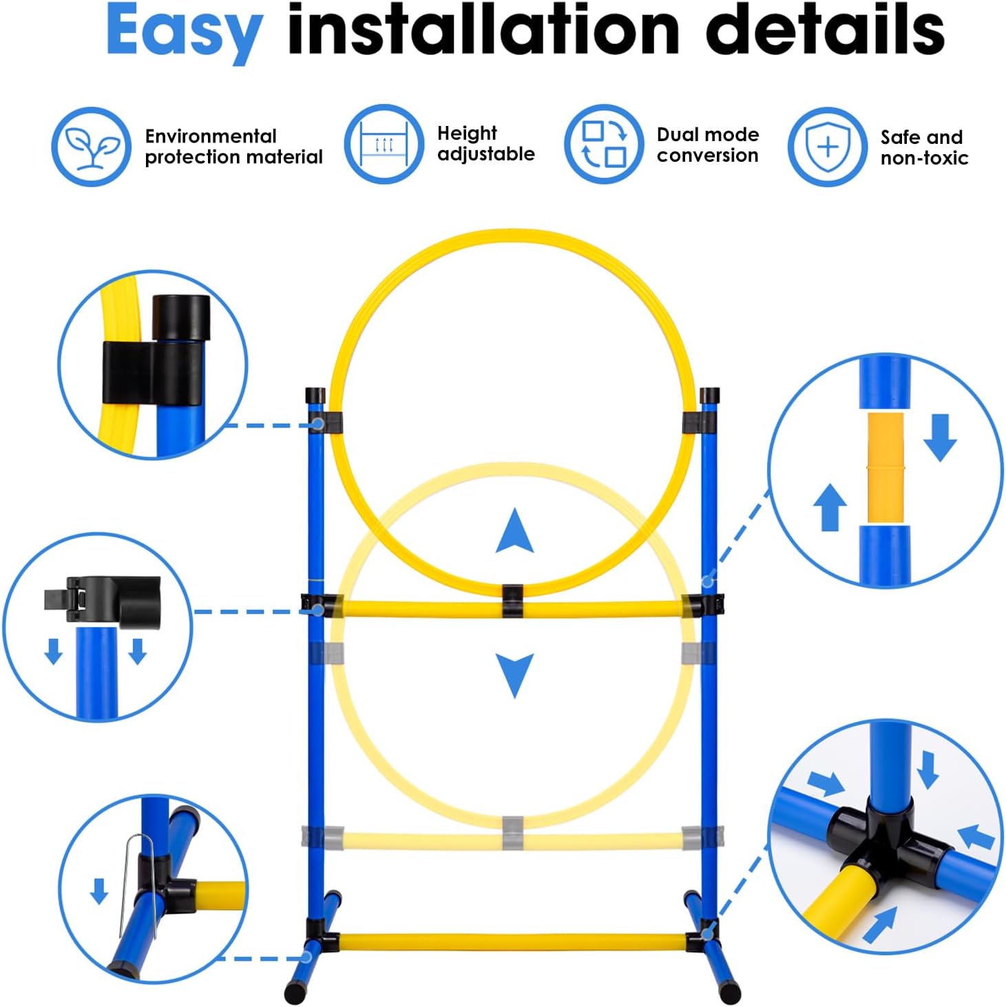 RUGGED & STURDY:Our product is durability, the training pole is made of ABS material,which is safe and sturdy,that can be used in the park or backyard. In addition, our u-shaped ground nail ensure that each agile pole remains stable on the ground, providing the best stability even during intense running and jumping processes! LIGHTWEIGHT & EASY INSTALL: It can be assembled and removed in just a few minutes without any tools, and there are 2 free storage bags for you to take outdoor or indoor. When you train or walk your dog,and our little toys are all great fun for you and your pet. HEALTH & FUN:Running, jumping, playing and crossing obstacles can improve your dog's agility and flexibility, make your dog more active and health, and getting closer between you and your pet. What a great way to spend time with your pet! SUITABLE For EVERYONE:This adjustable dog agility training set is suitable for dogs of any age (large/medium/small). The perfect 11-piece obstacle training set allows beginners and experts to freely choose their training mode, to complete their dog's agility training course. INDOOR & OUTDOOR USE:Our dog agility kit allows you to use it in any indoor or outdoor setting, such as the living room, hallway,backyard, garden, etc. It is easy and portable, and will not affect the fun of your pet's training and play, regardless of the weather! › See more product details