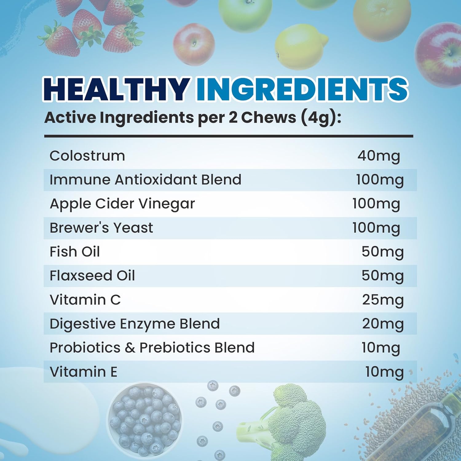 About this item EFFECTIVE ALLERGY RELIEF FOR DOGS: Our dog allergy relief chews, enriched with probiotics for dogs, Specifically designed to relieve allergy symptoms.. The premium DUAL-ACTION chews, as allergy immune bites for dogs, also blend colostrum, omega-rich fish oil, vitamin E, and flaxseed. These itch and allergy chews for dogs offer fast relief, calm inflammation, and are ideal for dogs with seasonal sensitivities NATURAL INFLAMMATION RELIEF FORMULA:These allergy chews for dogs contain apple cider vinegar and brewer's yeast to soothe irritated skin. As the dog probiotics alternative, our better wild pets allergy formula helps rebalance skin pH naturally. Ideal for pups constantly scratching from environmental triggers PROBIOTIC GUT HEALTH COMPLEX:More than typical pet probiotics for dogs supplements, our chews include digestive enzymes and 5 probiotic strains. These allergy and immune chews for dogs support gut health to reduce food-related reactions. ROBUST PROTECTIVE BARRIER:The puppy probiotic formula features vitamins C+E to strengthen skin's natural defenses. These nutrients in our allergy immune bites for dogs promote collagen production while protecting against environmental allergens for healthier skin TASTY DAILY TREAT FOR PICKY EATERS:Our delicious dog allergy relief chews make allergy care effortless. Unlike pills, these itch and allergy chew for dogs are treats pups love. Simply give 1-2 of these probiotics for dogs for allergies and itchy skin daily for comprehensive protection and relief › See more product details