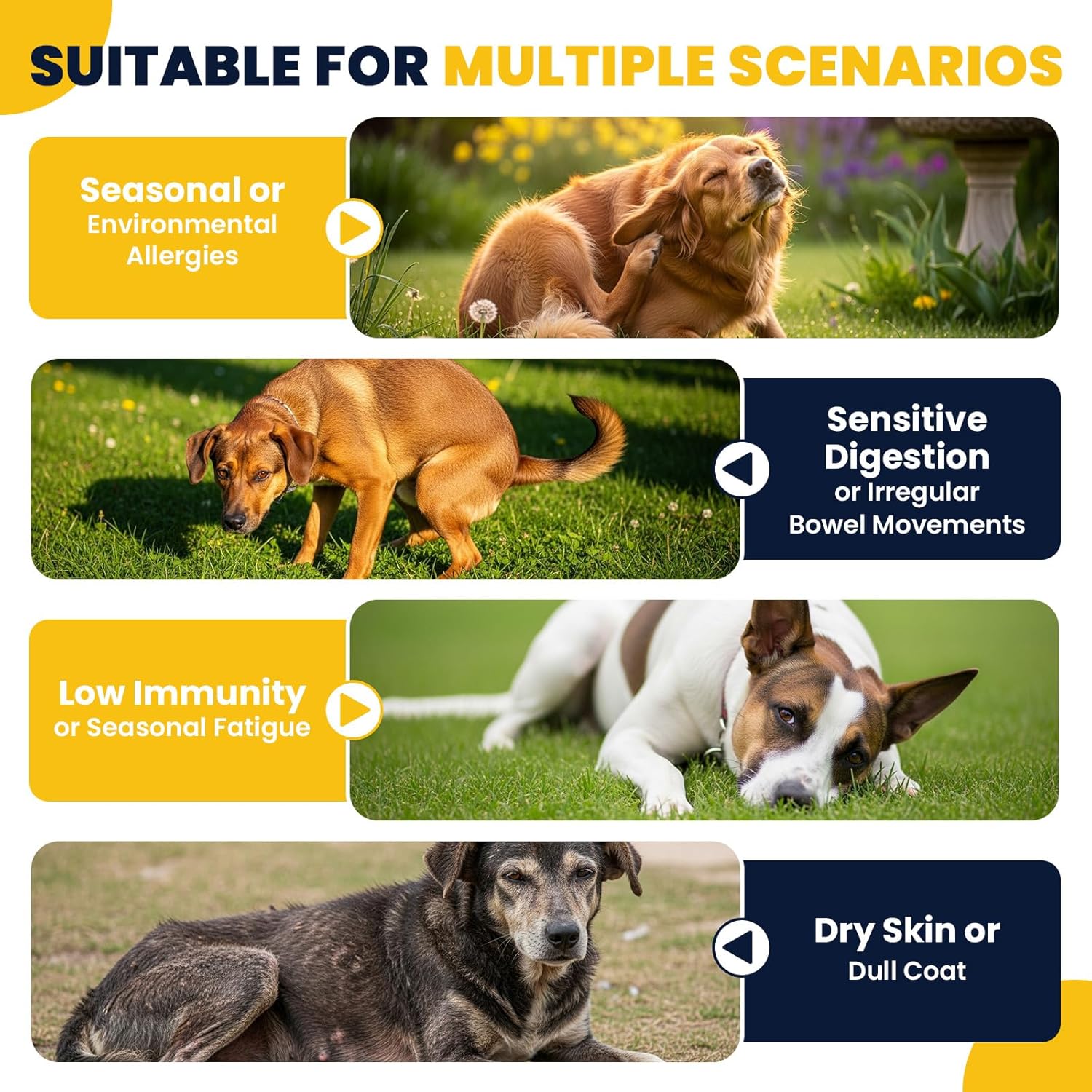 Allergy and immune chews for dogs formulated with Fish Oil, Vitamin C and Colostrum effectively support seasonal allergy relief for dogs and support discomfort caused by food allergies. Specifically designed for dog itch relief, support scratching behaviors, offer paw licking relief for dogs, address dog skin allergy relief and support hot spot.Dog allergy chews support canine immune health, enhance skin resilience and provide lasting comfort for dogs Dog probiotics for yeast,itchy skin and itchy ears specially formulated with prebiotics,probiotic for dogs and digestive enzymes.Dog itching skin relief chew support balanced gut flora,support occasional stool problem,digestive comfort and nutrient absorption.Dog probiotics for digestive health are especially suitable for dogs with sensitive stomachs,frequent diet changes,poor digestion or gastrointestinal discomfort.ProbiΓ³ticos para perrosa is a healthy choice for dogs Probiotics for dogs chews simultaneously supporting allergy,gut health,immunity,skin and coat health.Dog probiotics are formulated with nettle,quercetin and other multiple immune antioxidant blends ingredient,chews for itch relief for dogs support metabolism and normal immune function,suppoort dog itching skin relief,the same time dog probiotics support gut health and promote a healthy,shiny coat.Allergy chews for dogs help maintain overall vitality and daily comfort Probiotic chews for dogs made with real chicken, soft-textured allergy chews for dogs offer excellent palatability, easily accepted by even picky eaters. Dog skin health chews suitable for dogs of all sizes and breeds, providing effortless daily supplementation that transforms nutrition into enjoyment.Pet probiotics for dogs chews available in a large pack of 200 allergy relief for dogs chews.Probiotic dog chews delivering long-term safe health support Dog gut health probiotics are produced in a GMP-certified facility in the USA. Each probiotics for dogs digestive health chew contains no corn,soy,wheat or artificial flavors,giving dogs safe and reliable dog itch relief chews.Probiotic for dogs gut health with gentle and effective allergy dog chews formulation is highly recommended and trusted by veterinarians and pet owners.Allergy support chews for dogs itching give dogs a comfortable,happy and healthy life βΊ See more product details