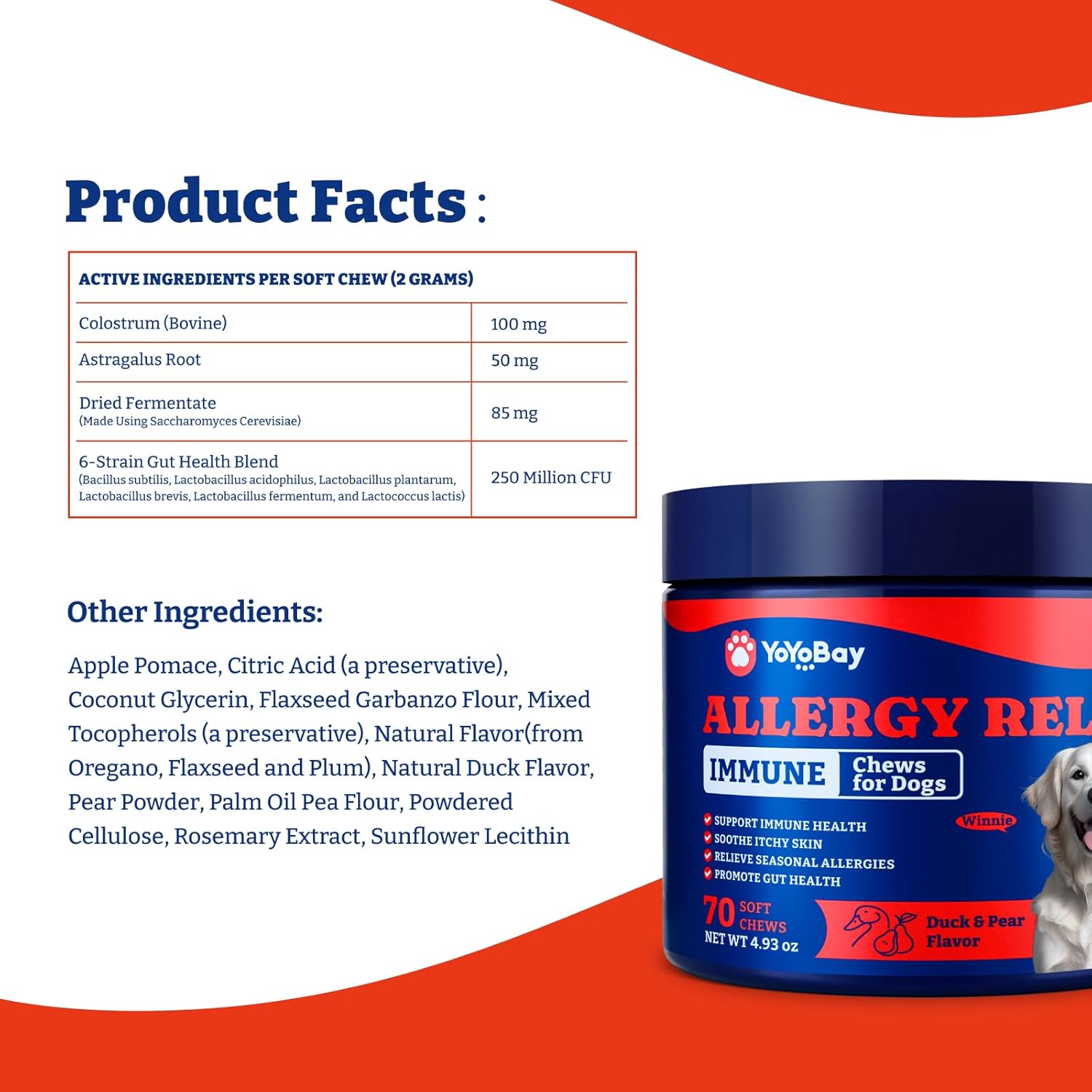 • Immune Health & Allergy Relief Formulated with Bovine Colostrum and Astragalus Root, these chews help strengthen your dog’s immune system while naturally relieving seasonal allergies. They reduce itching and discomfort, providing essential support for a healthier, happier dog.