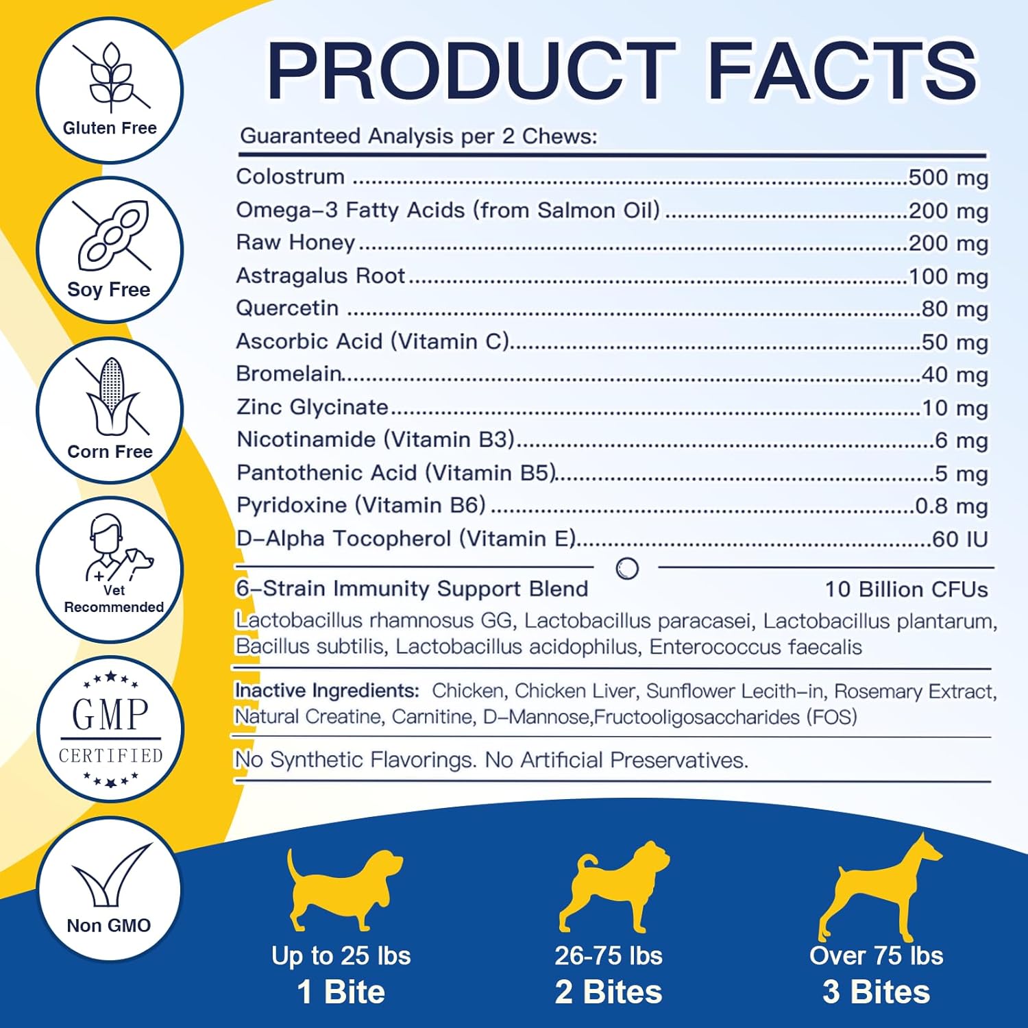 NATURAL ALLERGY MEDICINE FOR DOGS: Our dog allergy chews provide gentle seasonal, environmental allergy and dog itching skin relief. It contain turmeric and quercetin help reduce inflammation, scratching, skin irritation and dog allergy paw relief BOOST IMMUNE SYSTEM AND DEFENSE: The anti itch for dogs contain colostrum for dogs, dog probiotics help balance gut flora, and boost immunity to defence against allergen, support dog allergy response and properly regulate the histamine level POWERED BY RAW HONEY: It contains natural anti-allergens, dog vitamins, antioxidant to help environmental allergy, itchy skin relief. It provide special skin protection & natural coat care for dogs. Make your dog stays comfortable during allergy season GIVE THE PUP A SHINY COAT: Our skin and coat supplement for dogs is rich in omega 3 for dogs. The healthy fatty acids help reduce inflammation, flaky dry skin relief for dogs, nourish coat and stop excessive shedding, and boost heart, cognitive function UP TO 4-MONTH SUPPLY: 120 bites per jar provide long term dog skin allergy relief. It is free of grains, wheat, corn, soy, and any artificial additives or fillers. With adjustable dosage, every size, breed of dogs gets the right amount TASTY CHICKEN FLAVOR BITE: Made with real chicken, it is easy to administer as a tasty treat. The freeze-drying technology help keep the nutrient ingredients active and natural flavor. Even the pickiest pup will love the cruncy texture › See more product details
