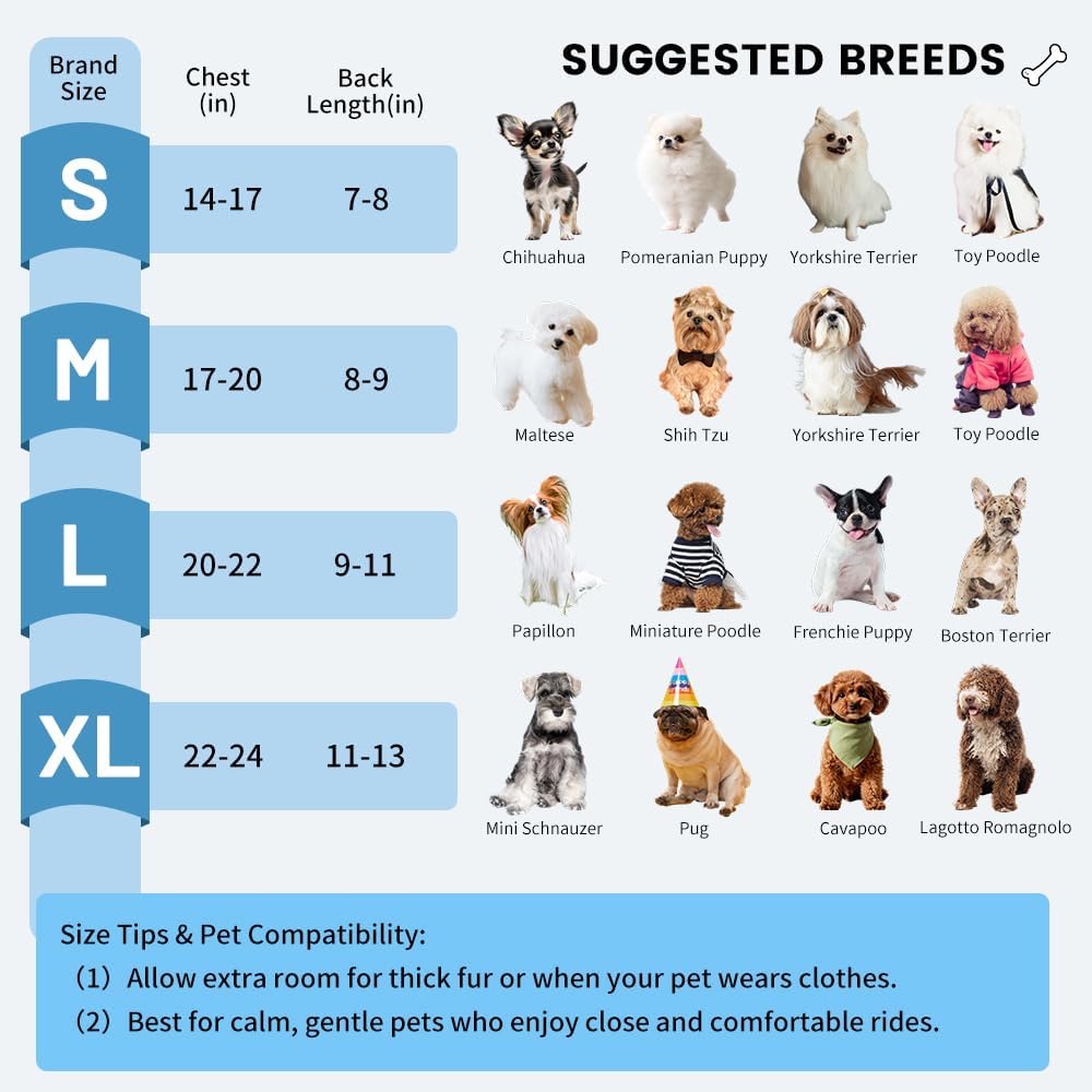 About this item 【Measure Before You Buy】 Always measure your pet’s back length and chest girth before purchase. If back length fits but chest girth is smaller, choose one size down. Weight is only a reference. Designed for calm rides and close snuggles; not ideal for restless or anxious pets. Padding may look flat from vacuum packing — just pat to restore shape 【Thickened Straps & Bottom Cushion Support】Mosago dog carrier backpack now features extra-wide padded shoulder straps and a thickened sandwich-style bottom cushion, offering both comfort and better support for small dogs. Perfect for short walks or long adventures, this dog carriers for small dogs backpack balances comfort and stability 【Secure Triple Safety System】Mosago small dog backpack carrier features a three-layer safety system: side zippers, velcro, and an inner buckle that clips to your pet’s collar. It also includes an anti-escape zipper that only opens when the zipper head is lifted, keeping your pet secure during every trip 【Breathable & Durable Material】Made from polyester stretch mesh fabric, the Mosago pet carrier backpack and puppy carrier are breathable, flexible, and tear-resistant. They keep your pet cool and comfortable while withstanding daily wear, making them ideal for walks, hikes, and travel 【Legs & Tail Out for Natural Comfort】Mosago dog backpack carrier is designed for comfort with soft cotton-lined leg and tail openings and an elastic neck design that adapts to your pet’s shape. This dog carrier backpacks style reduces pressure and prevents chafing, offering full support for secure, relaxed travel 【Hands-Free & Multi-Position Wear】This versatile dog front carrier and dog back pack can be worn on the front or back. Ideal for hands-free walking, camping, or errands—Mosago’s backpack for dogs to carry dogs makes bonding while traveling easier than ever 【Great for Interaction & Photos】Mosago’s dog chest carrier lets you keep your pet close and visible. Ideal for cuddles, selfies, and social bonding, this dog carrier backpacks design helps create memories wherever you go 【Anti-Anxiety Open-Air Comfort】Pets often dislike enclosed crates. The Mosago cat backpack carrier and dog backpack let legs and tail hang free, reducing stress while allowing pets to interact and stay calm in the puppy carrier wearable design 【Lightweight & Easy to Pack】Weighing just 0.5 lbs, this small dog backpack folds easily into luggage or backpacks. Use as a dog backpack carrier for small dogs or a daily puppy backpack when traveling, hiking, or commuting with your furry friend 【Responsive 24/7 Customer Service】We care about you and your pets. If you have questions about your dog backpack or any dog carriers for small dogs, Mosago offers fast responses and practical solutions within 24 hours—guaranteed Show more › See more product details