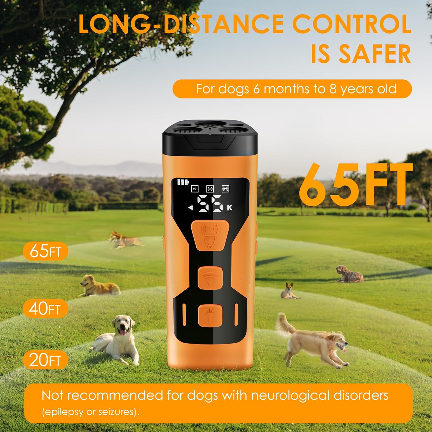 【Equipped with 3X Ultrasonic Transmitters】- KQMOP dog bark deterrent device achieves 3 times wider coverage than single-transmitter devices, stopping barking, jumping, and aggressive behavior in 1 second. Safer than anti-bark collars and more effective than dog whistles, this is the optimal solution for anti-bark training. It provides a humane training solution for 99% of dogs aged 6 months to 8 years without hearing impairments. It is not recommended for dogs known to have epilepsy or other neurological conditions. 【Precise Control of Multiple Functions】 - Smart LED display clearly displays current device information, supports 4 adjustable ultrasonic frequencies (25-55kHz) and 5 sound modes. No electric shocks or pain make it easier for dogs to understand your training behavior. Adjust the training mode according to the characteristics of stubborn or sensitive dogs, and instantly switch to response modes for scenarios such as barking, chewing, or neighbor dogs causing disturbances. 【65FT Ultra-Long Range & Night Vision Function】 - Stop annoying barking within 65 feet away—more than twice the range of competitors! Ideal for backyards, walks, or leash-free areas. Simply point and press the button—no need to shout or make physical contact. A more humane and efficient solution. Built-in LED flashlight provides safety during nighttime walks and dim lighting training, illuminating the path and deterring dogs approaching at night. Ensuring both you and your dog stay safe in dimly lit environments. 【4000mAh Large Battery & Fast Charging】- Industry-leading 4000mAh battery charges fully in two hours and lasts over 60 days, with a standby time of up to 180 days. Even with the flashlight on, it can operate continuously for five hours. Say goodbye to frequent charging hassles—trust it to train your dog anytime, whether traveling, hiking, or in emergency situations like sudden barking. No more worrying about the device running out of power midway. 【Practical & Compact Multi-Purpose Design】- The ultra-portable pocket-sized design fits easily into bags or pockets, smaller than a mobilephone. Combining humane dog training, emergency flashlight, and deterrent functions, it is a high-end essential for pets, blending advanced technology with humane methods. The ergonomic grip and lanyard make it easy to control. › See more product details