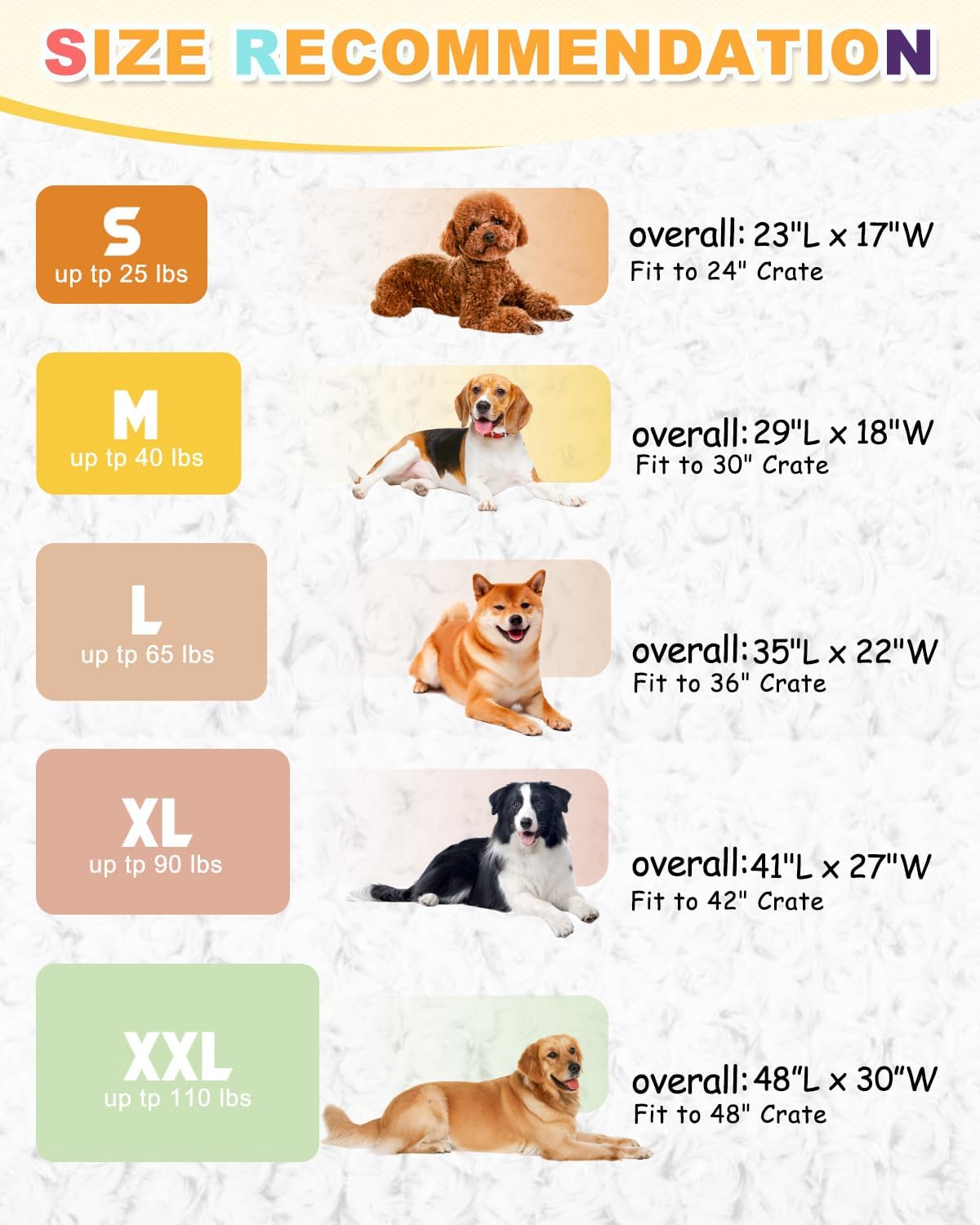 About this item High-Support Dog Crate Bed - Using high-density foam,our orthopedic dog crate bed is thinner than normal 3" foam dog bed, but provides similiar degree of support,which makes this bed less bulky and easier to carry anywhere.Our suffient-support dog crate bed mat especially suit for large dogs, older dogs, and dogs with joint conditions. Ultra Soft Rose Velvet - Adopting heavy weight deluxe plush material dog crate mat touchs super soft, cozy and not easy to shed providing your friend a cozy environment easy to calm down and fall asleep. Size Options - The size fo our dog bed fit well in dog crate.This dog crate pad measures approximately 35"L x 22"W x 1.2"H, works great as a soft dog bed for small size dog up to 65 pounds. A great choice if you want a softer dog crate bed for your pet which is not too thick. Non-Slip Design - Equipped with ANTI-SLIP & ANTI-SCRATCH bottom,this dog rug can stay put in crate and prevents your dog from moving when steps on or off.Let your pet plays without any worries and protect your wooden floor as well. Multiple Usage - Each size of dog bed fits to crate.With light weight and anti-slip bottom,the bed can be put on the wooden floor,porch,car,elevated dog bed and outdoor places. › See more product details