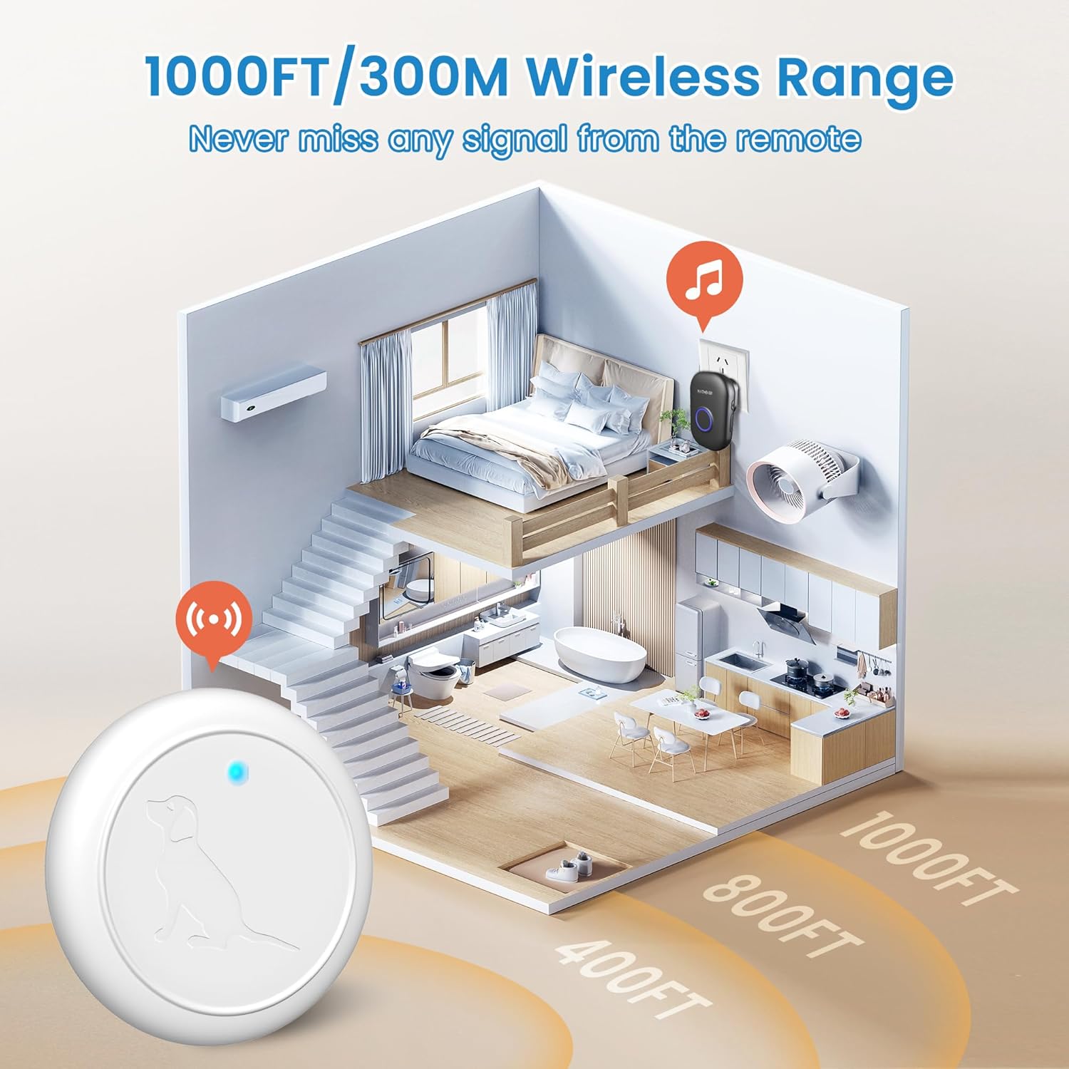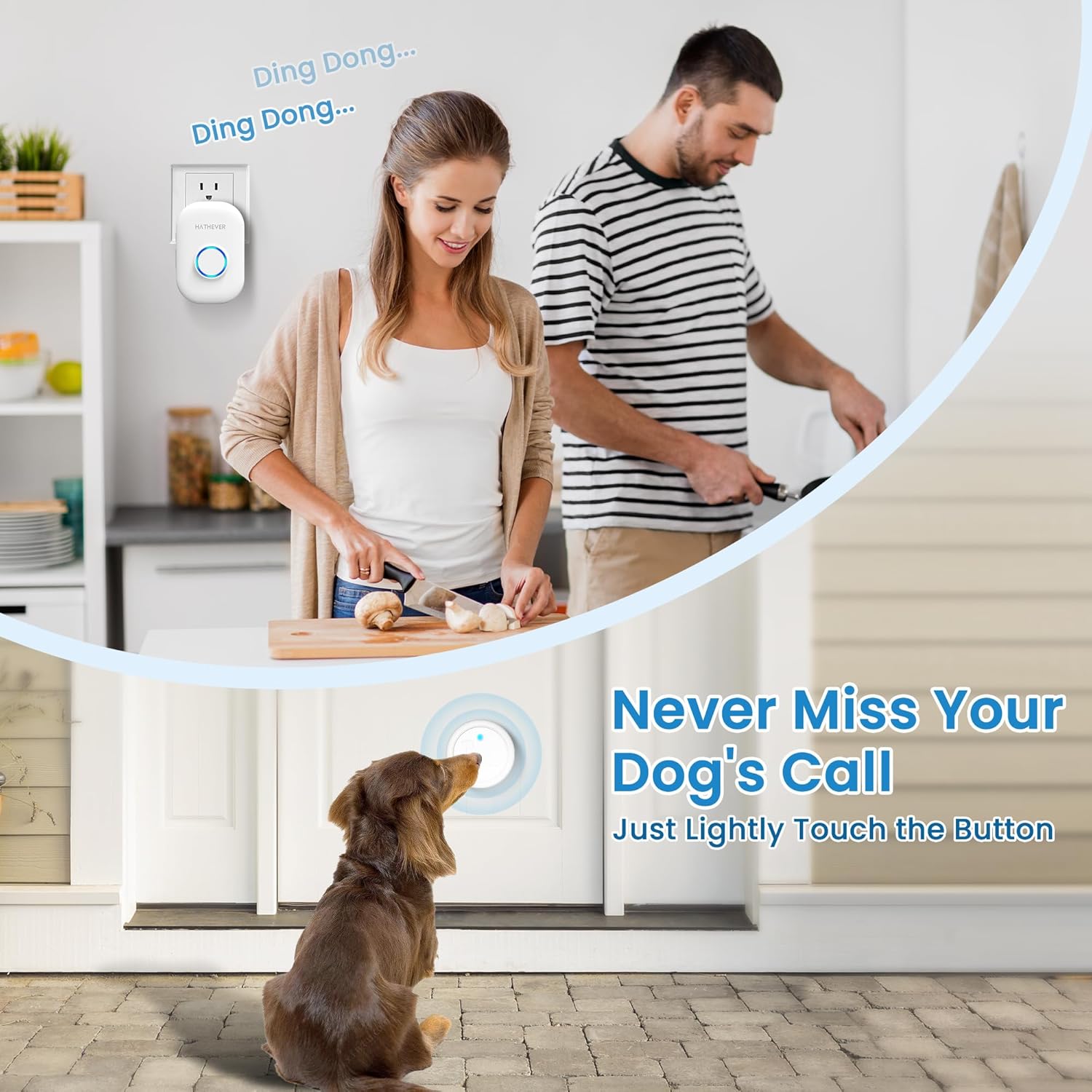 Easy Installation: Simply plug the receiver into the socket and attach the button on the wall or door with reusable Velcro. Its hook and loop tape simplifies installation, and the sticky back allows easy battery replacement without wall damage. Customizable Ring Tones: This dog training bell features 32 clear melodies and adjustable volume levels from 0db to 110db. Each button can be programmed with a unique tone to locate your dogs easily. It also offers 4 notification modes to accommodate various situations. 1000 Ft/ 300 M Wireless Range: This dog door bell has a reliable signal transmission and will not interfere with other equipment in your home or those of your neighbors, ensuring you will never miss any signal from your dog. Premium Transmitter: The transmitter is designed with a 12V 23A alkaline battery that can last up to 3 years. It is also rated IP65 for dustproof and waterproof protection, allowing it to withstand harsh weather conditions between -4 °F and 140 °F. Works for all Dogs: Our dog doorbell has a large and sensitive touch area that is easy for dogs of any size, whether you have a small puppy or a large one. Additionally, it is CE, FCC, and RoHS approved. › See more product details