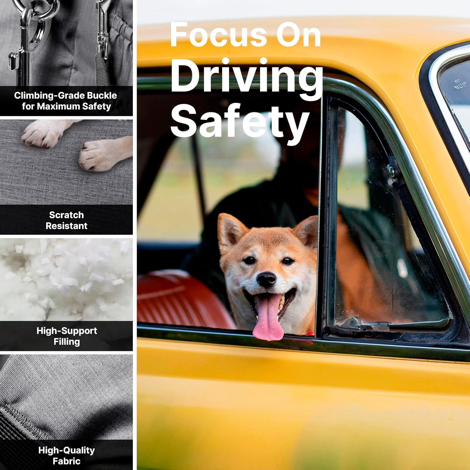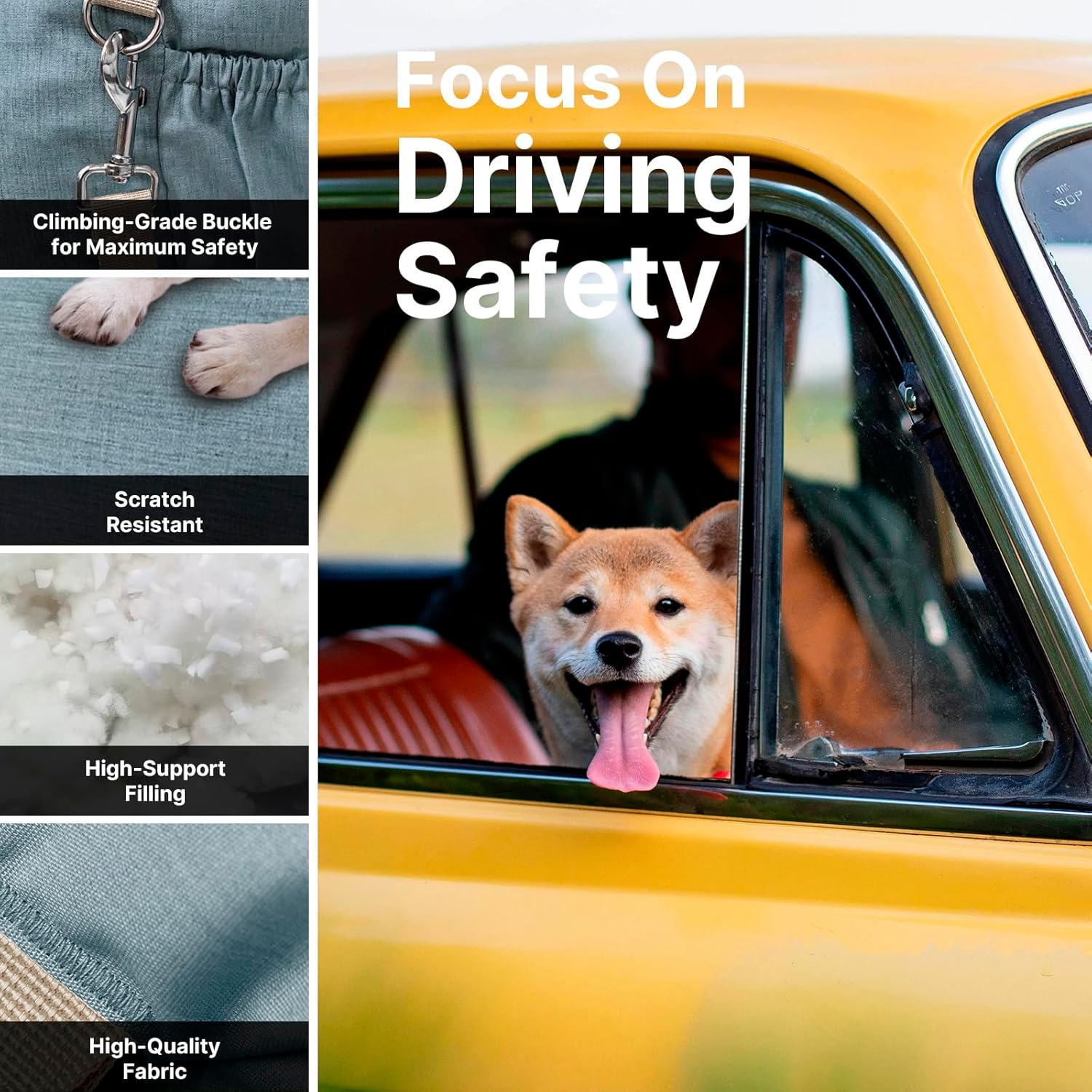 About this item Safety and Reliability: This puppy car seat is securely fastened with seat belts and headrest straps, reinforced by adjustable buckles and safety ropes, ensuring maximum safety for your pet. An adjustable leash, hidden beneath the booster cushion, prevents your pet from jumping out, adding an extra layer of security. This ensures your dog stays safely in place during travel, allowing you to focus on driving without distractions. Durable and Comfortable Design: Made from a soft blend of 20% cotton and 80% polyester, the surface of the pet car seat for dogs provide a cozy touch. The high-density sponge padding minimizes road vibrations, delivering optimal support and comfort for your pet. Premium materials, including durable fabric, metal buckles, and snap hooks, ensure long-lasting use while keeping your pet warm and snug. Easy Installation and Convenience: The adjustable buckle design makes installation quick and secure, suitable for year-round use. Simply attach the buckle to the headrest and adjust the straps to fit your car. Built-in hanging loops allow you to attach feeding bowls or toys for added convenience. A sturdy handle ensures comfortable and durable transportation. Effortless Cleaning: Featuring a fully removable design, the dog booster car seat includes a sliding zipper for easy disassembly. The padding is enclosed in a washable bag, and the seat cover is machine washable for hassle-free maintenance. The waterproof base and fabric prevent spills and accidents, making cleanup simple and efficient. Multi-functional Use: The reversible cushion offers warmth in winter and breathability in summer, ensuring comfort year-round. This seat doubles as a dog travel carrier bed and is designed to accommodate small and medium-sized pets under 25 pounds. It fits seamlessly into the front or back seat of cars, trucks, SUVs, and more. Four spacious storage pockets provide organized storage for pet essentials, keeping your car neat and tidy. › See more product details