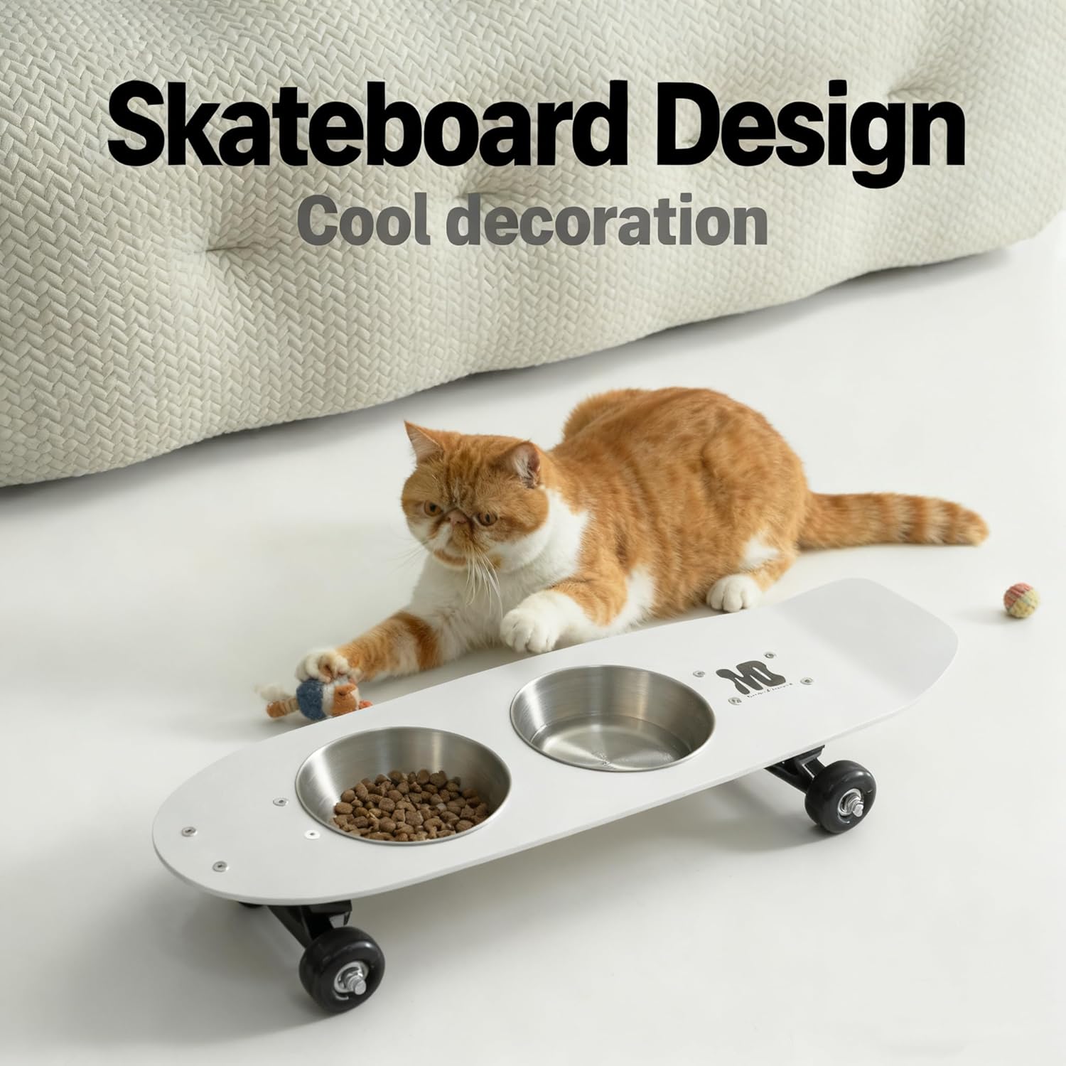 About this item Trendy Skateboard Design:More than just pet bowls, it's a fashionable home accessory that reflects your personality, making every meal time for your beloved pet cool and stylish. BUILT TO LAST: The bowls base is crafted from sturdy aluminum, providing stable support for active and energetic pets Fun and Functional: Wheels with resistance provide fun while effectively preventing accidental slipping. Premium Stainless Steel: Two separate stainless steel bowls, safe and heat-resistant, effortlessly separate dry and wet food for cats and dogs. › See more product details