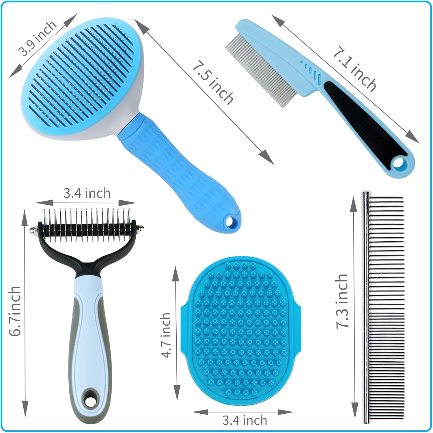 About this item 【FULL SET DOG/CAT BRUSH】 This full set of dog/cat grooming brushes includes every tool you need to fulfil daily care for pet hair removing, it should be a must for all the pets family, especially when the new puppy member joining! The kit is designed in blue sky style, making it to be a great present choice for you! 【KEEP CLEAN & REDUCE SHEDDING】 Regular grooming the hair helps eliminate dead undercoat, can clean up dandruff and dust, reducing shedding, while the skin massage promotes better blood circulation, enhance the pet hair gloss for your medium or long-haired pet, especially in the season of hair loosing. 【VARIOUS GROOMING TOOLS】 1.Rubber bath brush can take a Massage expenience to pets when showering. 2.Self-Cleaning brush with unique particles, removing the loose hair gently. 3.Double-side dematting Rake can reduce the shedding hair. 4.Stainless Steel comb with rounded teeth, would remove the undercoat knots tangles. 5.Flea comb could clear up the flea infestation. 【5 TOOLS IN 1 BAG】 All 5pcs brushes were collected in 1 Reusable Zipper bag, super portable to use everywhere, at home, park, traveling. These tools are made of high premium quality rubber and stainless steel, wear-resistant and durable, allowing the water flushing to clean, easy take and use in daily life. 【100% SATISFICATION SERVICE】 We provide a No-worry replacement guarantee for customer service, pls feel free to contact us if any problems when you receive the parcel, we will get you back within 24hrs. › See more product details