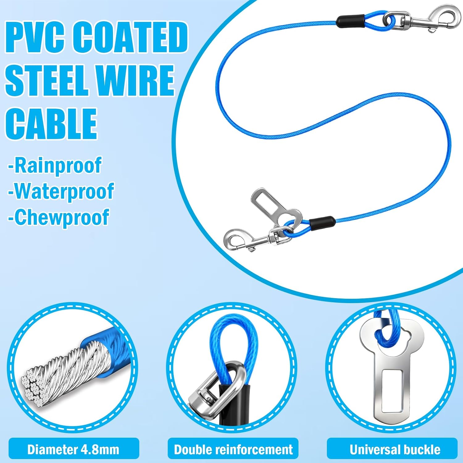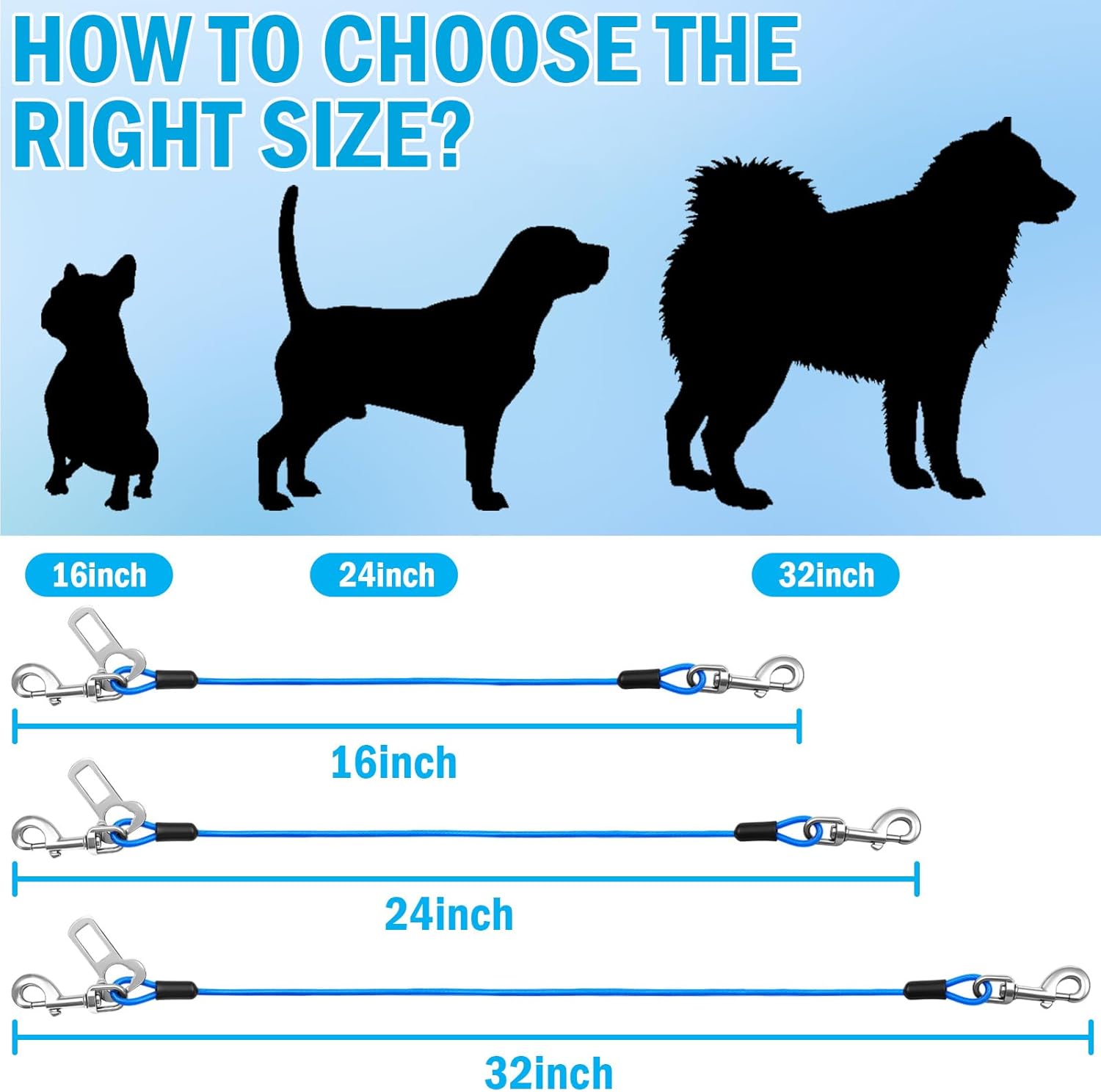About this item DURABLE MATERIAL: Features a galvanized steel wire core with PVC coating, combining strength and flexibility to withstand dog pulling. MULTI-FUNCTION CONNECTORS: Equipped with dual quick-release buckles and locking connectors, compatible with car tow hooks, seatbelt buckles, headrest rods, and trunk areas. Specific lengths can serve as running leashes, ensuring reliable indoor and outdoor use. MULTI-SIZE COMPATIBILITY: Available in 16“, 24”, and 32" lengths to accommodate small to large dogs. Measure distance from dog's harness clip to vehicle anchor point before purchasing. SAFETY ASSURANCE: Features a built-in mechanical locking system to prevent accidental release while minimizing driver distraction. AFTER-SALES SUPPORT & COMPATIBILITY: Includes size adjustment assistance. Compatible with multiple vehicle models to ensure safe and enjoyable journeys with your furry companion. › See more product details