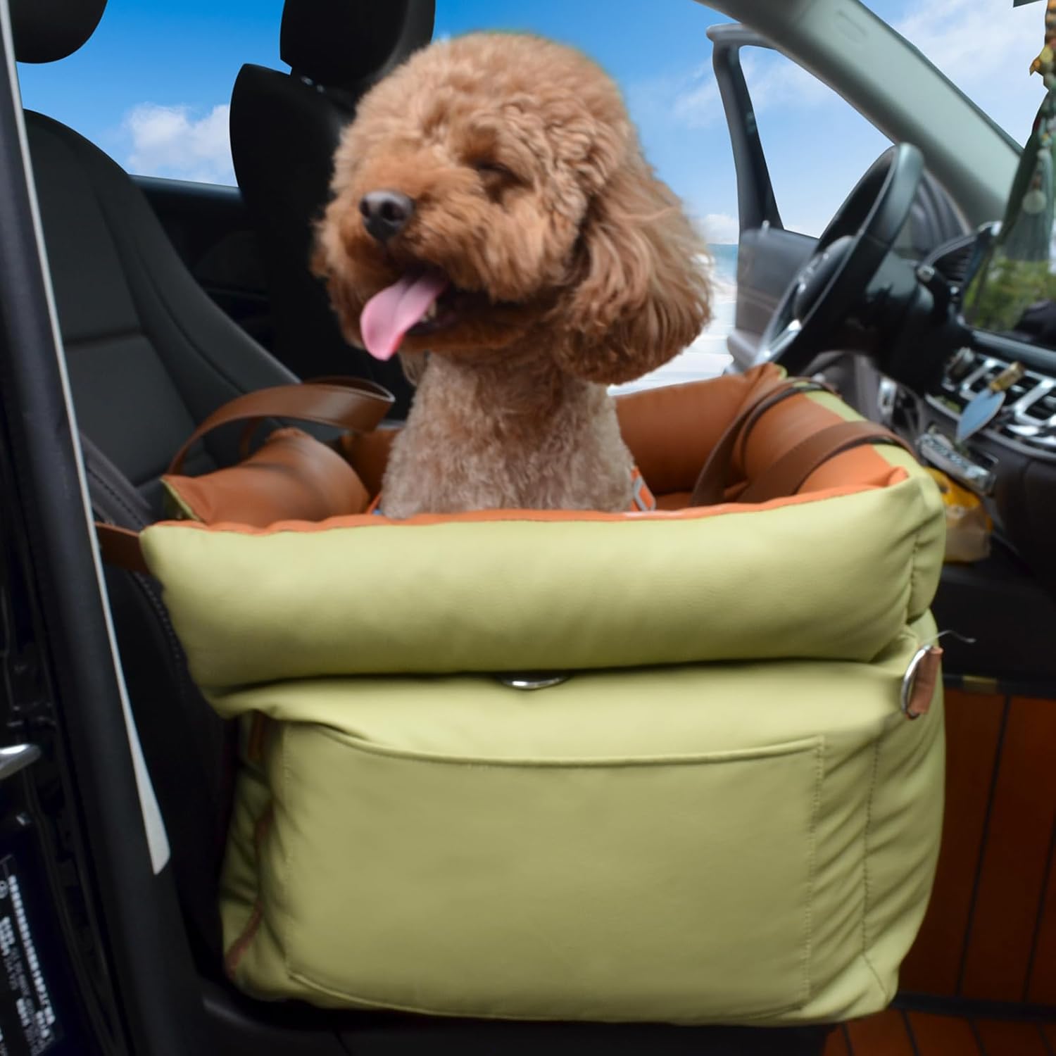 Dog Car Seat for Small Dogs, Large Leather Dog Car Bed with Storage Pocket, Waterproof PU Leather Booster Seat Travel Bed for Front & Back Seat, Clip-On Safety Leash (Black/Grey)