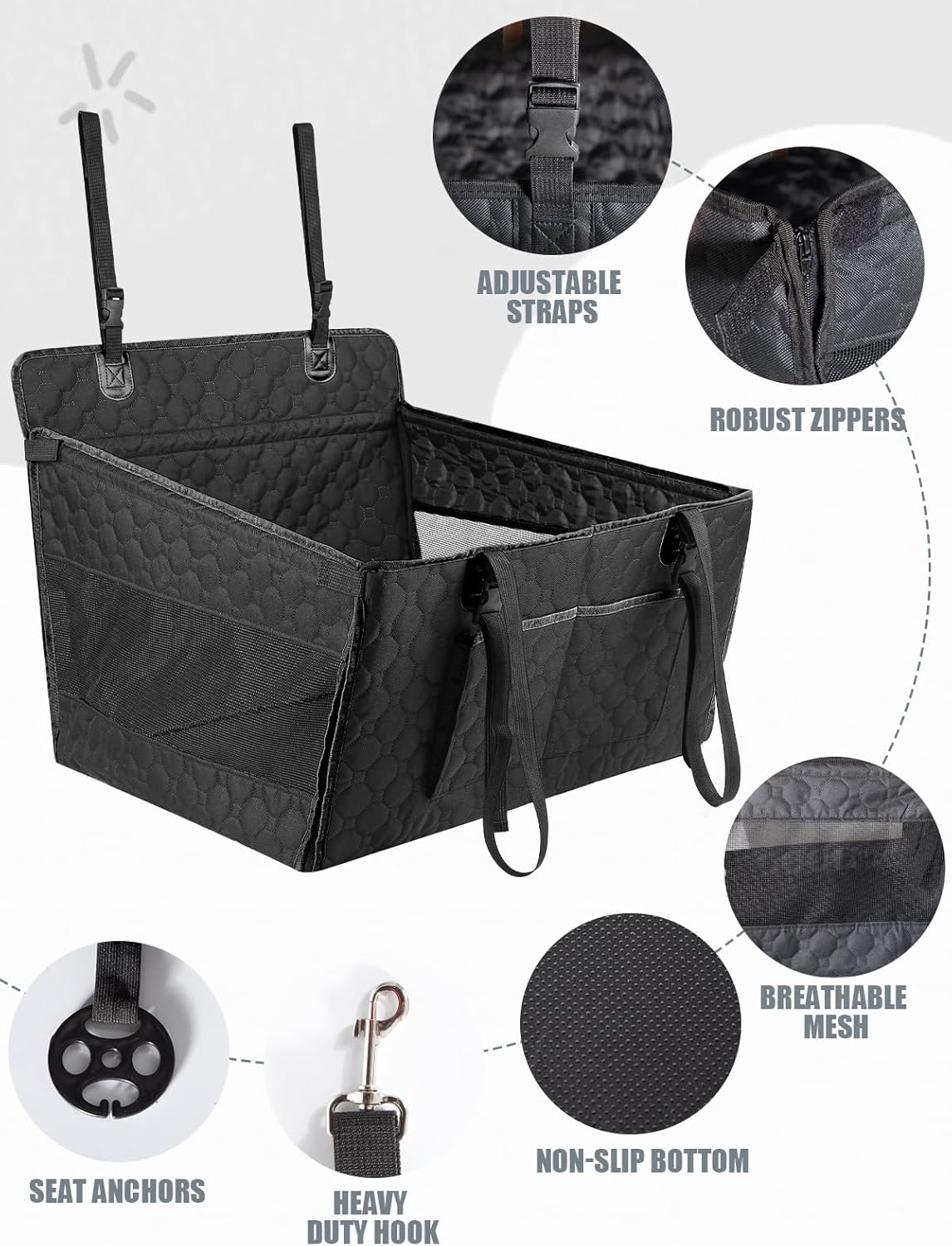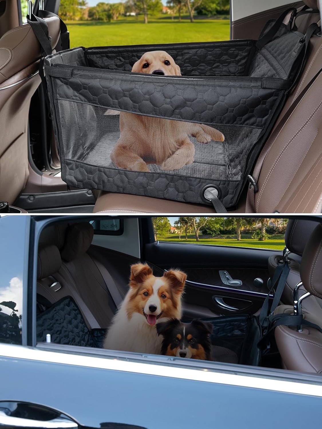 About this item 【Durable Material】The dog car seat cover for back seat is waterproof and anti-scratch.The surface material is easy to clean after getting dirty,both hand wash and machine wash are available.Non-slip design at the backing is used,the dog car seat is not easy to move,and the dog in the dog seat for car is not easy to slide.The pet car seat is made of thicker,hard-wearing oxford fabric,so it is more sturdy.High quality zipper is applied for sturdy use 【More Secure to Prevent Dog From Falling】Four hardened plates have been added to the bottom and front of the dog car seat to make the dog seat more sturdy.It can prevent falling if you brake sharply while driving.And also a seat belt for dog is provided in case that your dog move around or fall off from the dog car seat large 【Suitable For Various Sizes of Dogs】Size of our dog booster seat is 23.6*17.7*14.1 inches.Hard bottom dog seat for car are suitable for almost all sizes of dogs up to 40 LB.The back seat extender is suitable for small to large-sized dogs.Two small dogs can be rest on the pet car seat together if space is enough.Our car dog seat is designed to be suitable for most cars suvs and trucks 【Simple Installation】This dog car seat is very easy to install,just attach the bottom and front mounting plates and zipper it up.And with two adjustable straps,you can install it on the left, right or center of the back seat.This dog seat only occupy half space of your back seat.One passenger can also sit in the back and accompany with pets 【Detail Upgrade】The waterproof material on the bottom is easy to clean while preventing your pet from dirtying your seat,and the mesh design for air circulation on both sides allows your pet to breathe smoothly and see you at all times,giving your pet more peace of mind.Storage pockets on front side.It can be used for a detached harness and toys,convenient for you to put pet daily necessities to save space › See more product details