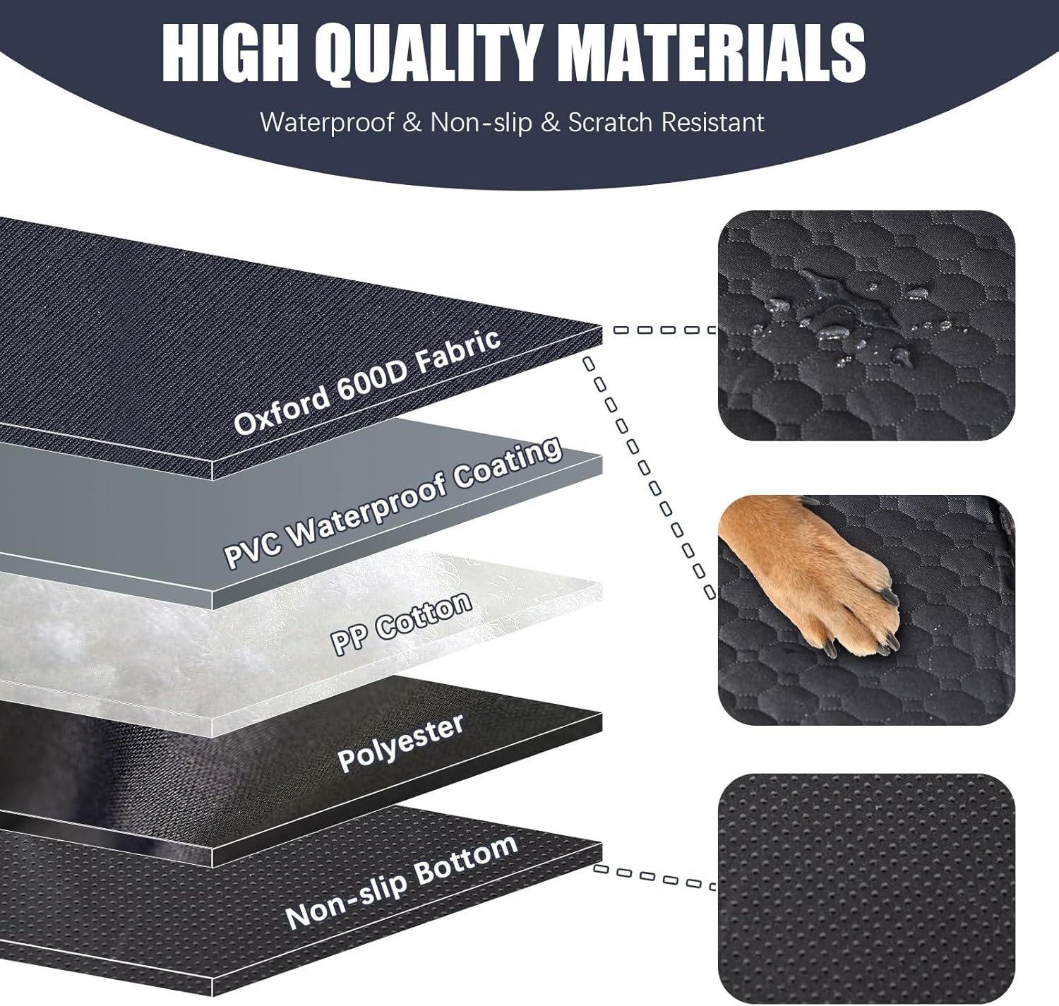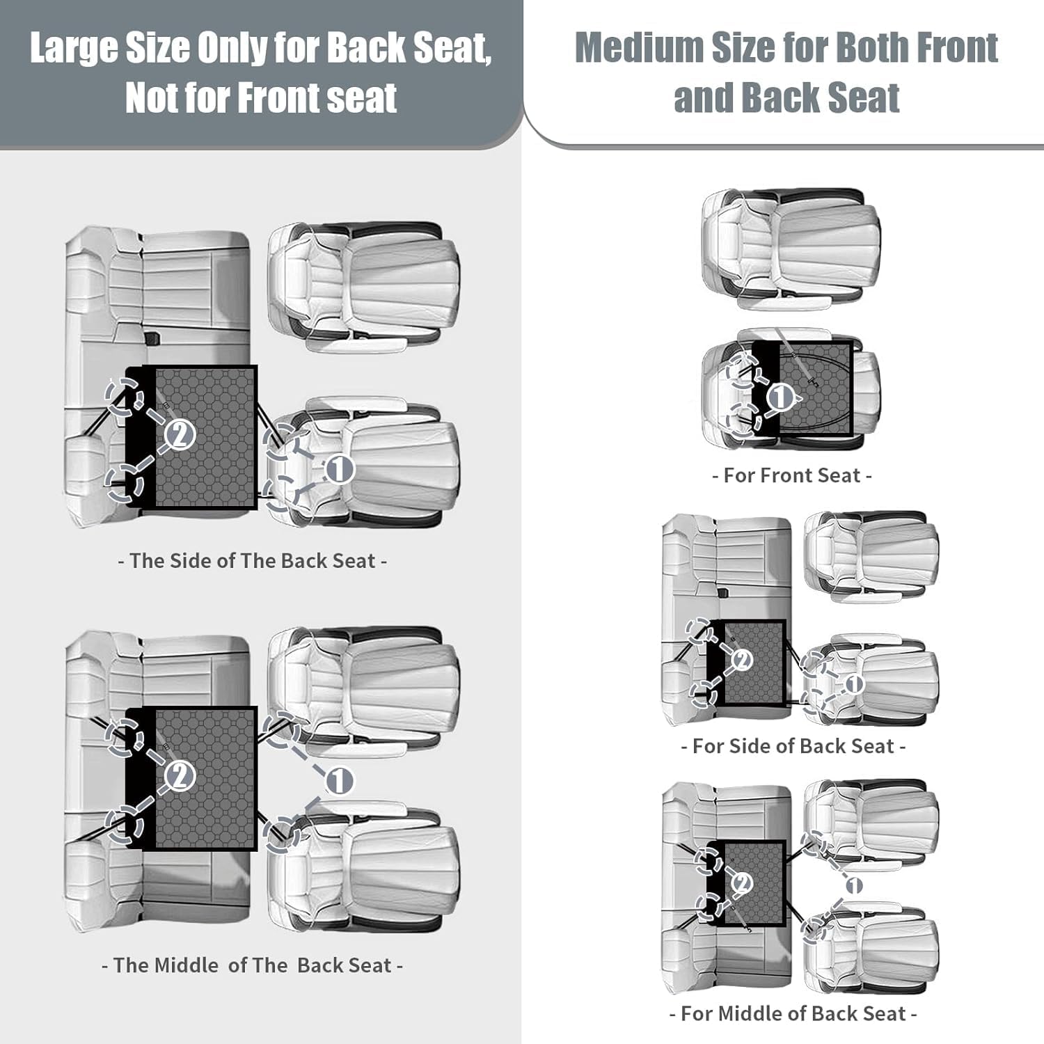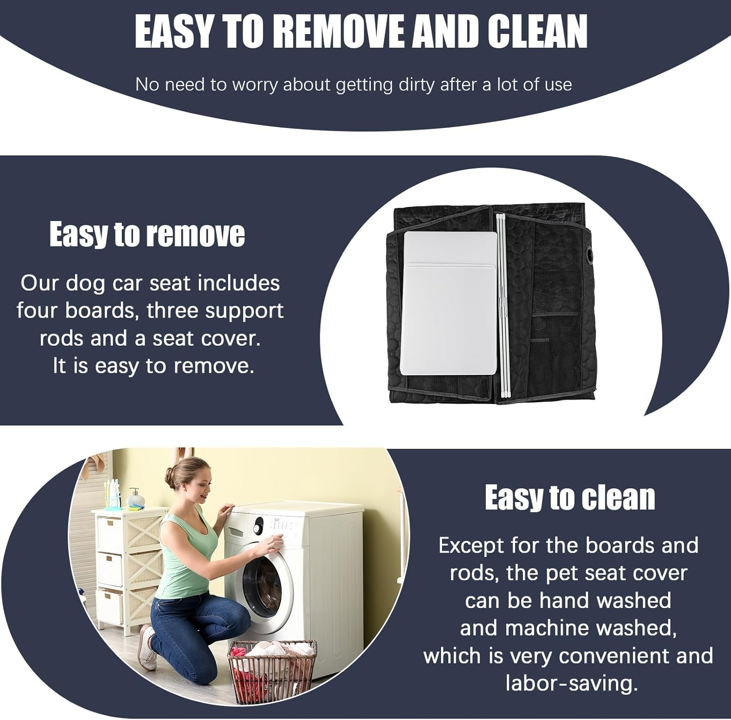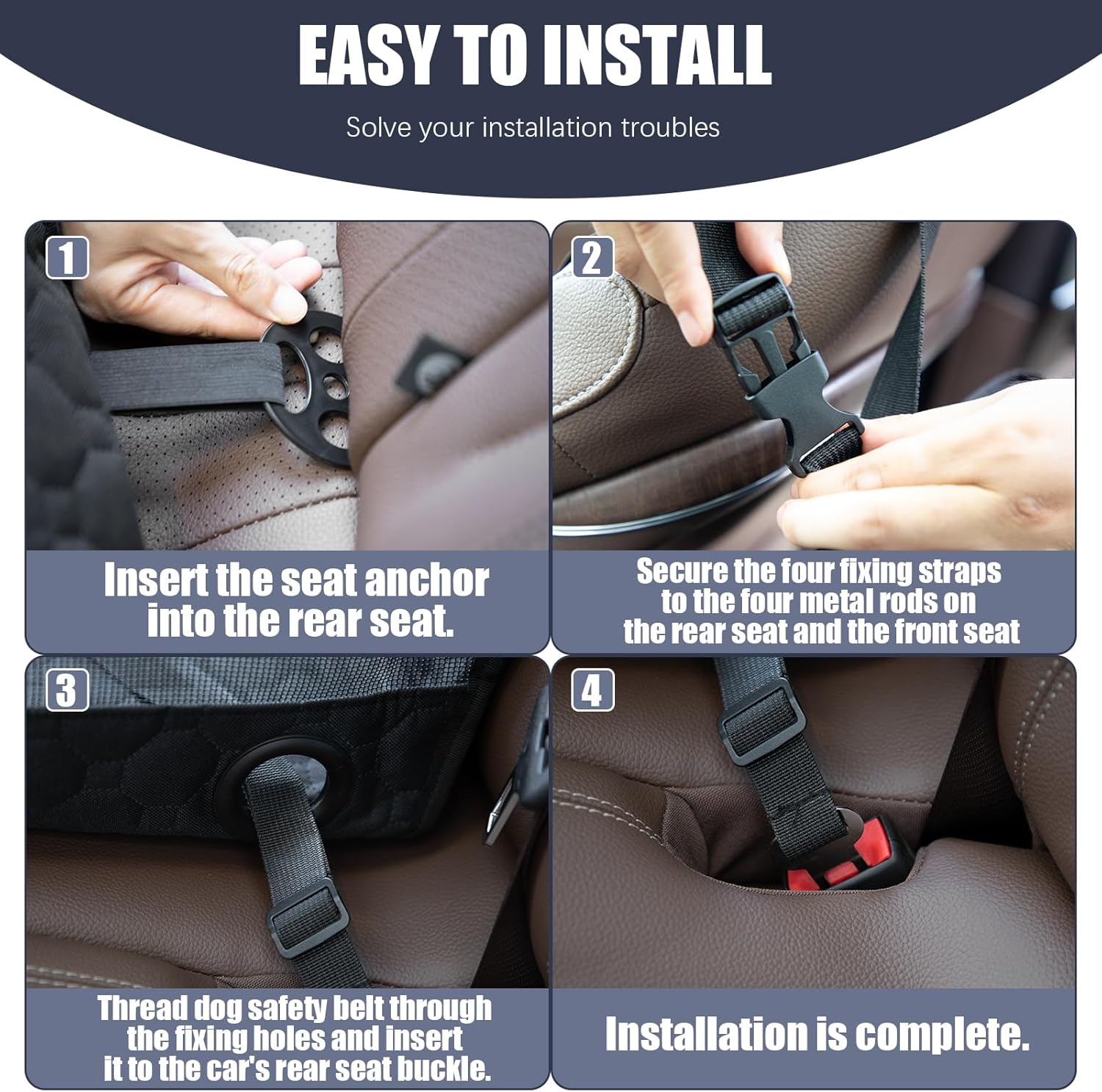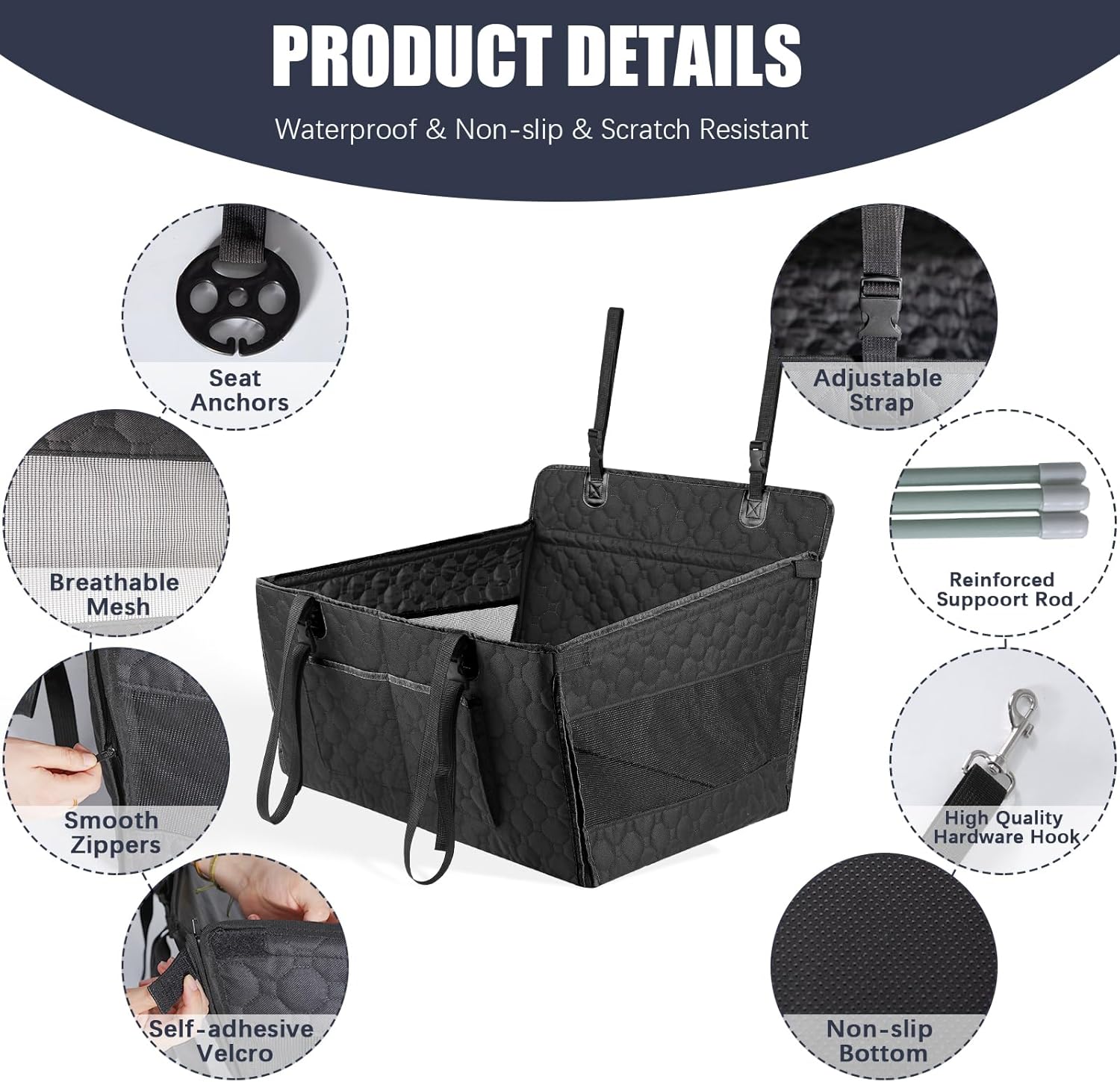 About this item 【High Quality Material】 This dog car seat cover of ours is made of high quality material, which is sturdy and durable, and also wear-resistant and non-slip. The mesh structure on the side makes this back seat cover also breathable, which can effectively keep the inside of the car seat dry and fresh, providing a comfortable journey for your pet. 【Multiple Protection】The bottom of this dog car seat has a non-slip design, which can prevent the dog seat from moving. Four boards are added to the front and bottom, and the side support poles are made of upgraded material, which makes the car dog seat more stable and sturdy. There is a dog seat belt can be attached to the car's seat belt buckle receiver, effectively preventing accidents when braking sharply or turning suddenly, and better protecting your dog's safety while driving. 【Suitable for Most Dogs】 The size of this large dog car seat is 24.4*18.5*19.6 inches, which is a bigger size for dogs of all sizes. Whether your pet is large, medium or small in size, this pet car seat of ours can provide them with both a safe and comfortable environment. This back car seat cover for dogs of ours is also suitable for all kinds of cars, suvs and trucks, which makes it more practical. This dog seat also increases the width of the car back seat, leaving more space for your dog. 【Easy to Assemble and Install】 This pet car seat cover is very easy to install. You just need to install the boards and poles inside the seat cover. Then zipper it up and the dog seat is assembled. Of course, installing it to the car seat is also very easy. Equipped with adjustable straps, you just need to wrap the straps around the car headrest. The installation process is very simple and it also can be applied to different types of vehicles. 【Protect Your Car Seat】 The bottom is made of waterproof and stain-resistant material, which is not only durable, but also effective in preventing your car seat from being scratched and soiled by your dog. The front storage poockets can be used to store dog's toys, snacks and some daily necessities. This dog car seat cover is not only protects your car seat, but also protects your dog to ensure your dog's safety while traveling. It gives you peace of mind when traveling with your dog. › See more product details