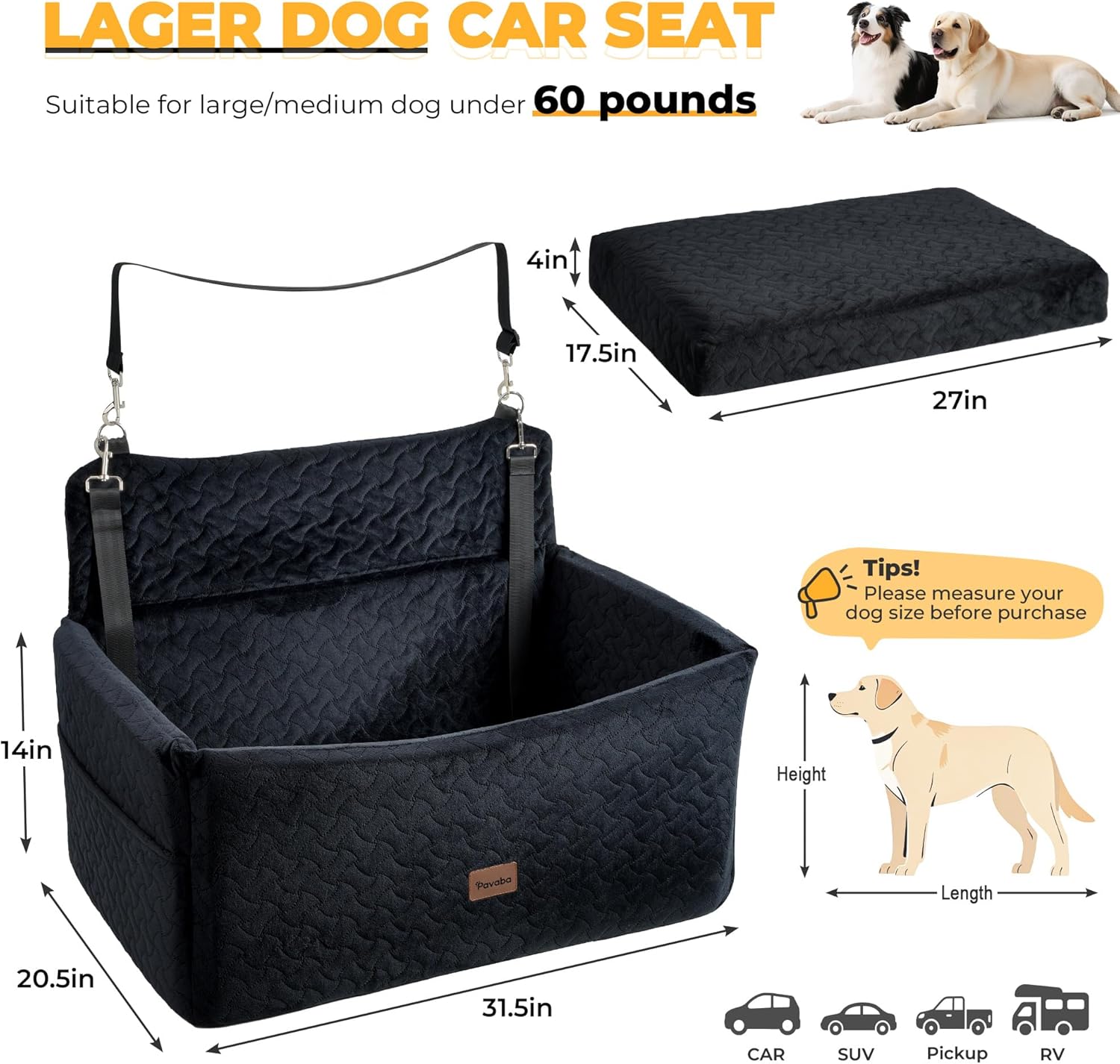 About this item Secure Dog, Safer Drive:Tired of worrying every time your dog leans too far forward? Our elevated 14-inch front wall keeps even large, restless dogs securely inside—no more sudden jumps during braking.Adjustable dual leashes are built for big pups and work seamlessly with your car’s seatbelt to lock the seat in place. The non-slip bottom adds backup support—so your dog stays safe, and you stay focused on the road. Room to Stretch, Space to Relax:Measuring 31.5" x 20.5" x 14", this oversized dog car seat fits large dogs up to 60lbs or two small pups under 25lbs. No more cramped corners—your pet can stretch, lie down, and truly relax. Perfect for sedans, SUVs, and trucks, it’s made for families who travel with more than one four-legged friend. Soft Touch Meets Thoughtful Details:Wrapped in ultra-soft short plush with a textured surface that’s both cozy and elegant, this dog booster seat elevates your pet’s comfort and your car’s style. The 4-inch thick, high-density memory foam offers plush comfort and stable support, easing joint pressure and travel fatigue. Whether your pup is napping or gazing out the window, they’ll stay relaxed, supported, and stylish all ride long. One Seat, Endless Adventures:From road trips to backyard lounging, this pet car seat transforms into a cozy travel bed or an indoor dog sofa in seconds. Whether it's secured in your car’s backseat, set up in the trunk, or placed by the fireplace at home, your dog gets their favorite spot wherever you go. Two roomy side pockets keep all the essentials—treats, toys, waste bags—ready for the next adventure. Washable & Durable with Secure Fit:Removable cover is machine washable for easy cleaning. Features anti-slip bottom + dual safety leashes + adjustable straps for triple-layer protection. Stays securely in place, even on bumpy roads. › See more product details