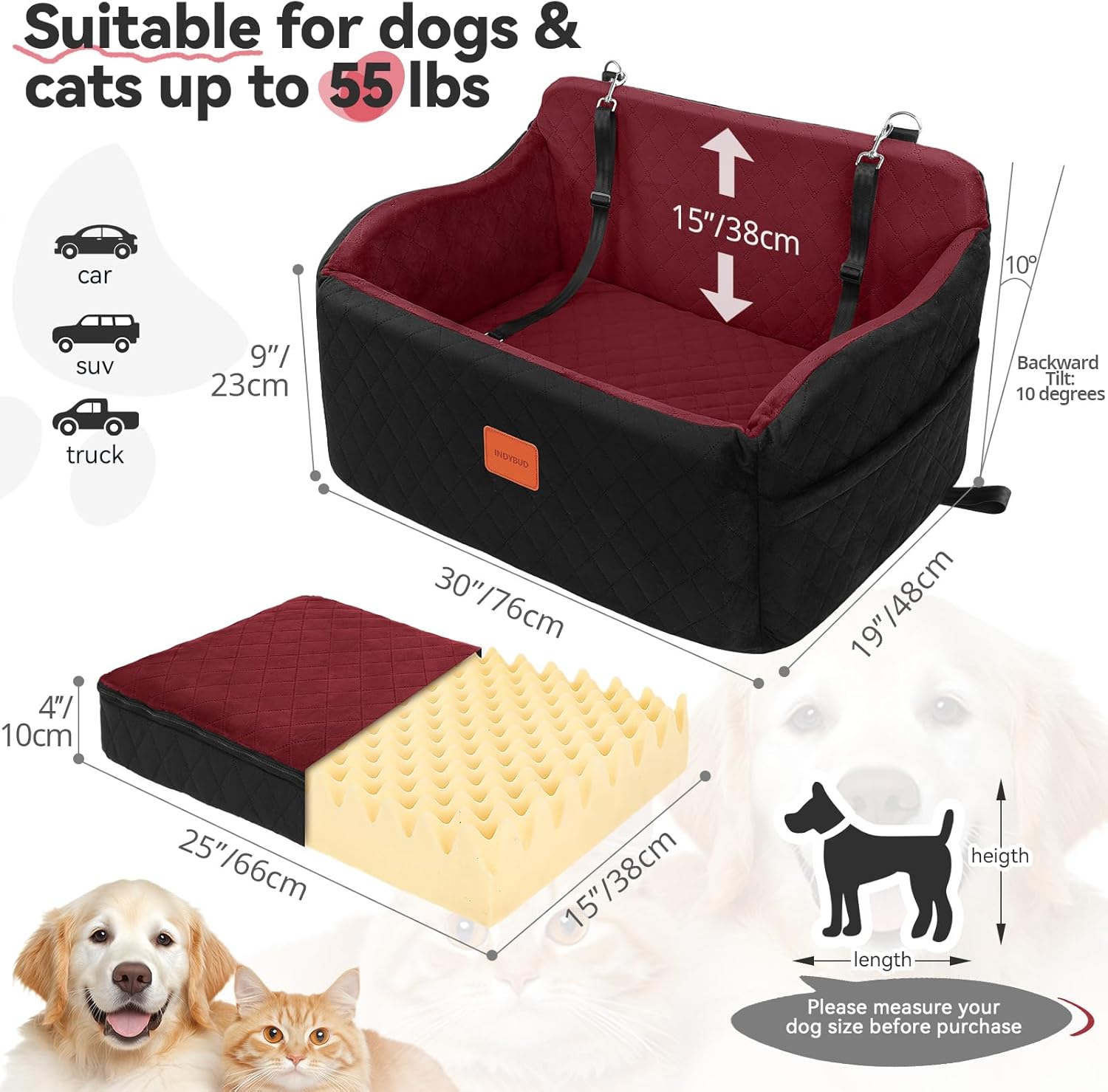 About this item Premium Material for Ultimate Comfort: The INDYBUD dog car seat is crafted from super soft short-haired fabric and high-elastic sponge, our dog car seat offers a plush and cozy environment for your pets.The soft, breathable fabric ensures comfort during long journeys, while the durable sponge maintains its shape and provides excellent support. It aims to provide pets with utmost comfort,Ideal for long car journeys,it relieves pet fatigue and anxiety Safety and Stability Assured: Safety is our top priority.The car seat features two secure safety leashes to keep your pets in place and prevent them from jumping out.Additionally, the seat is firmly fixed with straps that go under and around the car seat, ensuring it stays stable and secure during the journey.The design is completely detachable and washable,making it easy to clean and assemble. Enhanced Visibility and Reduced Anxiety: The thick, elevated cushion design allows your pets to enjoy a better view out the window, helping to reduce travel anxiety and motion sickness. Your furry friends will feel more secure and entertained, making car rides more pleasant for both you and your pets. Convenient Storage Solutions: Equipped with two spacious side pockets, this pet car seat provides ample storage for pet snacks, toys, leashes, and other essentials.Keep everything organized and within easy reach, ensuring a hassle-free travel experience. Multi-Functional Design for Versatile Use: This dog booster seat is perfect for medium to large dogs or two small dogs, fitting seamlessly into the back seat or trunk of your car.It's not just a car seat. It doubles as a portable dog bed for use at home,or camping, making it a versatile addition to your pet's accessories. › See more product details