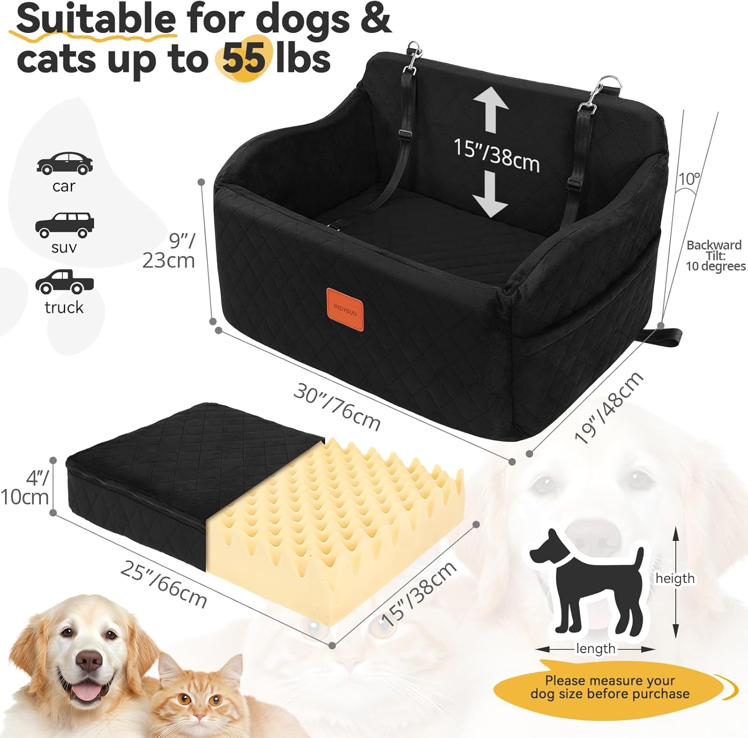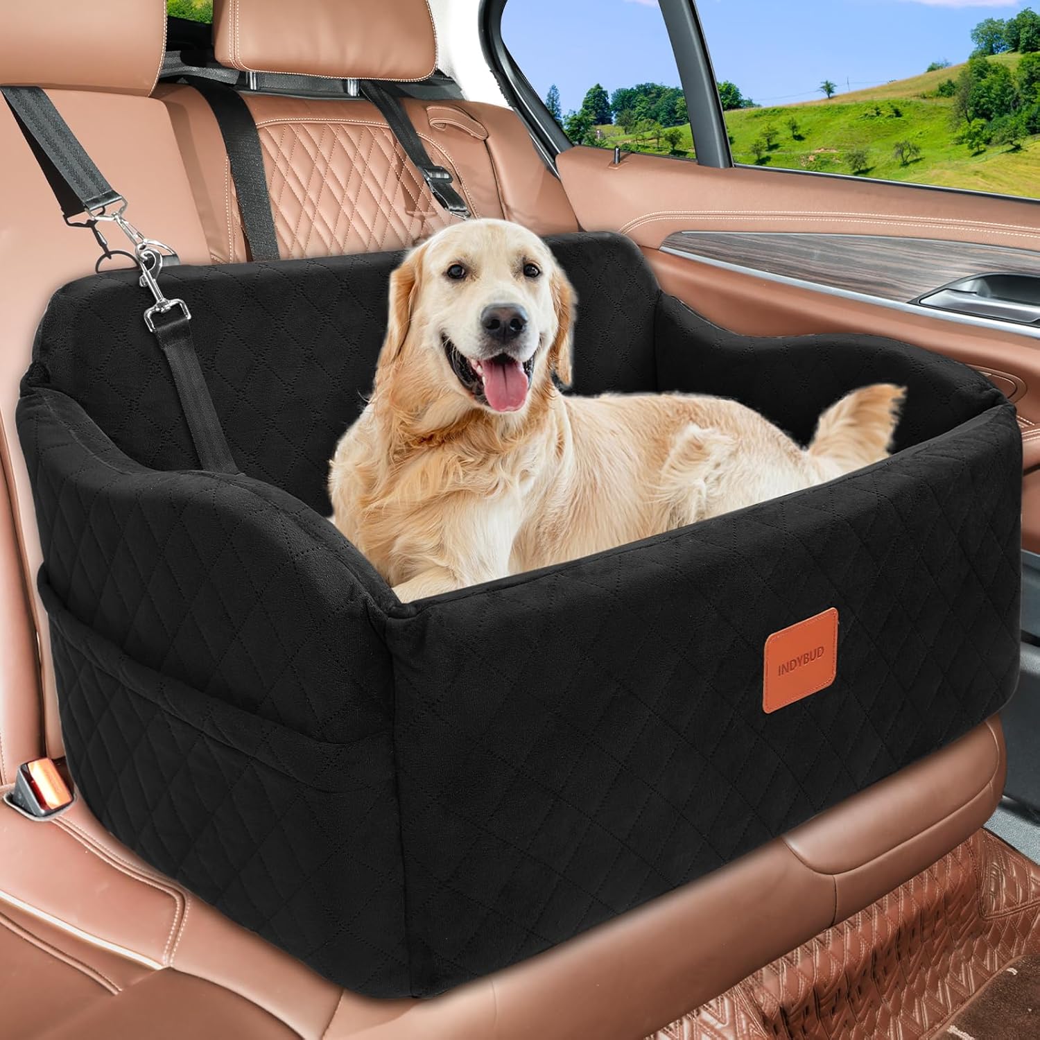 About this item Premium Material for Ultimate Comfort: The INDYBUD dog car seat is crafted from super soft short-haired fabric and high-elastic sponge, our dog car seat offers a plush and cozy environment for your pets.The soft, breathable fabric ensures comfort during long journeys, while the durable sponge maintains its shape and provides excellent support. It aims to provide pets with utmost comfort,Ideal for long car journeys,it relieves pet fatigue and anxiety Safety and Stability Assured: Safety is our top priority.The car seat features two secure safety leashes to keep your pets in place and prevent them from jumping out.Additionally, the seat is firmly fixed with straps that go under and around the car seat, ensuring it stays stable and secure during the journey.The design is completely detachable and washable,making it easy to clean and assemble. Enhanced Visibility and Reduced Anxiety: The thick, elevated cushion design allows your pets to enjoy a better view out the window, helping to reduce travel anxiety and motion sickness. Your furry friends will feel more secure and entertained, making car rides more pleasant for both you and your pets. Convenient Storage Solutions: Equipped with two spacious side pockets, this pet car seat provides ample storage for pet snacks, toys, leashes, and other essentials.Keep everything organized and within easy reach, ensuring a hassle-free travel experience. Multi-Functional Design for Versatile Use: This dog booster seat is perfect for medium to large dogs or two small dogs, fitting seamlessly into the back seat or trunk of your car.It's not just a car seat. It doubles as a portable dog bed for use at home,or camping, making it a versatile addition to your pet's accessories. › See more product details