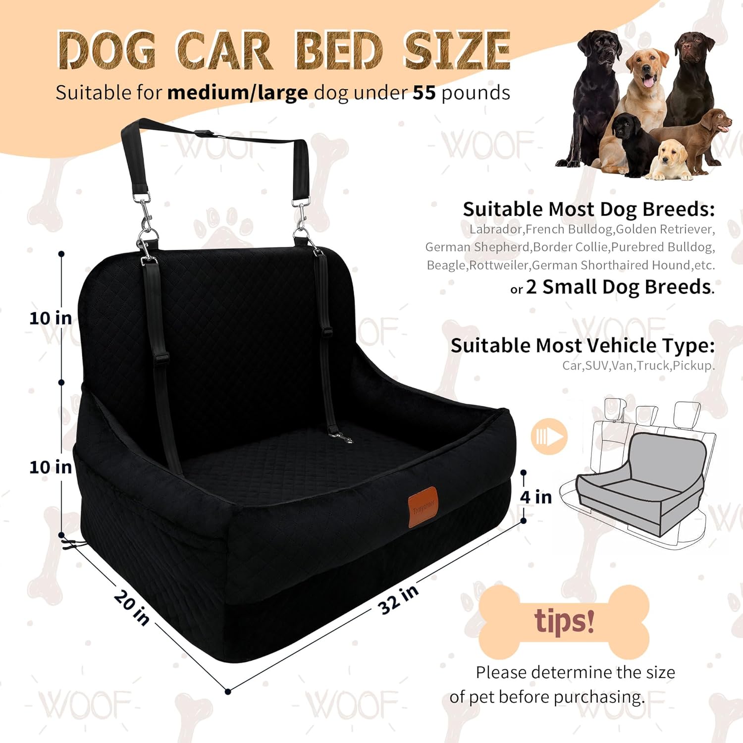 About this item 【INTRODUCTION】This dog car seat specially designed for medium/large dogs up to 55 lbs.It is sewn with velvet fabric and memory foam.Can also suitable for 2 small dogs under 25 pounds.Super comfy and fits well. 【FUNCTIONAL】The dog booster seat is suitable for the back seat and can also be installed in the trunk.Interior height 4 Inches,Your furry friend can looking out the window or take a nap.it is essential pet travel car bed when going out and can used indoors or outdoors. 【SECURE】Dog car bed has non-slip bottom and is equipped with 2 seatbelts,which are perfectly combined.The seat is providing the constraint and safety,You don’t have to worry about their safety and can focus on driving,enjoyed the ride. 【SIMPLE】Easy to install,just put the car seat belt through the seat belt hole at the back of the car dog seat and insert it,the upper straps go around the headrest and adjusting length. 【MAINTAINABILITY】Easy to clean,periodic cleaning of the car dog bed is good for pet health,open the zipper and take out the sponge to machine or hand wash the dog car seat cover. 【REMIND】Due to the need for long-distance transportation, the dog car seat is vacuum-packed.Be careful not to cut the dog car seat with a knife when opening the package.After taking out the dog car bed, it needs to be left for 12-24 hours to restore its shape. › See more product details