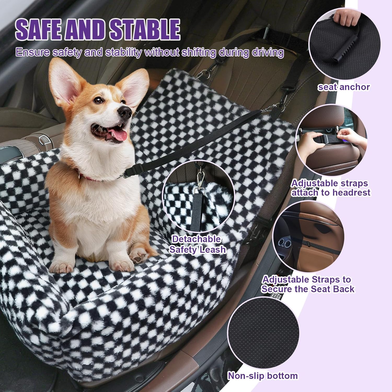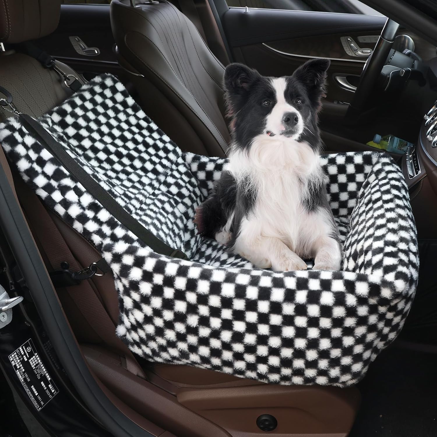 About this item 【SOFT,COMFORTABLE】The dog car seat is made of soft plush fabric with stylish checkered pattern,providing a soft resting environment for your pet.The size of the puppy car seat is 20.47"L x 15.8" W x 9.84"H,suitable for small and medium-sized dogs and cats weighing under 30 pounds(such as Chihuahua, Pomeranian,York dogs and so on). This pet car seat is suitable for almost all models of cars, trucks, and SUV 【SAFETY,DURABLE】The bottom of this puppy seat is made of anti slip fabric, which can reduce the sliding of the pet seat. This helps alleviate pet anxiety. Three safety belts have been added to the back to secure it to the front seats. And added a leash to secure the dog. Prevent dogs from jumping out of the window or affecting the driving safety of the driver's seat 【EASY TO CLEAN】Our dog car seats are detachable, and the filling PP cotton on the bottom and sides can be easily removed through zippers. The entire dog seat can be machine washed, making cleaning easier. And the dog car seat bed is also easy to assemble, making your pet's travel more comfortable.(Note: The inner PP cotton is not washable.) 【2-IN-1 DESIGN】Our pet seat can not only be used as a safe car dog seat for travel, placed in the front seats, back seats, and simple seats in the trunk of the car, but also as a pet bed for home use, whether you place it on the floor, sofa, or bedroom. Ensure that your pet friends enjoy the most comfortable experience in various environments. 【SALES SERVICE &IDEA GIFT】We are committed to serving every pet dog seat friend well!If you have any questions about our dog car seat, please feel free to contact us at any time. We will provide you and your furry friends with the highest quality service.This dog seat is also a gift for your furry friends for birthdays, Christmas, and New Year! › See more product details