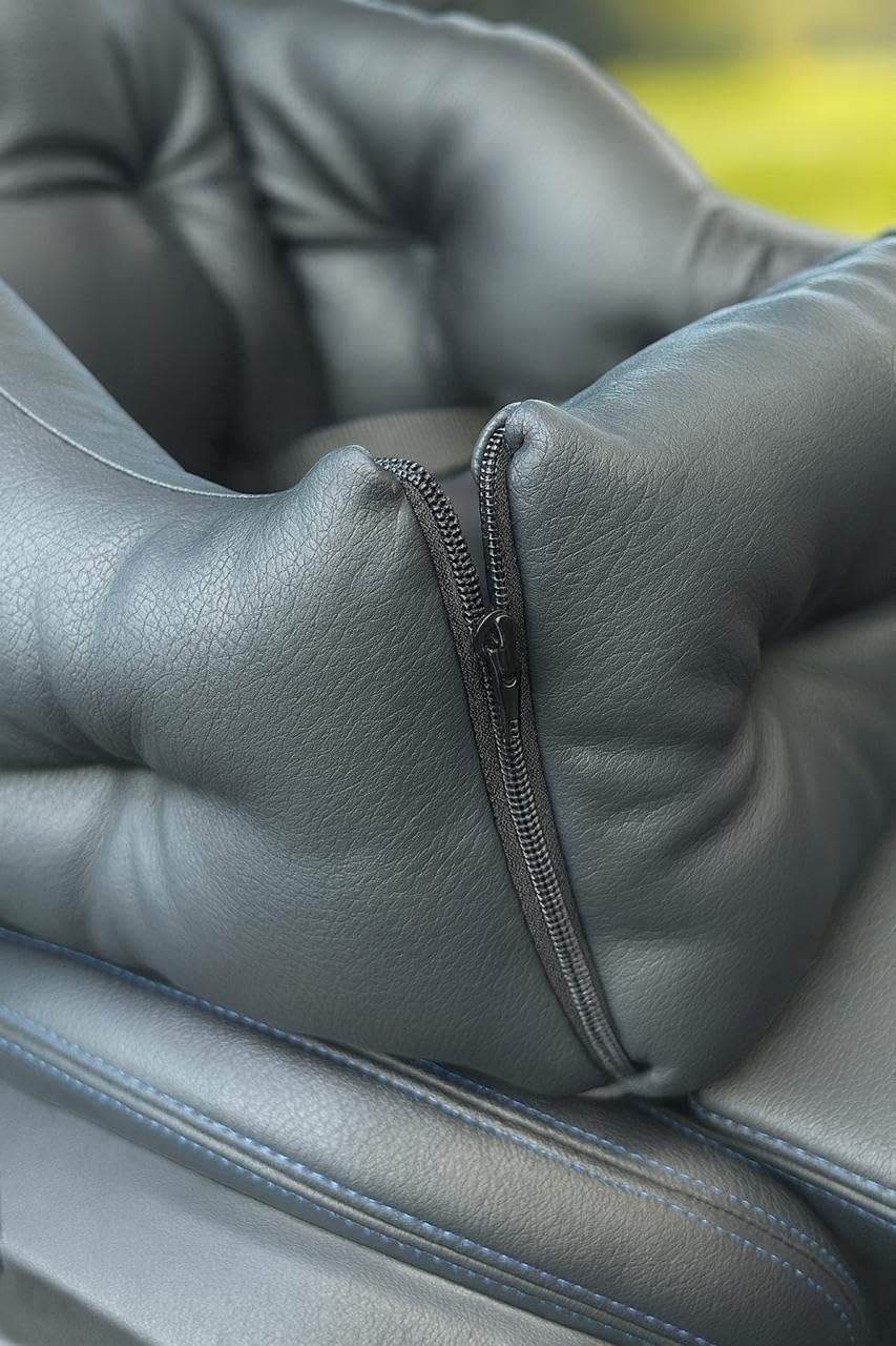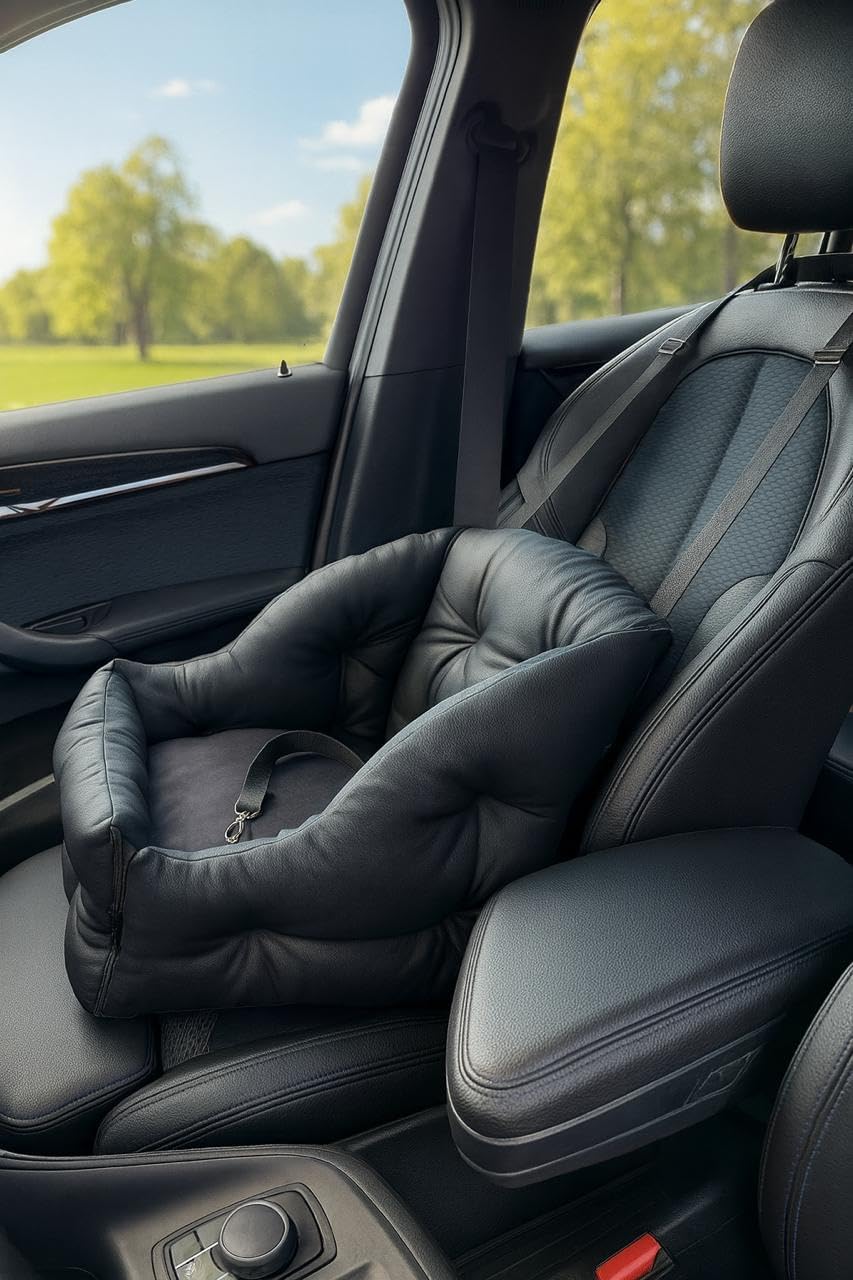 Luxury Handmade Dog Car Seat (Black)Give your small dog the comfort and safety they deserve with this handmade eco-leather booster seat. Designed for Pomeranian, Chihuahua, Yorkie and similar breeds, it keeps pets secure and cozy on every ride while blending seamlessly with modern black and tan car interiors.Fits Small Breeds: Ideal for Pomeranian, Chihuahua, Yorkie, and other small dogs. Keeps pets safe and comfortable on every trip.Luxury Handmade Design: Eco leather with premium padding and elegant car-like stitching for a stylish travel experience.Built-In Safety Harness: Integrated strap helps prevent jumping or injury during sudden stops—more peace of mind for pet parents.Portable Travel Bed: Lightweight and doubles as a cozy bed for hotels, cafes, or home. Easy to carry and store.Easy to Install & Clean: Secure straps fit most car seats. Removable cover allows quick spot cleaning and hand wash.Use Anywhere: Road trips, vet visits, errands—your pet always has a comfortable, familiar place to rest.What’s Included: Dog car seat + integrated safety strap.Tip: For best safety, attach the strap to a pet harness rather than a collar.