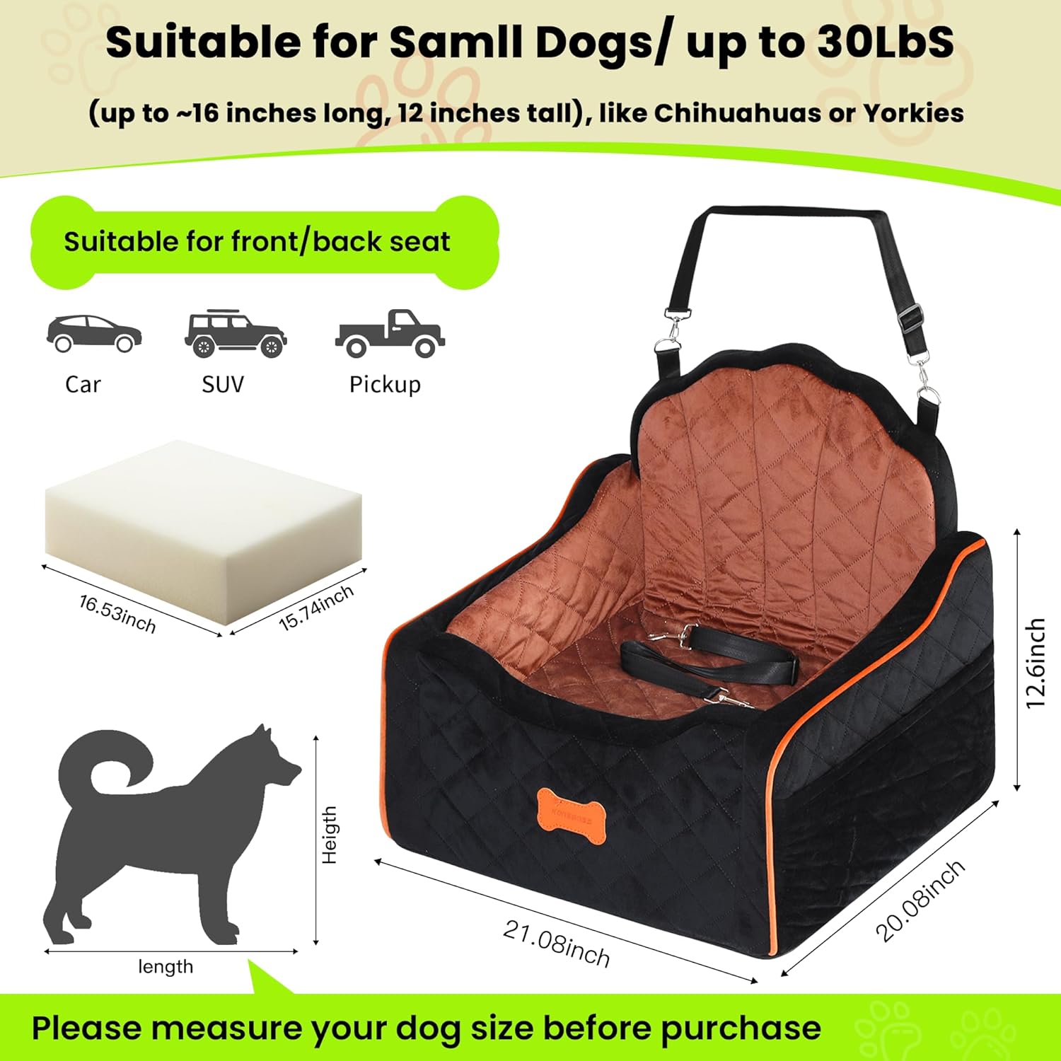 About this item Secure Travel Protection for Your Pet -This dog car seat—a premium dog booster car seat and essential dog travel accessory—prioritizes safety on every journey. Secured via car seat belt, headrest strap, and an included safety leash (attaches to your pet’s harness), it prevents movement during driving, keeping your furry friend protected. Whether you need a car seat for dogs or a cat car seat, this design ensures stability, making it a must-have for dog travel safety. Perfect Fit for Small Pets Under 30lbs -Measuring 19.7×19.4×12.5 inches, this small dog car seat (and ideal puppy car seat) fits seamlessly in cars, trucks, and SUVs. Designed as one of the most reliable dog car seats for small dogs (and dog carseats for small dogs), it’s easy to install in front or back seats—doubling as a front seat dog car seat when needed. While tailored for small pups, its sturdy build also works for petite cats, earning its place as a versatile pet car seat. Plush Comfort in Every Ride -Your pet deserves the best, and this dog car seat delivers with ultra-soft short plush surfaces and high-density sponge filling. More than just a car dog seat, it reduces bump impact, ensuring a cozy ride for small dogs and cats alike. Whether used as a dog seat for car or a travel bed, its comfort rivals your pet’s favorite at-home spot. 2-in-1 Versatility Beyond the Car -This isn’t just a dog booster seat—it’s a multi-use essential. With dual side storage pockets for toys and supplies, it’s perfect for on-the-go. Remove the belts, and it transforms into a dog bed for car, car dog bed, or dog car bed—use it at home, outdoors, or in tents. For pet parents seeking flexibility, this dog carseat blends travel convenience with everyday comfort. Hassle-Free Cleaning for Fresh Rides -Maintaining your dog car seat is simple: the fully detachable design lets you unzip the bottom, remove the sponge, and machine-wash the fabric cover. Whether you’re caring for a small dog car seat or a pet car seat used daily, this easy cleanup ensures your car seat (and your car) stays fresh—no matter how messy your adventurer gets. › See more product details