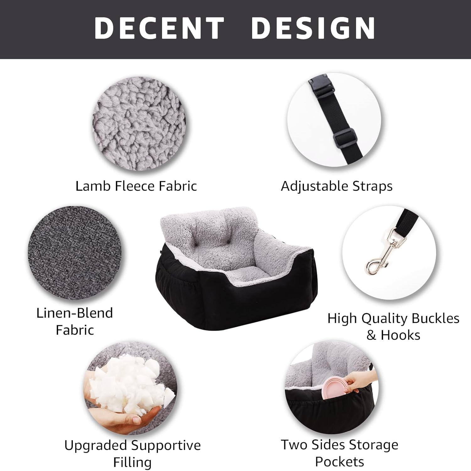 About this item : Your pet's safety comes first. Adjustable straps with sturdy buckles and snap-hooks (hold up to 100 lbs) secure the seat, preventing escapes or forward movement during sudden stops. : Two-sided comfort for all temps—one side features plush sherpa fabric, wrapping your pet in cozy warmth during chilly days; the other side is breathable cotton-linen, delivering refreshing coolness when it’s hot. Flip easily to keep your pet comfy year-round. : Fully machine-washable. Detachable bottom cushion for separate cleaning. Double-sided design: breathable Oxford for summer, warm velvet for winter. : 23(L)x22(W)x10(H) inches. Perfect for small/medium dogs under 30 lbs (e.g., Chihuahua, Pomeranian). Fits most vehicles: cars, trucks, SUVs. : Doubles as a secure car seat and cozy home bed (floor/sofa). Dual straps fit front/rear seats for flexibility. 2 side pockets add handy storage for easier travel. › See more product details