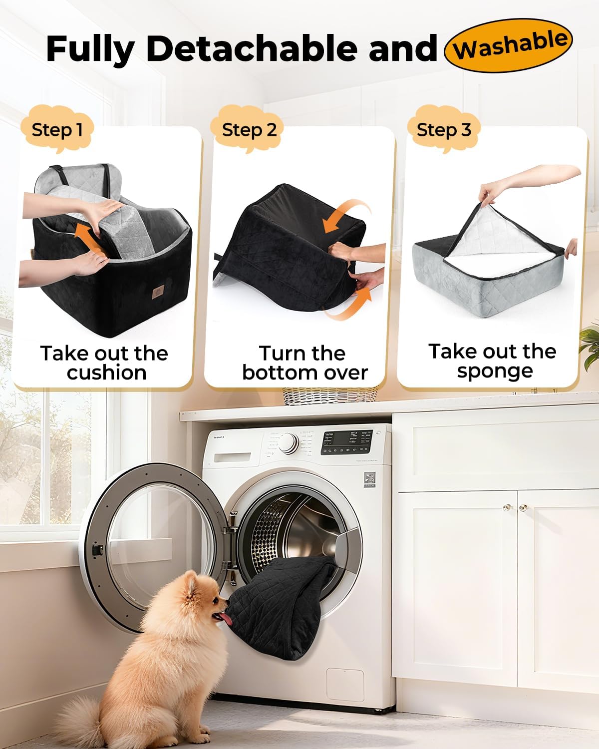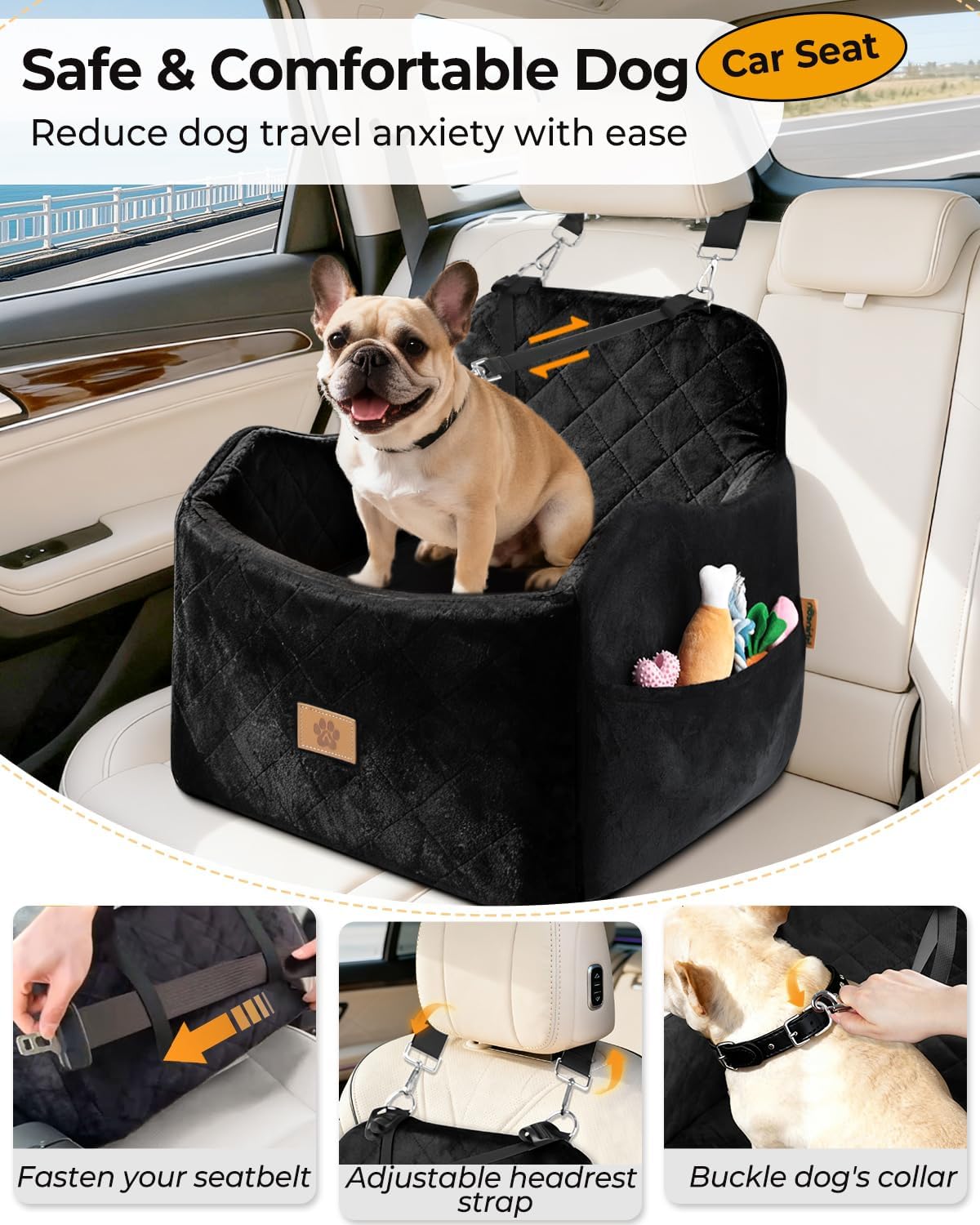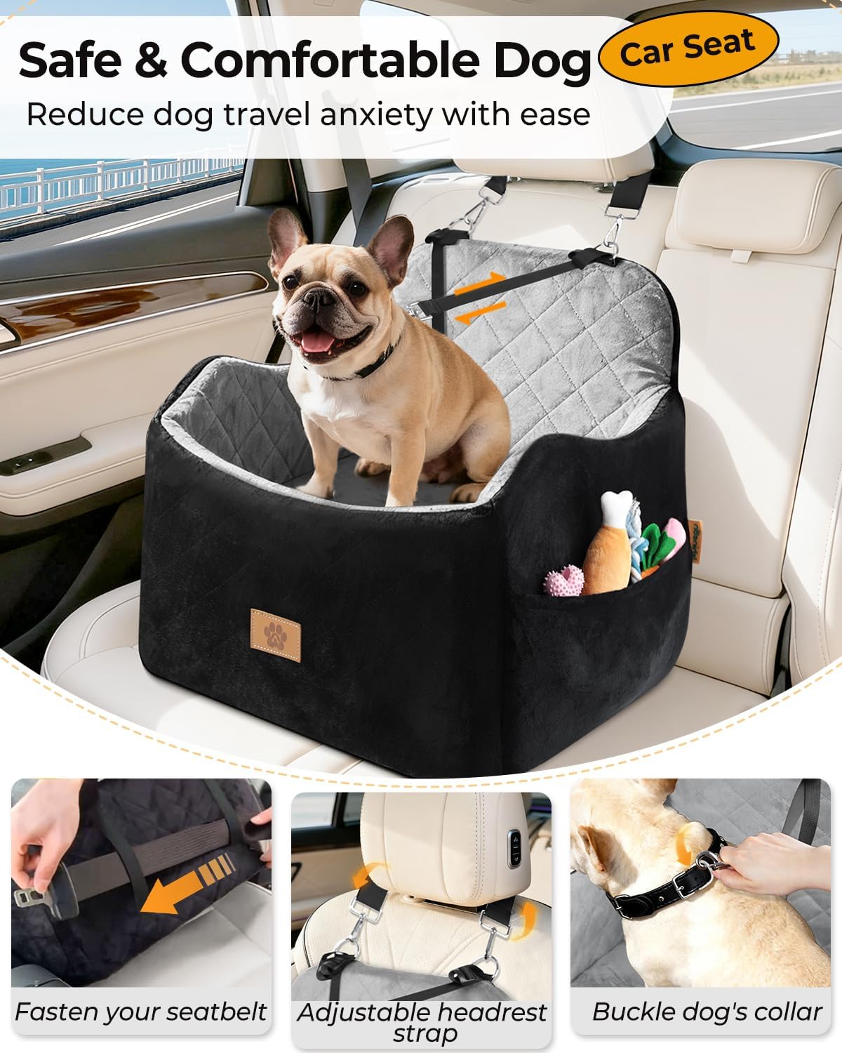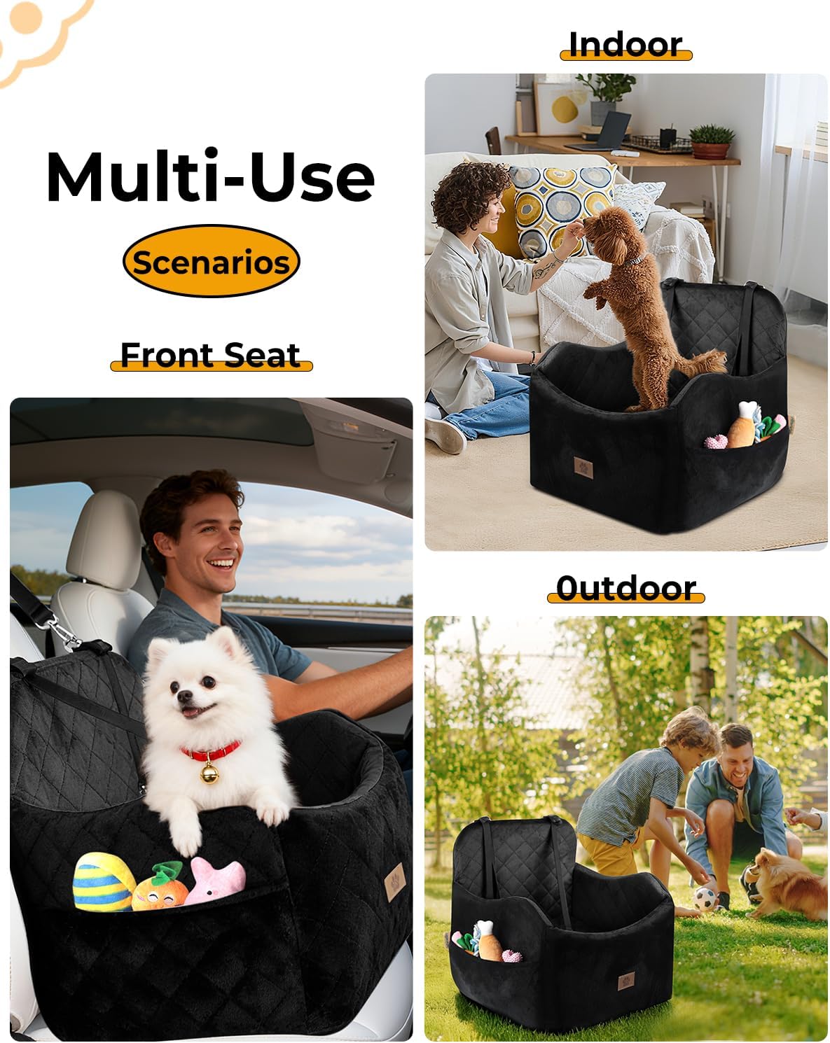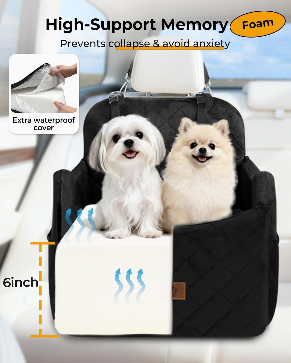 About this item Premium Dog Car Seat with Enhanced Safety:Upgrade your pet's car travel experience with our adjustable leashes that extends up to 23.62" (60 cm). This design keeps your pet firmly in place, preventing accidents and ensuring safety. The elevated 6-inch cushion offers a wider view of the window outside, reducing travel anxiety. Reinforced back strap, headrest straps,and non-slip bottom keep pet car seat stable, ensuring a safe and comfortable journey for your beloved pet. Luxurious Dog Carseat with Ultimate Comfort:Dog car seat for small dogs features 30D high-density memory foam in the interior, providing exceptional weight support that outperforms eggshell foam and effectively reducing the impact of road bumps,. Your pet can relax on the armrest without the dog car seat medium sized dog collapsing. The ultrasonic crystal velvet fabric is soft and gentle, creating a cozy environment for your furry friends. Optimal Size Dog Car Seat for Medium Dogs:Measuring 20” (L) x 20” (W) x 20” (H), Ishineon car seats for dogs is perfect for medium and small size dogs (up to 35 lbs) or two small dogs (under 15 lbs each). Breeds suitable for this car seat include Yorkshire Terriers, Schnauzers, Corgis, French Bulldogs, Chihuahuas, Pomeranians, Dachshunds, Shih Tzus, puppies, cats, and more. Measure your dog before purchasing to ensure the best fit. No Assembly Required and Waterproof: Our dog car seat for 2 small dogs is vacuum-packed for convenience. After unboxing, we recommend allowing 24 hours for the sponge to fully expand and reach its optimal shape before use. Featuring high-quality 30D sponge, it offers excellent resilience—no sagging, no flaws, and no fabric wrinkles. Upgraded waterproof cover to protect the seat cushion from getting wet. Choose us, and you’ll get a premium-quality dog car seat for 2 dogs that stands out for durability and comfort. Easy Installation Dog Bed for Car:Our dog seat for car installs in just four simple steps. Puppy car seat cover is fully detachable and washable, making it easy to clean and assemble. Dog booster car seat is designed to fit in the front /back seats, or trunk and works for almost all types of vehicles,cars,trucks and SUVs. Traveling with your family furry friend has never been simpler or safer. Multi-scenario Use: Perfect for car rides and more, small dog car seat serves as a cozy dog bed or sofa for sleep rest in home bedrooms, living rooms, outdoor spaces, camping trips, or anywhere your paw doggy needs a comfortable place to rest. Two large storage pockets on dog car booster seat sides keep your dog’s food, toys, and supplies close by. › See more product details