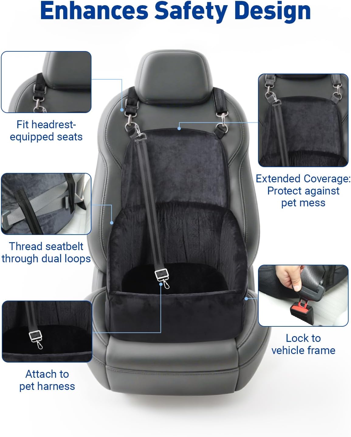 About this item Superior Stability: Back dual loops work with your car's seatbelt to securely hold pets under 30 lbs, minimizing movement during stops or swerves. The inner high-elastic sponge acts as a shock absorber, softening road bumps and hugging their body for joint protection and consistent comfort Extended Guard & Universal Fit: Our dog car seat features an extended back crafted from double-layer soft fabric. This design offers significantly greater protective coverage and guards against dog hair, saliva, and paw prints. Fits front or back seats in most sedans, SUVs, and trucks Convenient Installation: This 18.5"L × 18.5"W × 22"H dog booster car seat arrives vacuum-packed and reaches full shape in 24 hours. After opening, slide the cushion inside, clip the two adjustable straps, and tighten for a snug, secure fit.For enhanced stability, thread your vehicle's seatbelt through the reinforced back loops to distribute force and lock the base securely Easy to Clean: The cover is fully removable. Simply unzip the base, remove the inner sponge cushion, and machine-wash the cover. (Note: Do not wash the sponge insert.) With waterproof fabric on the non-slip base, the puppy car seat effortlessly wipes clean for quick maintenance Multi-Purpose Use: Ideal for pet families! Perfect for cars, homes, outdoors, or camping. Features large-capacity side pockets to store treats, kibble, and must-haves. Keeping your pet comfy and gear organized on every adventure › See more product details