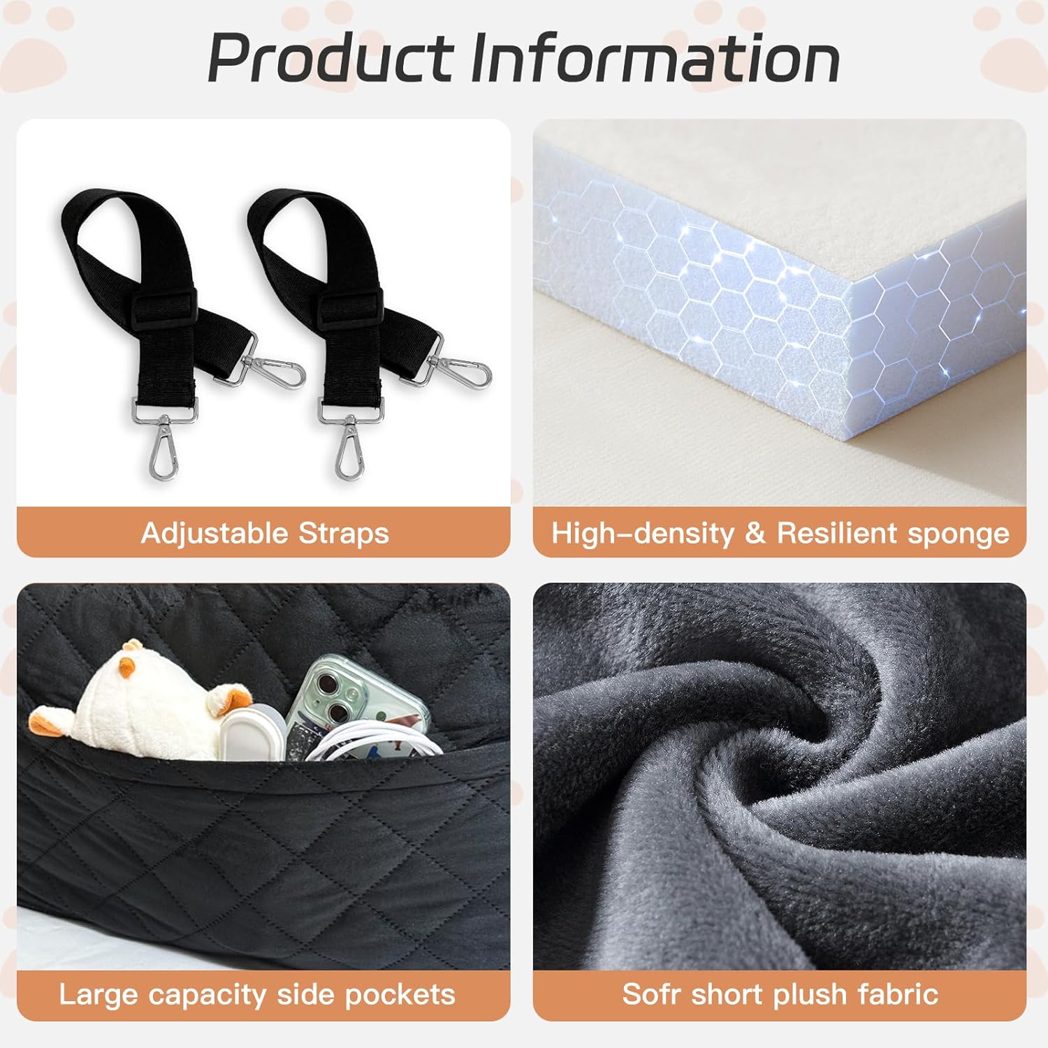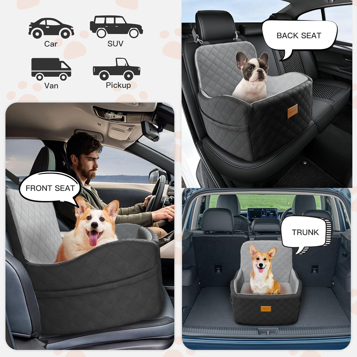 About this item Enhanced Safety Features: This small dog car seat is designed with adjustable safety straps and a secure harness channel at the bottom to ensure your pet stays safely in place during travel. Two safety belts prevent your dog from jumping out, offering peace of mind for both pet and owner Comfortable Design for Your Pet: Featuring a soft, plush surface and filled with high-density foam, this booster car seat provides superior comfort, reducing the impact of road bumps and giving your dog a more enjoyable, relaxing ride. Travel car seat with a 4-inch raised bottom also helps relieve anxiety by allowing your pet to see out the window Easy to Clean & Seamless Bottom Design: The dog car seat cover is fully detachable and washable, making it simple to keep clean and fresh. the bottom of the cushion is fully connected, preventing small items from falling through, protects paws from slips, and traps loose fur to avoid buildup in the car dog bed below Pet Car Seat for Small Dogs & Cats: This pet car seat (19" L x 18" W x 18.5" H) is ideal for small dogs and cats up to 35 lbs, adapts to nearly any vehicle—cars, trucks, or SUVs. Installation is quick—just thread the seat belt through the designated holes, secure the straps, and adjust for a perfect fit Multi-Functional Use: Beyond car rides, this versatile dog bed for car can also be used as a comfortable pet bed at home, in tents, or outdoors. It doubles as a car seat protector, shielding your car from scratches, dirt, and fur, while also offering convenient storage pockets for toys and treats › See more product details