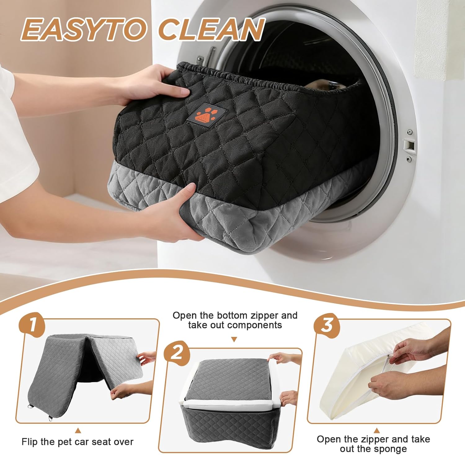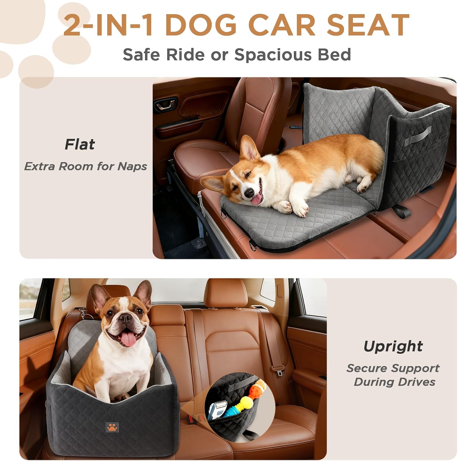 About this item : This item is not only a small dog car seat, but can also be changed into a dog sofa or dog bed to use at home or outdoor. Just open the side zipper and put down the back cushion or fold it into the bottom, the small dog car seat can become a dog sofa/bed to make your furry friend feel comfy outdoor or prevent your sofa from getting dirty. : Featuring a raised design, this pet car seat elevates your pet 4 inches above the vehicle seat, allowing them a better view of the outside world and helping to reduce travel anxiety. Whether it's a quick trip to the vet or an extended road trip, your dog will appreciate the added comfort and feel more relaxed in the car. : Car seat for dogs measuring 20 inches in Length, Width, and Height, dog carseat provides plenty of room for up to two small puppies or one medium-sized dog under 35 lbs. This dog car seat medium sized dog is engineered to fit nearly all types of vehicles, including cars, trucks, SUVs. And can be easily installed in either the front or back seat according to your preference. : Your pet's safety is our priority. This dog car seat comes with adjustable safety tethers, a shoulder strap, and integrated harness access. It helps keep your pet secure and comfortable while minimizing distractions for the driver. : Designed with two-sided versatility, this dog car seats for small dogs features a soft, short plush fabric on one side and breathable, comfort-focused faux leather on the other. This dual-material construction ensures your furry companion stays cool in summer and warm in winter, offering comfort all year round. The high-density memory foam filling provides superior support, reducing the impact of road bumps and vibrations for a smoother, more pleasant ride for your pet. : Installing the dog booster seat is straightforward. Just thread the car's seatbelt through the designated openings on the base and attach the top strap to the vehicle's headrest. Adjust the straps to the correct length, and the seat is ready for use! The removable cover is easy to unzip, making it simple to wash and keep your dog's car seat clean. › See more product details