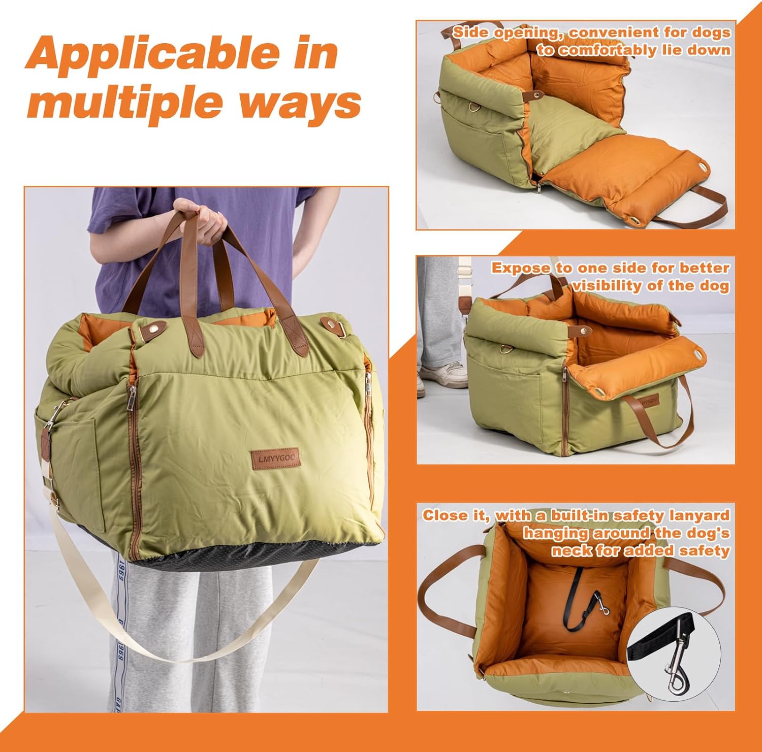 About this item Waterproof & Durable Tech Fabric:LMYYGOO dog car seat and bed made of advanced fabrics—waterproof, easy to clean, non-scratch risk and built to withstand outdoor adventures. Multi-Layer Safety Protection:Dog car seats for small & medium dogs features thickened padding for impact reduction, non-slip base, and adjustable safety leashes slots for all-around security. Ultimate Comfort for Relaxation:Generously padded on all sides with PP cotton, the expandable design-unzip the front edge for more space, reduces pet anxiety and fatigue, providing a cozy sleep and rest spot indoors or outdoors. Portable with Smart Storage: Includes a reinforced handle for easy carrying, side pockets for toys and snacks, and a fully removable, machine-washable design; compact size fits small to medium pets and most car seats. Stylish & Seamless Design: Offers chic color options that blend elegantly into any car interior or home decor, combining luxury with functionality for discerning pet owners. › See more product details