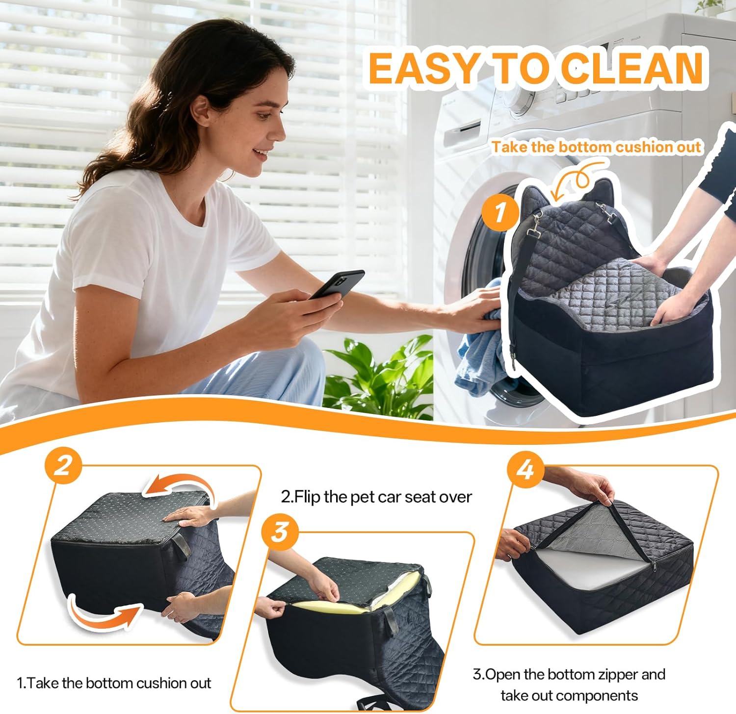 About this item 【Idea for Small/Medium dogs】Measuring 19.7 in (L) X 19.4 in (W) X 12.5 in (H), the pet car seat can accommodate all types of small and medium dogs up to 30 lbs, or two small dogs up to 15 lbs. It fits in the front or back seats of cars, SUVs and trucks. WARM TIPS: Please measure your pet before purchasing 【Elevated for a Calmer Ride】With its 6-inch memory foam base, this elevated dog car seat gives your pet a engaging vantage point. This keeps them calm and occupied on long journeys by allowing them to watch the world go by, transforming their travel experience from mundane to enjoyable. It's the ideal dog booster car seat for curious pups 【Soothing Travel Nest】The comfortable dog bed of car features a soft, padded interior and a supportive front bolster. This pillow provides a perfect spot for your dog to rest its head and settle down, promoting relaxation and napping. The secure, cushioned enclosure creates a calming environment for reducing travel anxiety and ensuring a peaceful ride to your puppy 【Engineered for Driver Safety】This dog seat for car includes two adjustable safety leashes that are designed to securely clip onto your dog's harness or collar, effectively prevents your dog from jumping around and distracting the driver, ensuring a safer journey for everyone. The non-slip base keeps the seat stable, making it a reliable dog car seat for secure travel 【Easy Organization On the Go】Keep all your pet's essentials neatly stored with our convenient dog car seat. It features two oversized mesh pockets on the sides, perfect for storing toys, treats, and leashes. This smart design eliminates clutter in your car, making it the most practical small dog car seat for organized and hassle-free travel 【Effortless Cleaning & Simple Removal】The entire outer cover of this dog car seat is designed for your convenience, featuring an easy-access zipper at the base for quick removal. Simply unzip and machine wash the cover to eliminate dirt, odors, and messes, ensuring a clean environment for every trip. NOTE: The internal foam is not machine washable and should be spot cleaned only › See more product details