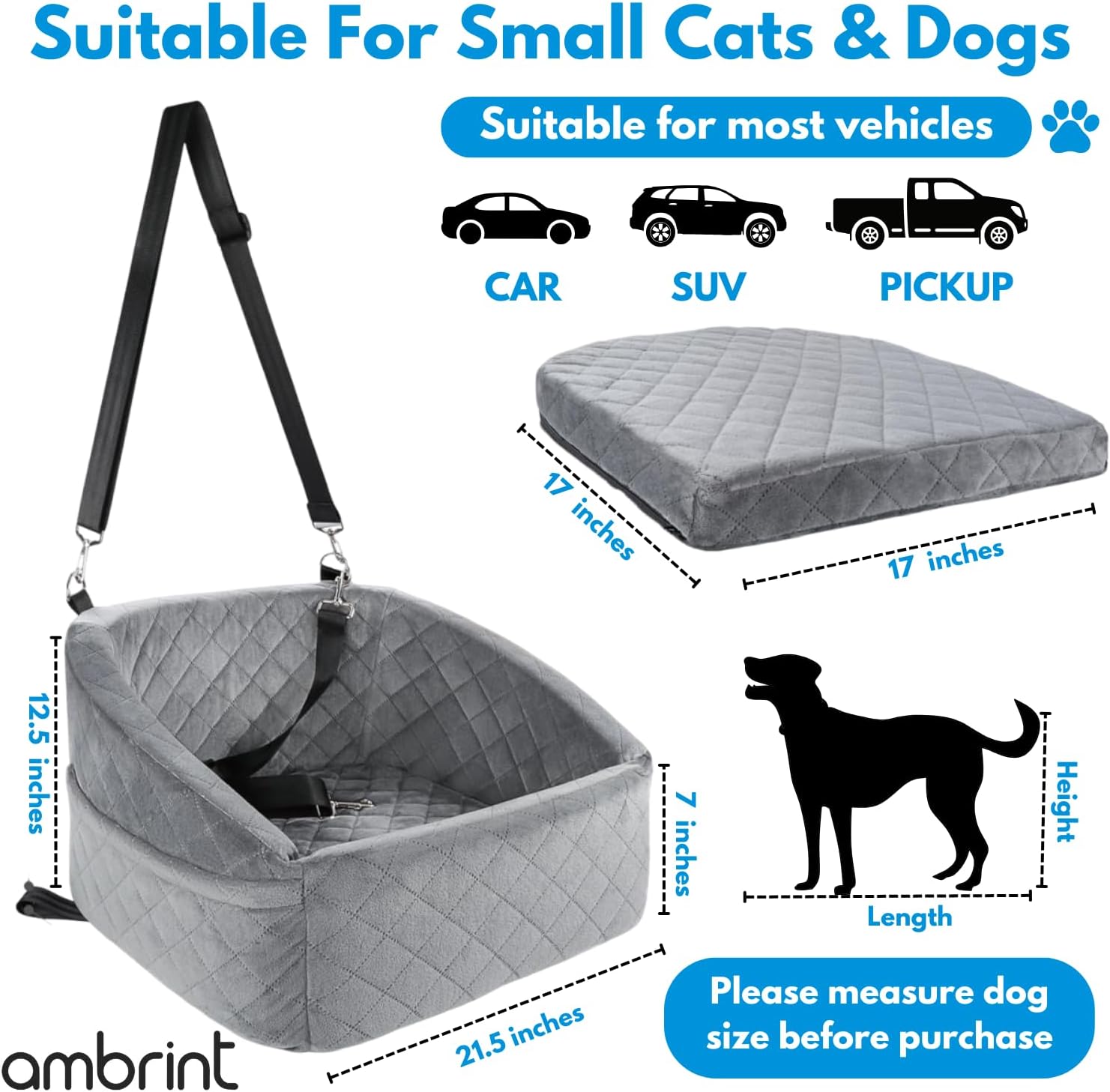 About this item Drive with Confidence – Safety First : Keep your dog secure and relaxed while you focus on the road. Our dog car seat is designed with dual seat belt slots and a safety leash attachment to prevent movement and jumping. Whether it’s a quick errand or a weekend getaway, your pet stays safely in place throughout the journey. Perfect Fit for Small to Medium Pets : Sized 21.5" (L) x 19.5" (W) x 12.5" to comfortably hold one medium dog or two small pets, this car seat fits most vehicles including cars, SUVs, and trucks. It offers a personal space for your dog during rides. ideal for pets up to 30–35 lbs that love to stay close while you drive. Comfort That Eases Travel Stress : Crafted with high-density memory foam, and ultra-soft fabric, this seat helps reduce road bumps and keeps your dog calm and comfortable. Ideal for pets who get anxious in the car, it creates a familiar space that feels like home, even on the go. More Than Just a Dog Car Seat : With side storage pockets and a versatile design, this seat also works as a pet travel bed for use at home, outdoors, or in a tent. Lightweight and easy to move, it’s perfect for pet owners who love to take their dog everywhere they go. Effortless cleaning with detachable design : Ambrint dog car seat for medium sized dog is designed to make cleaning effortless. Simply unzip the bottom to access and remove the sponge, which separates easily from the fabric cover. Toss the cover into the washing machine for a thorough clean, ensuring your dog car seats for small dogs remain fresh and hygienic for every journey. › See more product details