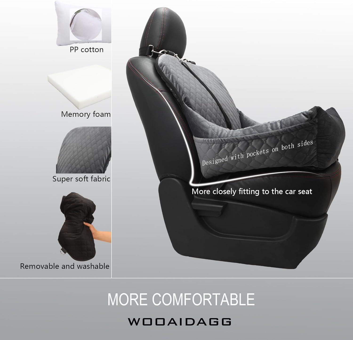 About this item Comfortable:Wooaidagg dog seat made in ultra-soft short plush fabric and filled with PP cotton and memory foam,our dog car bed design ensures a snug fit with your car seat,we dog car seat ensuring their utmost comfort and reducing anxiety and fatigue Safety:The bottom and backrest are crafted with non-slip fabric,along with a seatbelt channel for added stability,adjustable shoulder straps and dog leash provide multiple layers of protection Washable:Wooaidagg comfy car dog seat fully removable and washable design is not only easy to clean but also effortless to reassemble after washing,thanks to our robust sewing techniques,comfy dog travel car bed for backseat Size:The dog car seat overall dimensions are 19" (L) * 19" (W) * 20" (H), making it suitable for all small pets and some medium sized ones.It's compatible with various car models and seamlessly fits both front and rear seats Post-Sales:If you have any questions or concerns about this dog car seat,please don't hesitate to contact us.We are committed to providing excellent service for you and your furry companion › See more product details