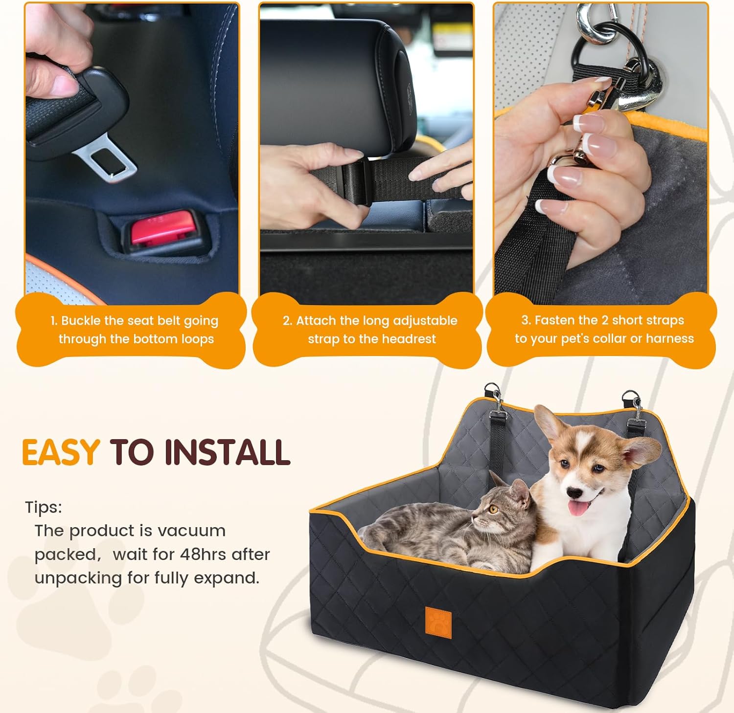 About this item COMFORT&DURABLE DOG CAR SEAT:Made with warm&soft plush fabric and thick&quick rebound sponge padding, this dog seat for car with warmth, comfort, and durability feature provides great support for your pet and reduce the impact of the road bumps.They will not be afraid when the car brakes or bumps. This dog booster car seat keeps your dog calm and relax, while the non-slip bottom and 3 straps keeps everything stable and secure. A smoother ride for your dog means less stress for you!TIPS:THE PRODUCT IS VACUUM PACKED. AFTER UNPACKING, ALLOW THE PRODUCT TO WAIT FOR 48 HOURS TO FULLY EXPAND. SAFETY DOG BOOSTER CAR SEAT:This dog seat Let your pup enjoy the scenery with two booster cushions (1.5'' and 4.33'') to choose from, this dog car seats giving them a better view out the window. With three adjustable straps:one long strap for car seat and two adjustable safety leashes that can be attached to your dog's harness to prevent them from jumping out the window,while a non-slip bottom provide a comfortable nap during the trip. LARGE DOG CAR SEAT:Sized at 29.5’’ x 20’’ x 18.4’’, this dog car seat large size dog comfortably fits medium to large dogs up to 55 lbs or two small pets under 30 lbs. (NOTE:PLEASE MEASURE THE LENGTH OF THE DOG AND THE WIDTH OF THE CAR BACK SEAT BEFORE PURCHASE)This puppy car seat easily fits in most vehicles - saloons, trucks, or SUVs, so whether in the back seat or trunk, your furry friends have their own roomy, comfortable spot to snooze in on every road trip. MULTI-PURPOSE PET SEAT:More than just Use as a dog Car Booster Travel Seat,it doubles as a cozy dog beds large sized dog or sofa at home or outside as Camping dog bed. Simply remove the straps, and it turns into a comfortable dog bed for your pet anywhere. With two large side pockets for storing food, toys, or accessories, it’s the perfect all-in-one solution for both home and travel use. REMOVABLE AND WASHABLE:The car dog bed detachable and washable makes cleaning simple. Just unzip the cover of the , remove the sponge, and toss the cover of dog bed for car back seat in the washing machine for a fresh and clean seat after any mess. Simple surface dog hair cleaning can be done with a vacuum cleaner.However, please note that the inner foam is not washable. › See more product details
