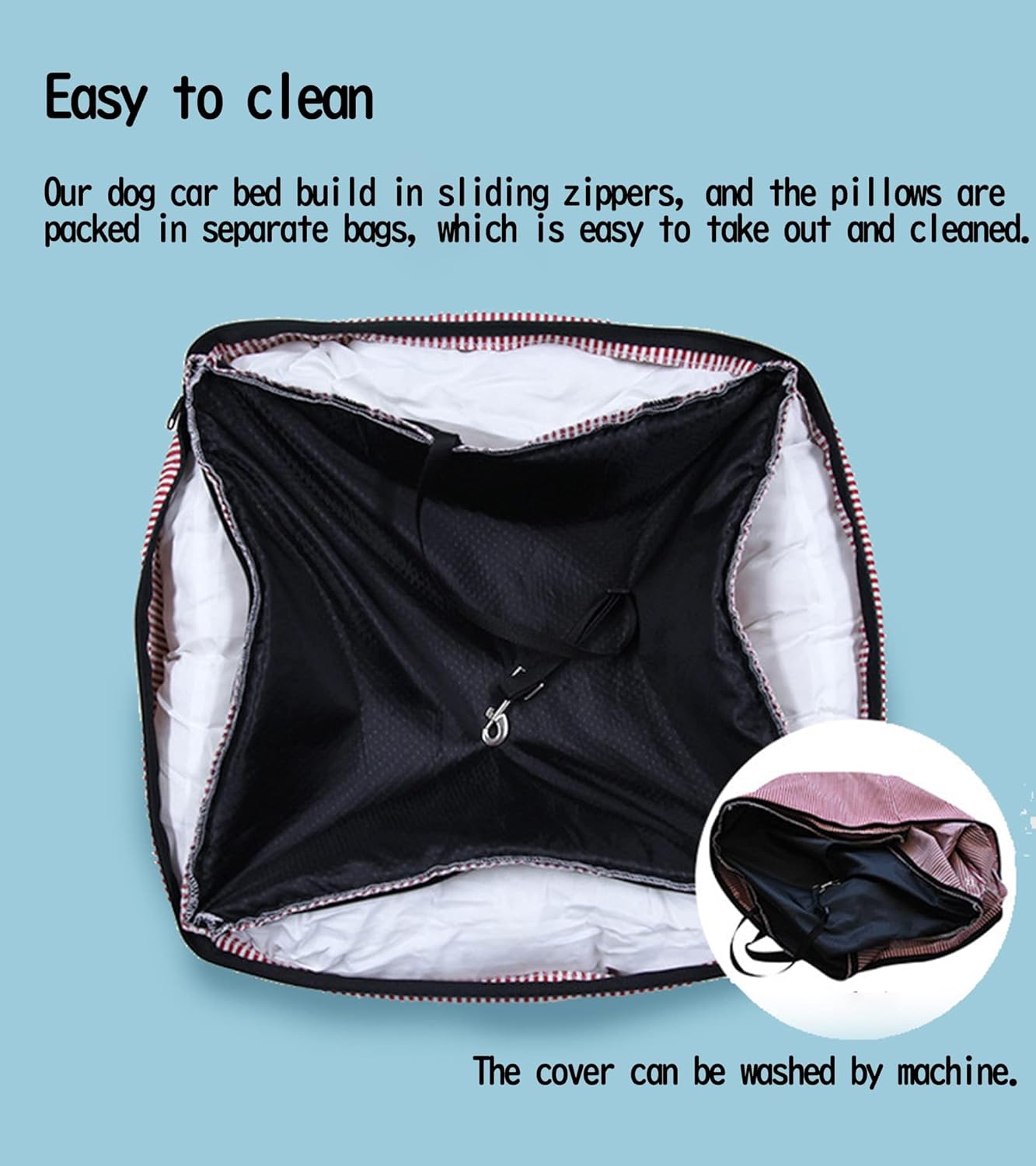 About this item 【Durable and Large Capacity for Storage】The Dog Car Seat uses waterproof Oxford cloth, the stitching is very firm, and it is durable, waterproof and scratch resistant!There are large storage bags on both sides of dog car carrier. It's very convenient for you to store pet daily necessities also tidy and save your space. 【Fully Detachable and Washable】Our dog car bed build in sliding zippers, and the pillows are packed in separate bags, which is easy to take out and cleaned. The cover can be washed by machine. 【Adjustable Leash and Against-Slip Rubber Bottom】You can adjust the length of the strap with buckles to fix the Dog Car Bed on the passenger seat. Besides, the against-slip rubber dots on the bottom can increase the stability of the dog bed. 【Easy to Install】Adjustable buckle design, the pet booster seat for car can be installed easily. Just fix the buckle to the top and back of the seat and adjust the length of straps. You can install it in both the front and back seat of your car as you like. And it fits most kinds of car seats and car types. 【Suitable Size】: The size of dog car seat is 21.7" x19.7" x12.8" (L x W x H). There is lots of space to get comfy. On the dog car seat, your pets feel safe and there is excellent support for head, hips and bones.Note:Please kindly measure your dog's size before purchasing. This dog car seat is suitable for small dogs and some media dogs, back length less than 15.7 inches and weight less than 35lbs. › See more product details