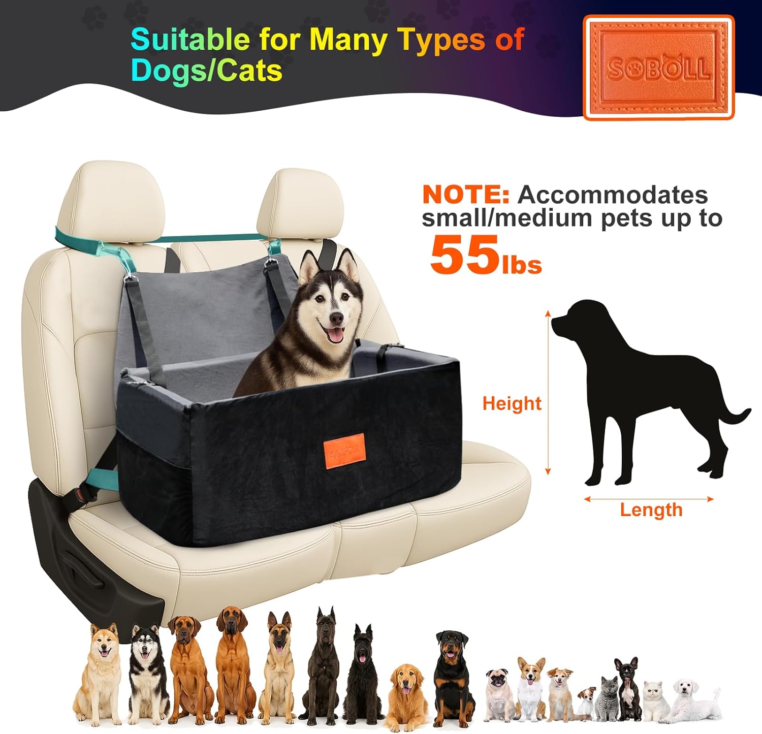 About this item Safety & Comfort: Soboll pet booster seat provides maximum protection and comfort in the back or front seats. Adjustable premium buckles add an extra layer of security and provide a secure fit. The innovative removable design sets it apart from the competition and provides your pet with extra protection in an emergency. Sturdy Waterproof Nylon: Our Pet Booster Car Seat is made from sturdy waterproof nylon with double stitching reinforcement, no more seams ripping and tearing in the washing machine. The dog car seat is very comfortable and fluffy, making it easy for your pet to lie on it, and the removable structure makes it easy to clean and replace accessories. Foldable,Durable,Waterproof : Easy to assemble and store, foldable and does not take up space. Removable plates make cleaning easier. When not in use, fold up like a board. The waterproof material also makes cleaning easier, making it ideal for taking your pet with you on long trips. Large storage pockets on both sides provide ample space to store your pet's daily supplies. Product Size: 16.3*11*8.8 inches, suitable for small pets, Poodles,Corgis,Yorkies, Chihuahua, Mdachshund,Bulldog,Pomeranian etc car seats. Suitable for small pets (dog or cat) weighing 15-25 lbs. We made some improvements to this pet car seat based on buyer feedback and research data from our Pet Institute. Replacing the side support bars makes it stronger, adding seat back straps makes it safer, and provides convenient retractable seat belts. Perfect after-sales Service: We are committed to in-depth research and understanding of pets' behavior, health, social interaction and relationship with humans. We have sufficient sample data on animal bodies and focus on the characteristics and needs of different pet species to produce products. We provide 360 manufacturer maintenance services and online help services, which can help you solve any product problems at any time, please rest assured to order › See more product details