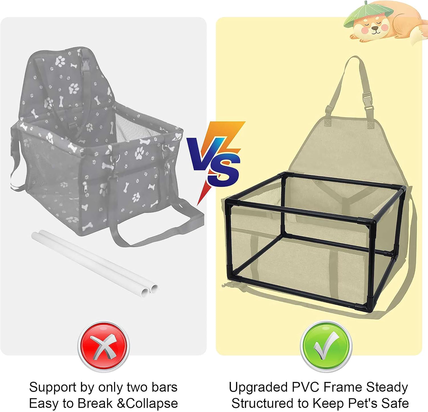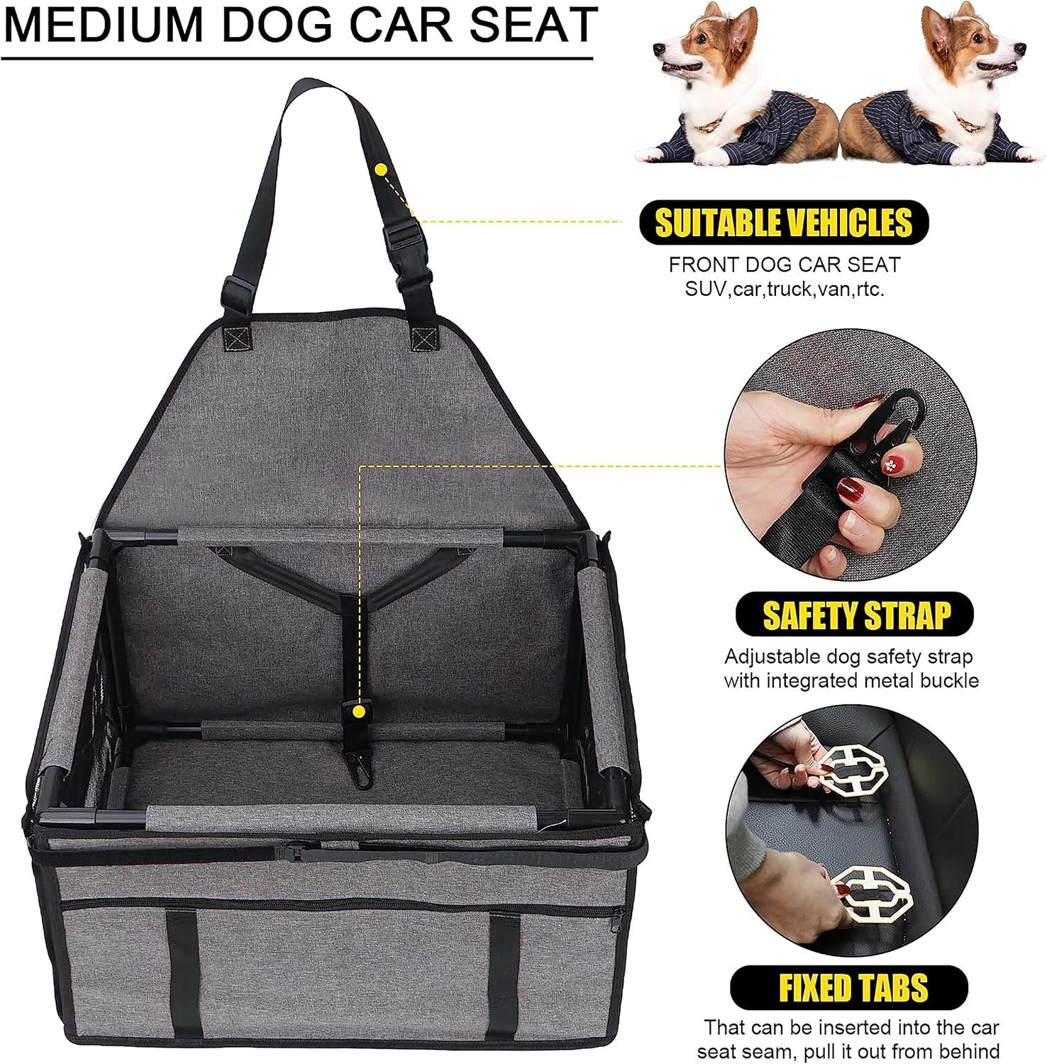 About this item Size Selection: 18.9"L x 15"W x 10.6"H. The dog car seats is suitable for small to medium dogs up to 20 lbs and suggest to measure your pet body lengths;Idea for the front seat of cars, SUVs, trucks;keeps your pet safe when driving Safety First: The pet car seat offers your pet to stay comfortable and secure without disturbing you when you driving;The adjustable dog leash with metal clip-on can be hooked to the dog's harness to prevent pets from jumping out;Enjoy a pleasant journey now Mesh Window and Pocket Design: Features durable mesh on both sides that is tear-resistant,Allows your pets breathe smoothly and see you at any time,making your pet more reassuring;It also has a front storage pocket for your pet's daily necessities, saving space Durable Waterproof Material: Crafted from high-quality, thick oxford cloth with a waterproof finish to keep your pet dry and comfortable, minimizing cleaning hassle; Features a PVC frame for stability, preventing collapse Fully Detachable and Washable: This puppy car seat is easy to install with adjustable webbing,buckles and fixed tabs to secure the seat in place; Features sliding zippers and a detachable frame for easy storage and cleaning › See more product details