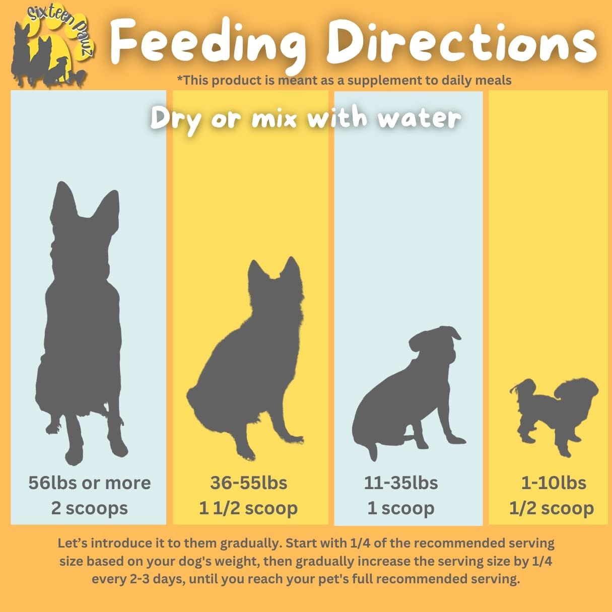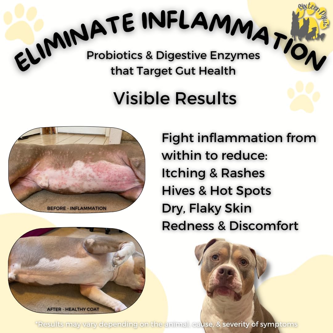 Sixteen Pawz Probiotic & Digestive Enzyme Blend is a dietary supplement made for dogs & cats, for all ages, breeds, & sizes.Introducing our pure and potent probiotic and digestive enzyme supplement for dogs, specially formulated to address a range of health concerns without any unnecessary additives. Crafted with simplicity in mind, our all-natural blend offers allergy relief, digestive support, and immune system benefits in one easy-to-administer solution. By promoting a healthy gut flora balance, it helps alleviate allergy symptoms, improves digestion, and bolsters immune function. Give your dog the gift of holistic wellness with our straightforward and effective probiotic and enzyme supplement, free from any extra ingredients.Our formula is a basic 3 in 1 blend of probiotics, prebiotics, & digestive enzymes to ensure your pet gets the most out of their meals. Straight from production to packaging without adding artificial flavoring, additives, or preservatives, you can expect the most straightforward ingredients made right here in the US. No surprises and no worries about what your fur baby may be consuming. Our flavorless & odorless formula is great for those with sensitive stomachs & the pickiest of eaters. Our formula supports:- Allergy related symptoms like itching, hives, rashes, bumps, & hot spots- GI discomfort like diarrhea, constipation, gas, & bloating- Inflammation causing GI upset, skin irritation, & joint pain- Yeast Overgrowth & infections, combat paw chewing & itchy ears - Anal gland issues & bad odor of the body & mouth- Skin & coat health for those suffering from dry skin & hair loss- Promotes healthy weight gain, absorption of nutrients, & breakdown of hard to digest food. - Improved mood, energy, mental health & much more! This product is not meant to diagnose, treat, or prevent any illnesses. It is meant as a dietary supplement only. Results WILL vary amongst every animal. This product may work best alone or in combination with other dietary supplements. Please consult with your family vet to determine what is best for your pet