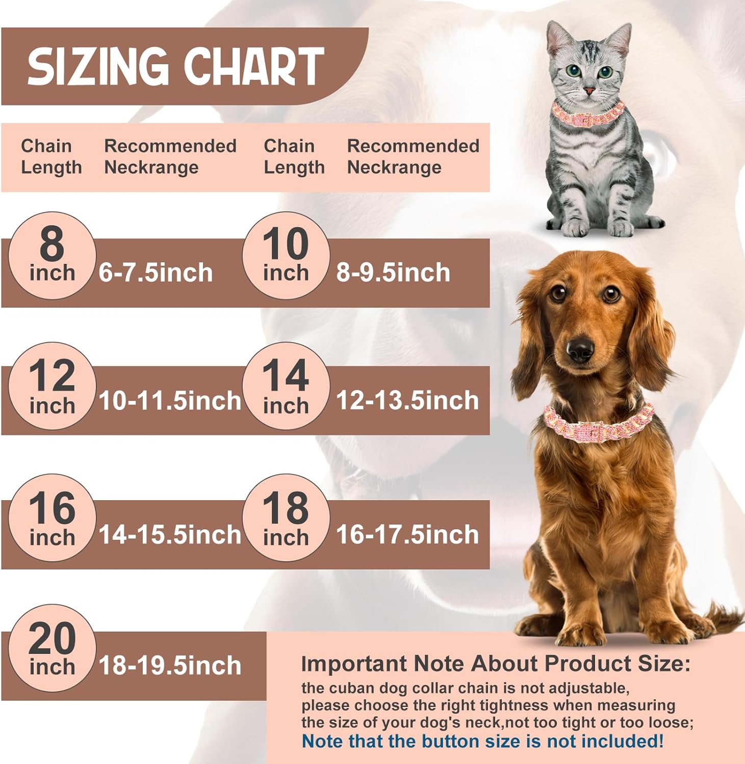 About this item Pink Diamond Dog Chain Collar: This puppy collar of elegant color is decorated with hand-set zirconia diamonds, stylish, cute, cool. Letting your cats or dogs lovely and attractive and receiving more attention and favor during walking or party. Dog Collar with Safety Buckle Lock: The pink dog chain collars are designed with a new double button push buckle for dog leashes, easy to lock and unlock, hard to pull away. More convenient and safe for your pet during walking, playing, training, traveling, jogging. Strong Dog Necklace: The rose gold dog collar chain is made of quality hypoallergenic copper alloy with polished surface, sturdy, heavy duty, hard to break and fade, chew proof, lead-free, nickel-free, friendly to skin and hair. Cat Chain Pet Crystal Collar Jewelry Accessories: The dog chain necklace is great for small, medium, large pets such as chihuahuas, rabbits, cats, puppies, dogs to wear or as a gift at party, birthday, holiday,etc. Lightweight and portable, not be a burden on your pet's neck. Dog Link Chain Training Collar: 1pcs dog pink chain collar in total, approx. 0.47’’L x 18’’ W. Suitable for small pet, neck around 16 to 18 inch and weighing up to 25 pounds. So pls check the size of your pet before purchasing. If you want to oversize effect, adding 1 to 2 inch on the basis of the your measurement. › See more product details