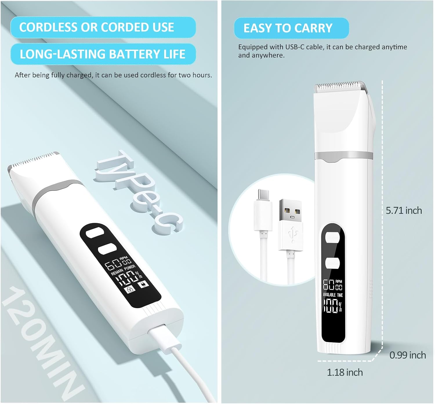 About this item All-in-One Dog Grooming Kit: The 4in1 pet grooming kit comes with 3 trimming heads and 1 nail grinder. The dog hair trimmer can effectively trim the hair on the body, face, ears, claws, and buttocks of dogs, cats and other pets, as well as safely polish pets' paws. The dog trimmer is also equipped with 4 guide combs, making it easy to control the length of pet hair and create the ideal trimming effect. This dog clippers meet all the needs of full body trimming and nail grinding Low Noise and Powerful Dog Clippers For Grooming: Our dog trimmer for grooming features a powerful motor and low-noise technology to ensure that your pet is not scared during use, while also safely and efficiently trimming pet hair and grinding paws, giving your pet a comfortable grooming experience Cordless Dog Grooming Clippers: The dog shaver is easy to carry and can be used cordless and corded. The dog paw trimmer with a USB-C cable for convenient charging anytime, anywhere. The cordless design allows you to move freely in any direction to solve the hard-to-reach areas. After being fully charged, it can be used cordless for two hours. The visible display of the pet clippers allow you to know the remaining power, avoiding the embarrassment of running out of battery during use 2-Speed Pet Trimmers for Dogs: The dog razors for grooming offers two speeds of 6500RPM and 5000RPM, which can be easily changed by pressing different buttons. The shaving speed is 5000RPM, and the nail grinding speed is 6500RPM. Our cat hair trimmer is also thoughtfully designed with a locking function to prevent accidental activation Safe and Easy to Clean: Featuring stainless steel and ceramic blades, our dog grooming clippers ensure quick trimming, no pull the pet hair and no hurt the pet’s skin. The blades of dog nail trimmer are detachable and washable, which can be directly rinsed underwater after use, making it easier to clean › See more product details