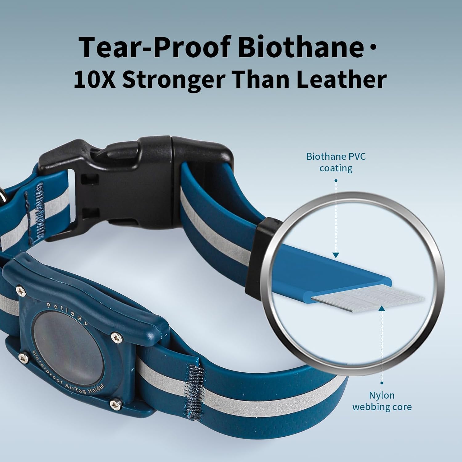 About this item ✅ 100% IP68 WATERPROOF AIRTAG HOLDER - Fully enclosed, dustproof/waterproof AirTag compartment protects your tracker from damage (Apple AirTag not included). Rust-proof metal hardware withstands rain, mud, and swimming ✅ 10X STRONGER & TEAR-PROOF - Reinforced Biothane PVC coating over nylon webbing core creates a collar 10x more durable than leather, resistant to chewing, scratching, and daily wear ✅ ODOR-FREE & 10-SECOND CLEAN - Non-porous Biothane repels mud, slobber, and smells. Wipe clean instantly – no lingering odors! Flexible yet maintains shape ✅ HIGH-VISIBILITY REFLECTIVE COATING - Advanced light-reflective coating (not stitching) ensures clear visibility in low-light conditions for night safety. ✅ ALL-CLIMATE READY & COMPLETE KIT - Includes 1 waterproof airtag dog collar + 1 screwdriver for effortless AirTag installation. Built for adventures: rain, snow, dirt—performance guaranteed › See more product details