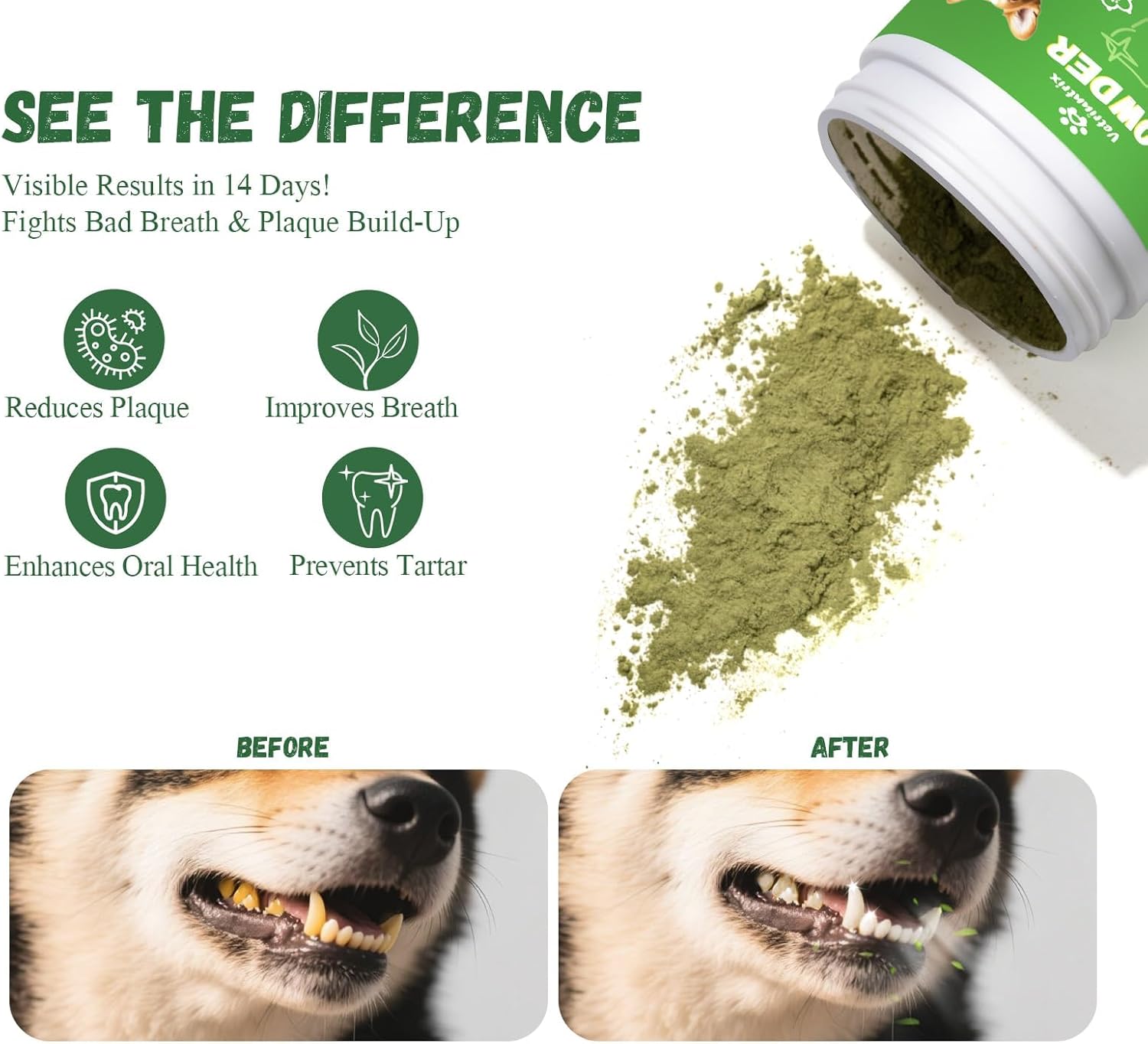 【Works like magic】Neutralizing bad breath at the source for fresher kisses. See visible differences in 2-4 weeks. Stinky breath and plaque don’t stand a chance. 【Dogs love the taste】Picky eaters? No problem. Our tasty formula keeps tails wagging and makes teeth cleaning an easy thing. Keeping dog teeth healthy. 【All-natural & gentle 】Developed with veterinary insights. Safe enzymes + probiotics blend + natural ingredients, Made with 100% plant-based ingredients—just happy, healthy dogs. 【Easy & Affordable Dental Care for Dogs】Skip the brushing hassle! Simply sprinkle our powder on your dog's food daily. Advanced formula uses less product – one bottle lasts months. Keeps tooth clean and breath fresh effortlessly. Saves time, effort, and money! 【Vet-Approved & Safe】 Formulated by expert pet dentists, our product is made with tested and trusted ingredients that meet the highest safety standards. 👉️Any product issues, please contact us via Amazon Message Center. › See more product details